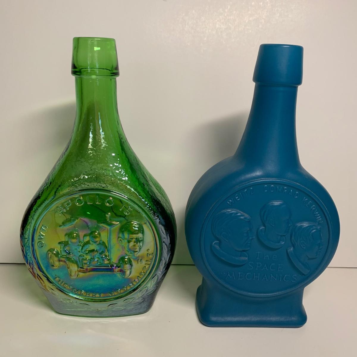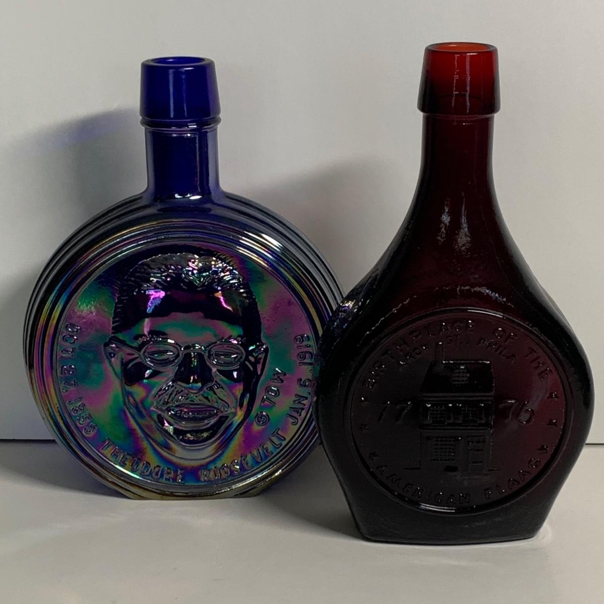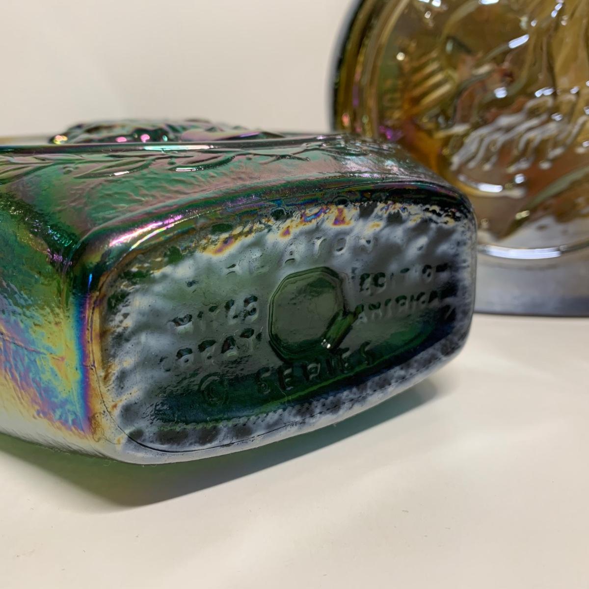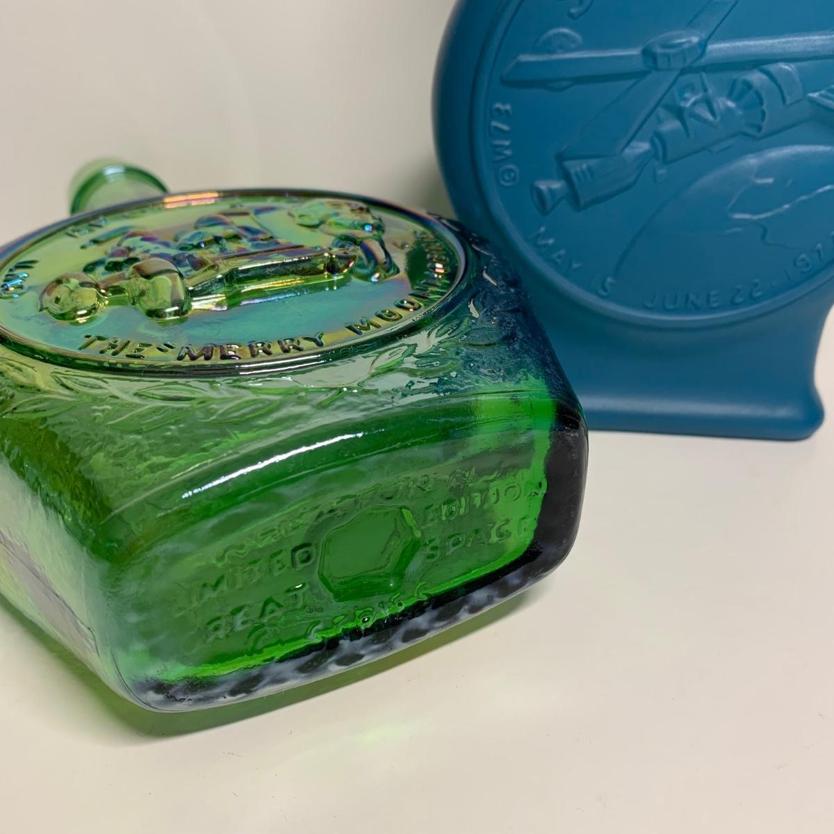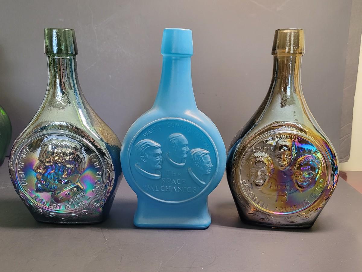 LOT:123: Collection of 6 Wheaton Colored Glass Bottles Featuring Icon Figures and Historical Events - Sky Lab