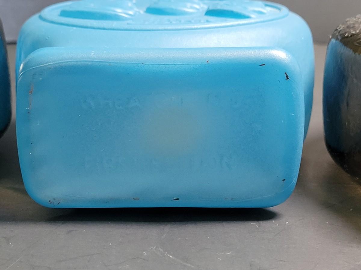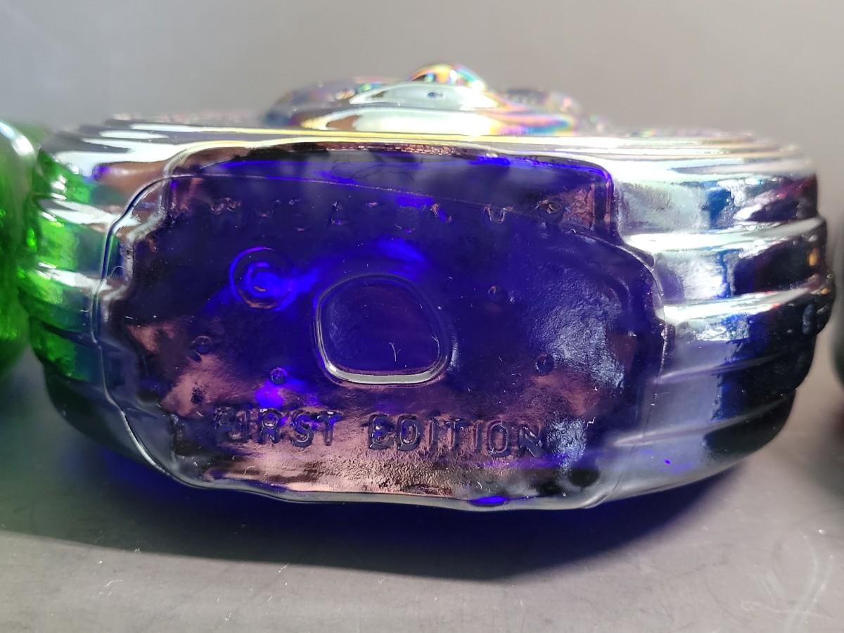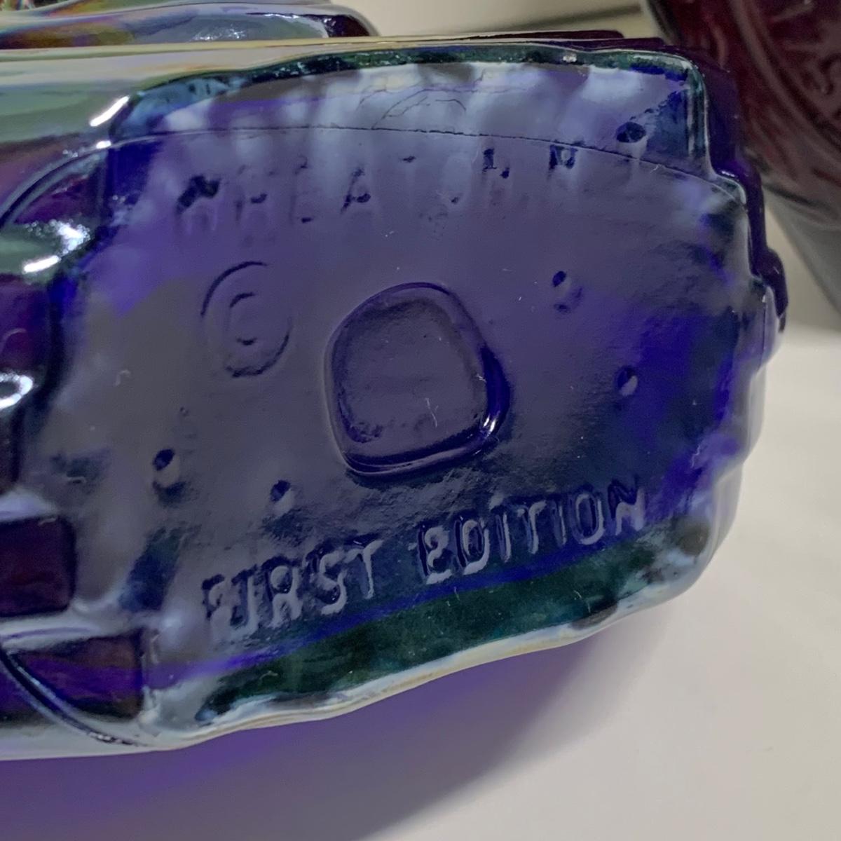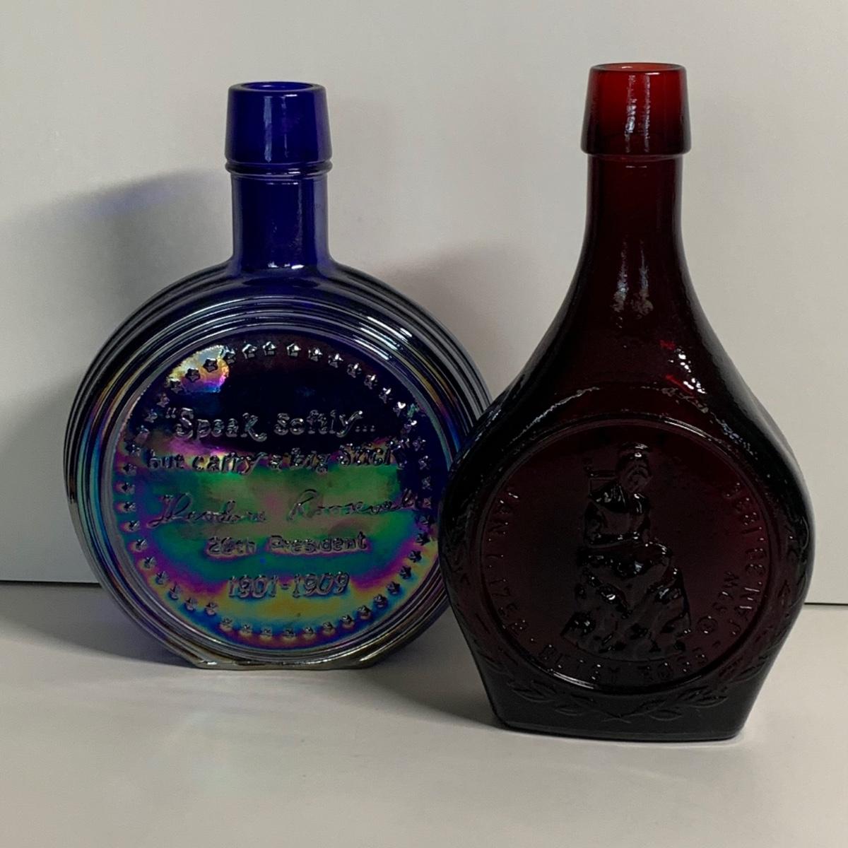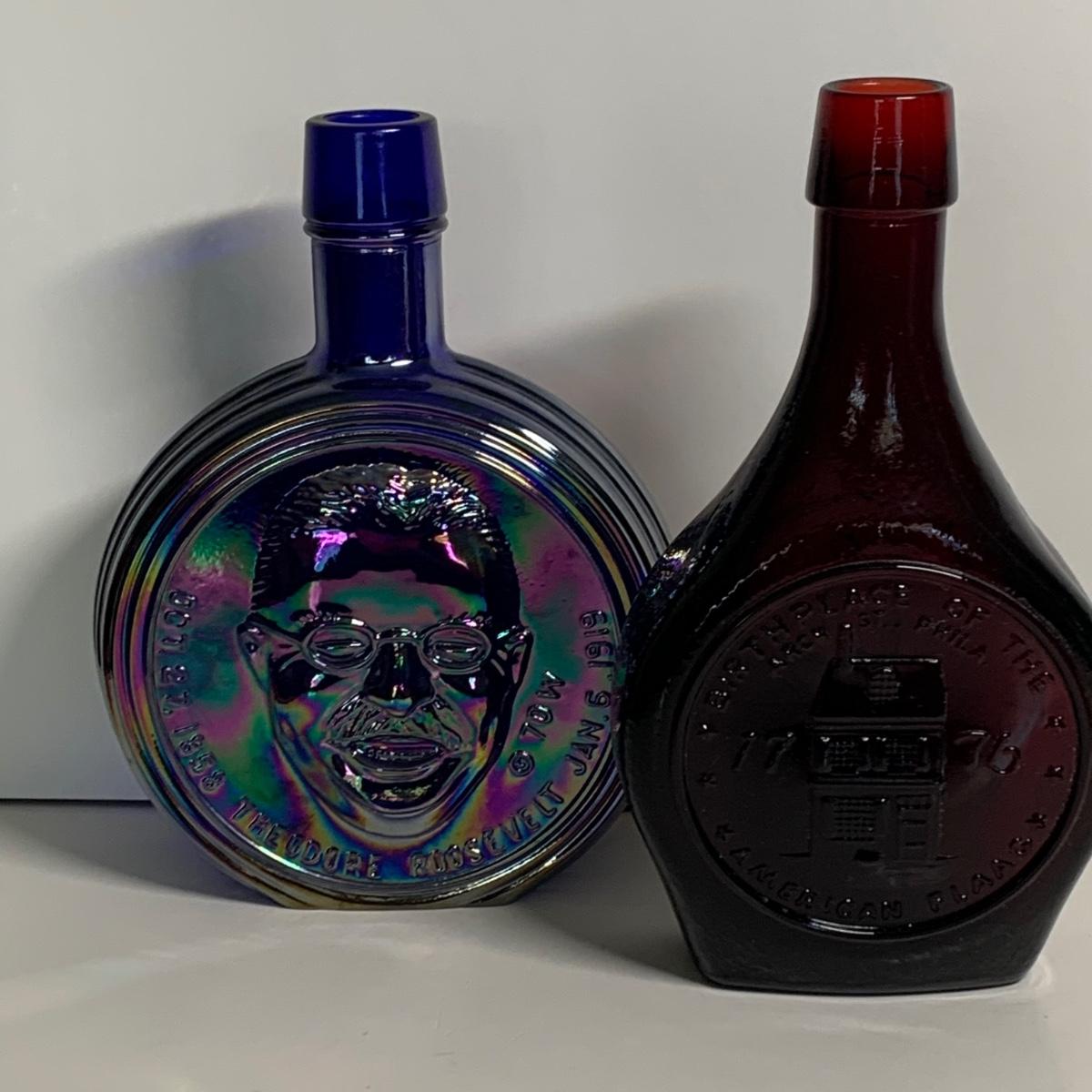 LOT:123: Collection of 6 Wheaton Colored Glass Bottles Featuring Icon Figures and Historical Events - Sky Lab