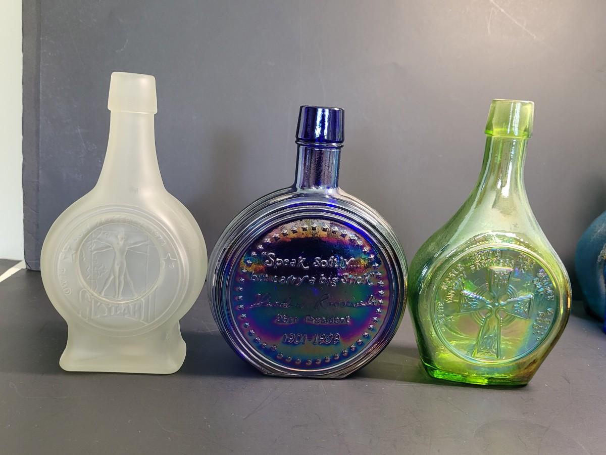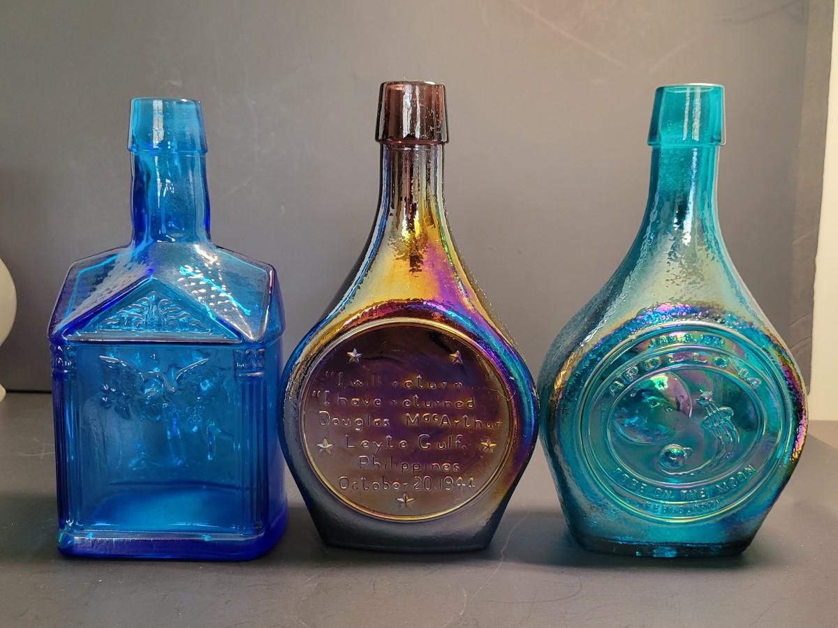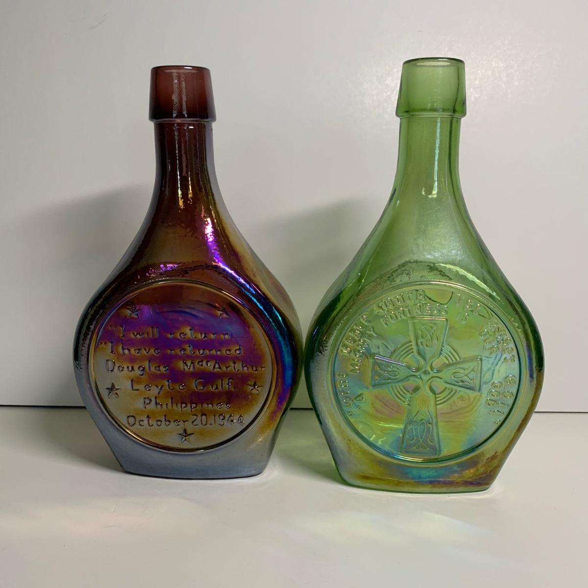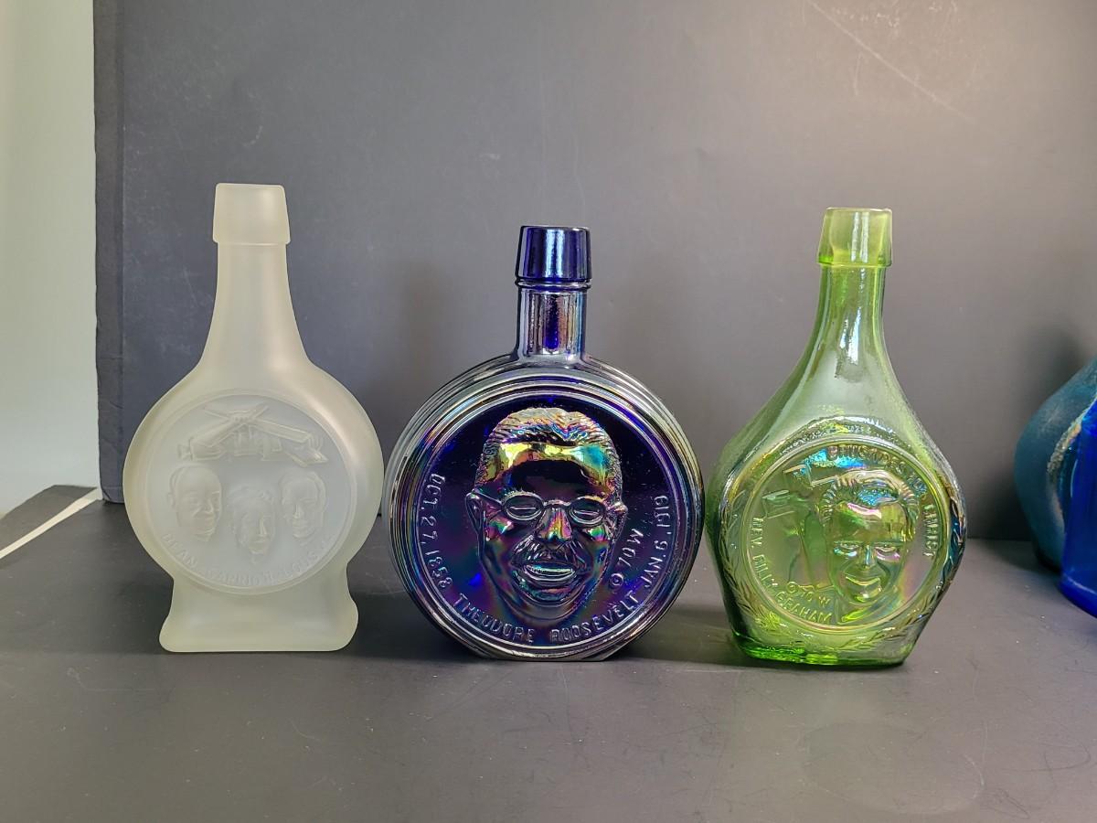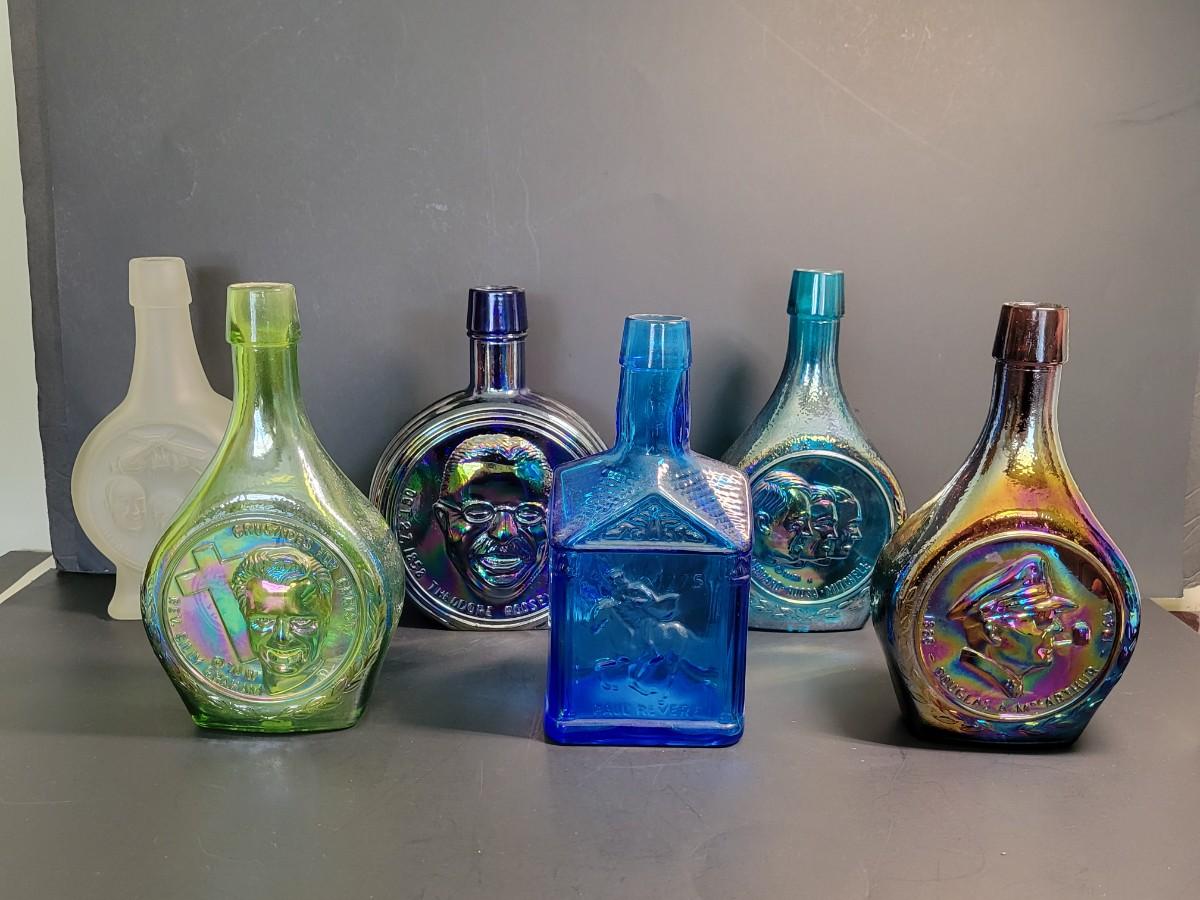 LOT:124: Collection of 6 Wheaton Colored Glass Bottles Featuring Icon Figures Such as Theordore Roosevelt and General MacArtherand Historical Events