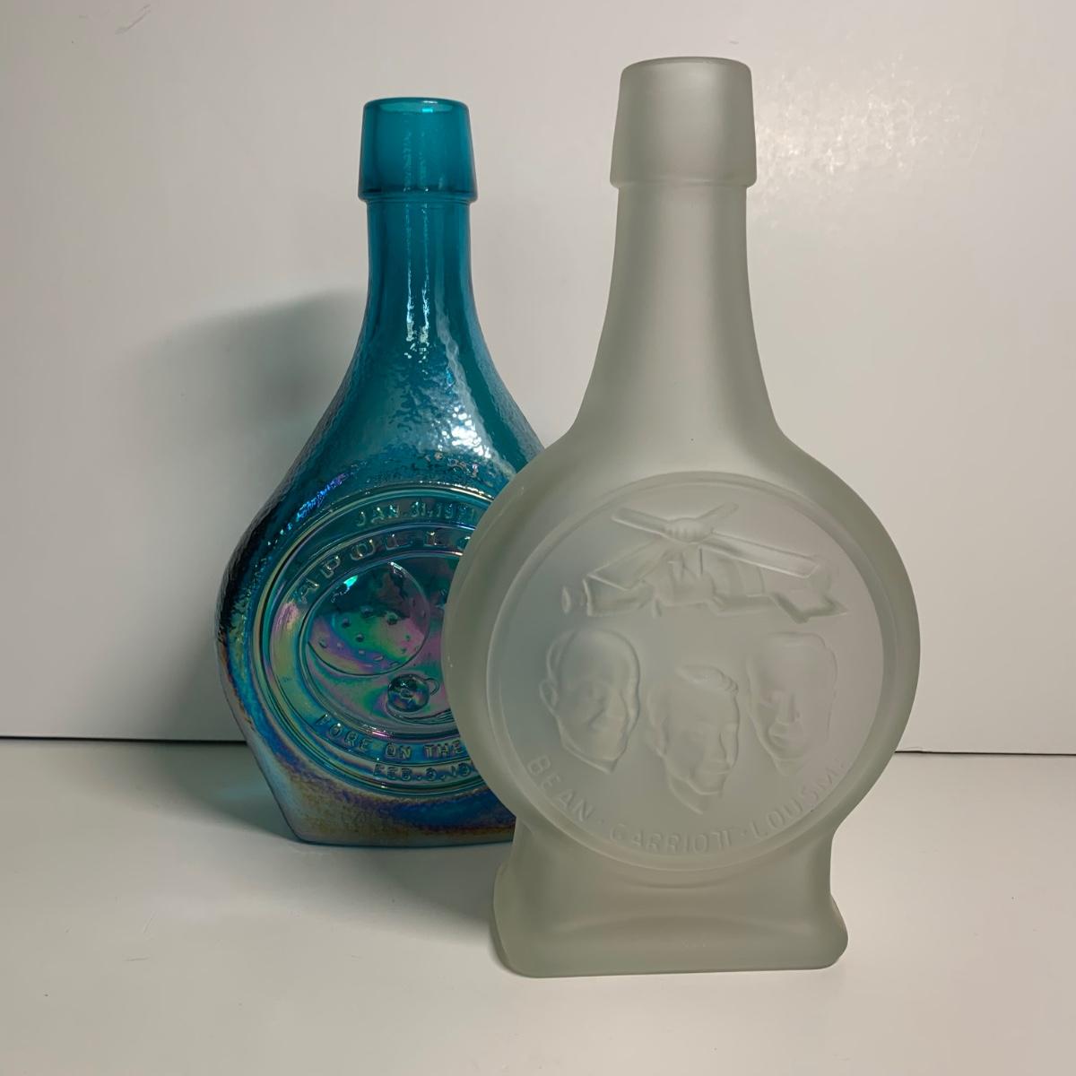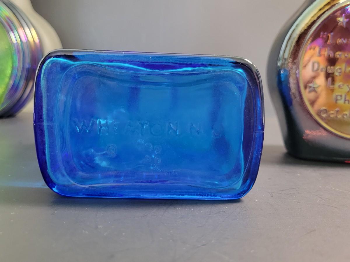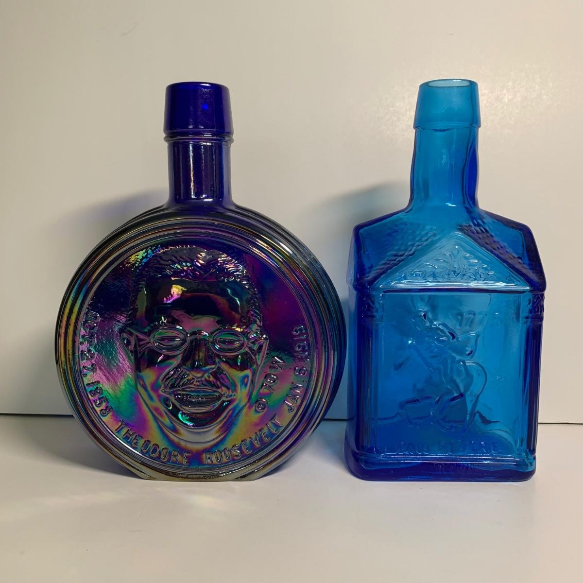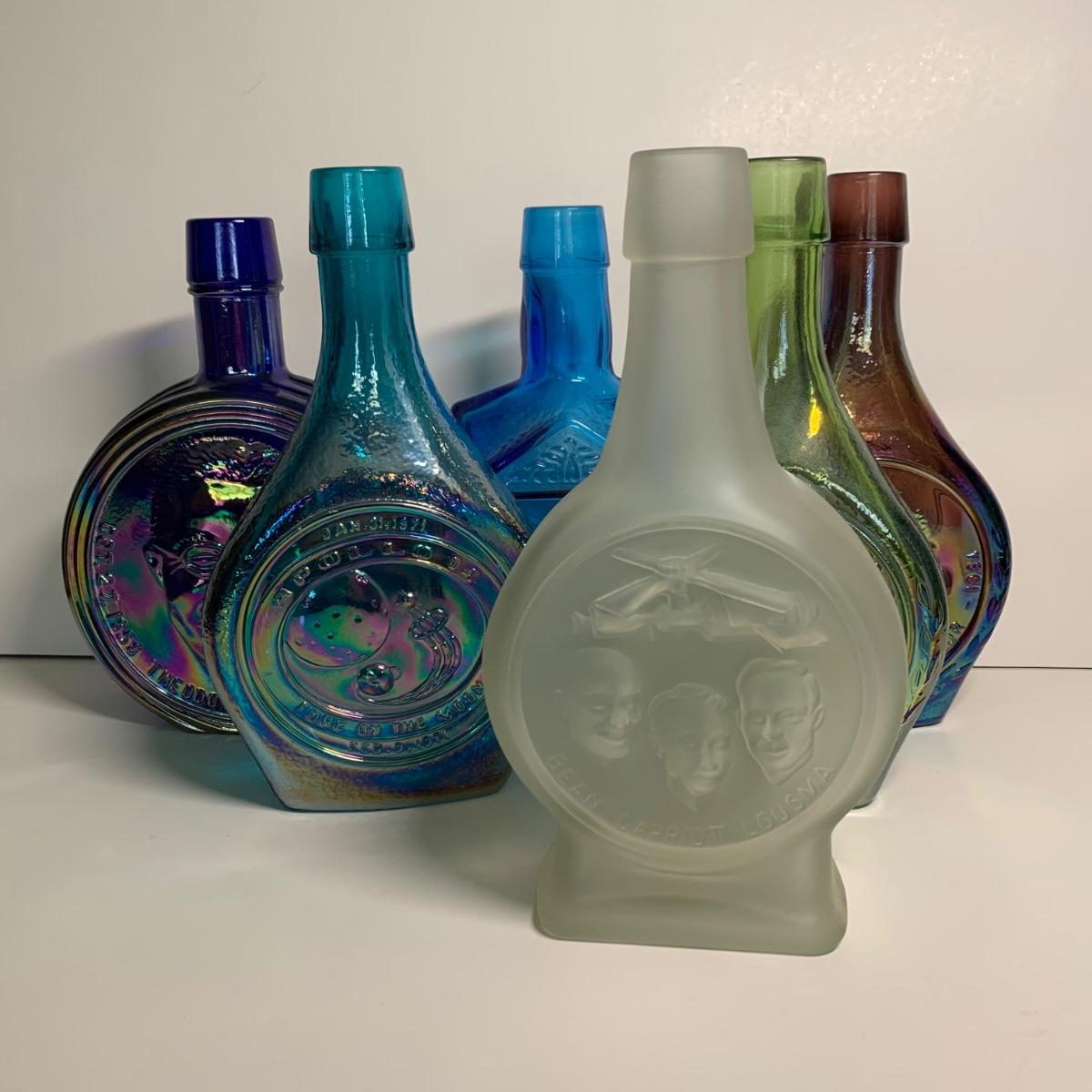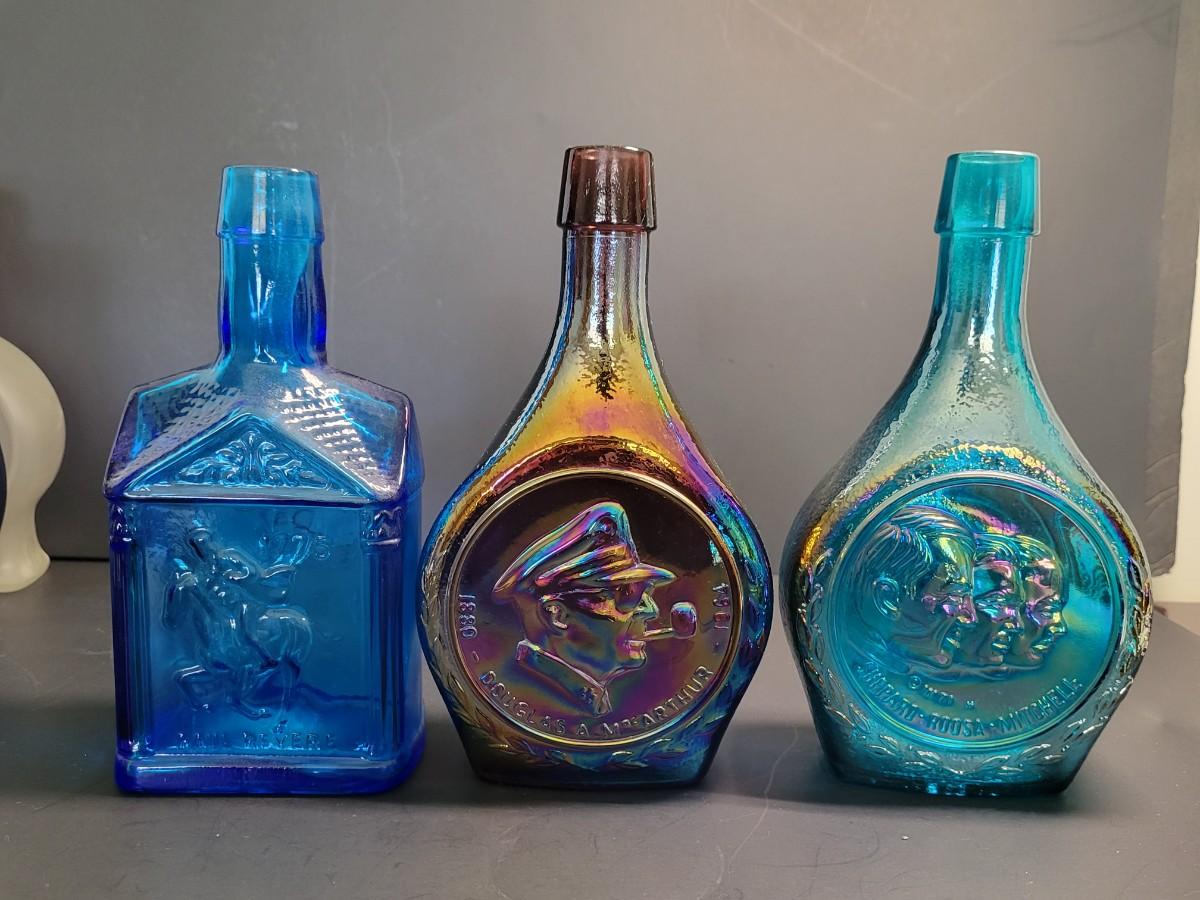 LOT:124: Collection of 6 Wheaton Colored Glass Bottles Featuring Icon Figures Such as Theordore Roosevelt and General MacArtherand Historical Events
