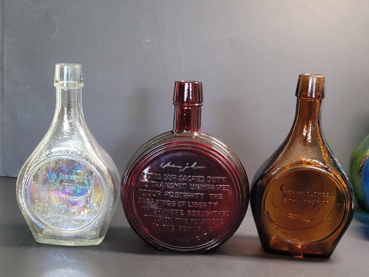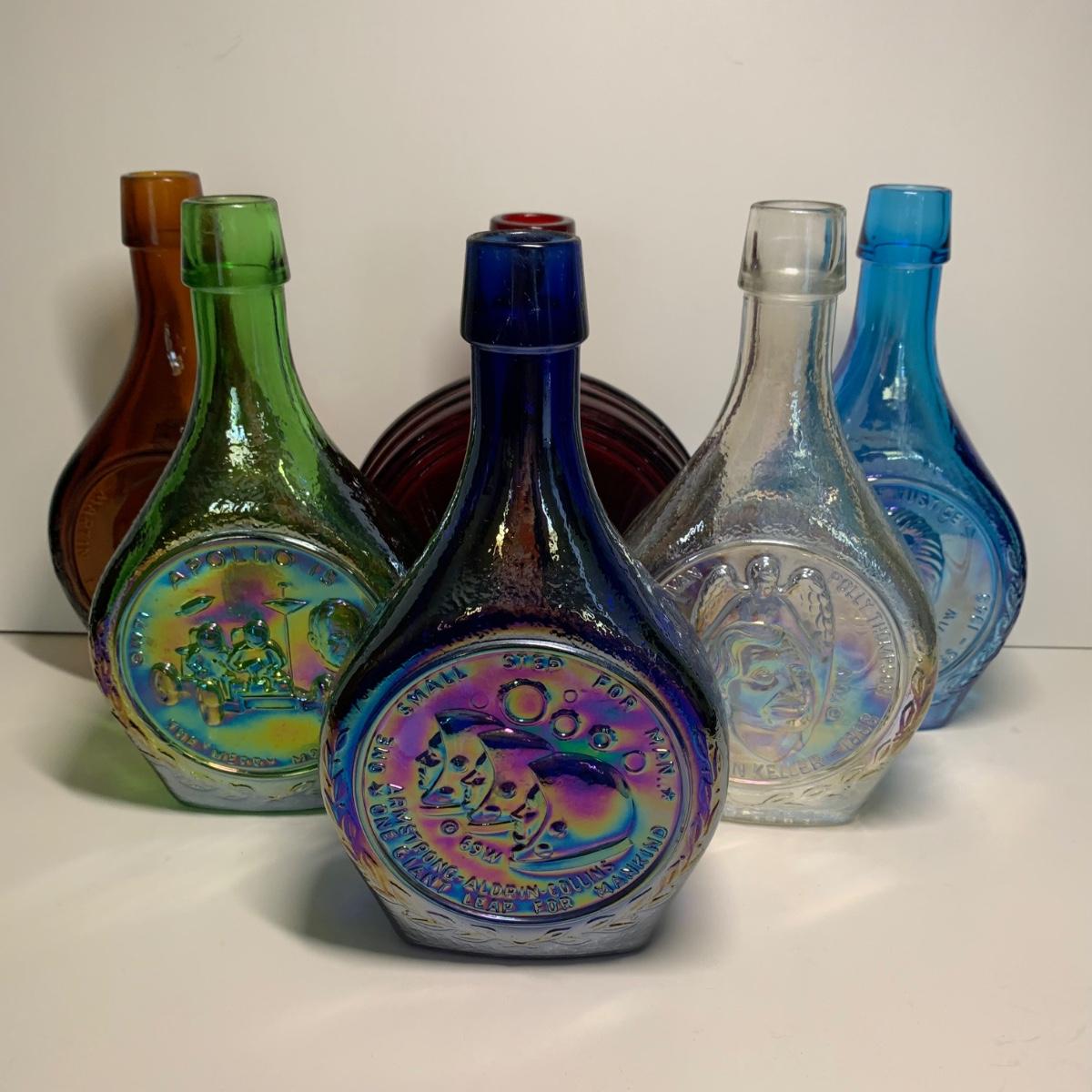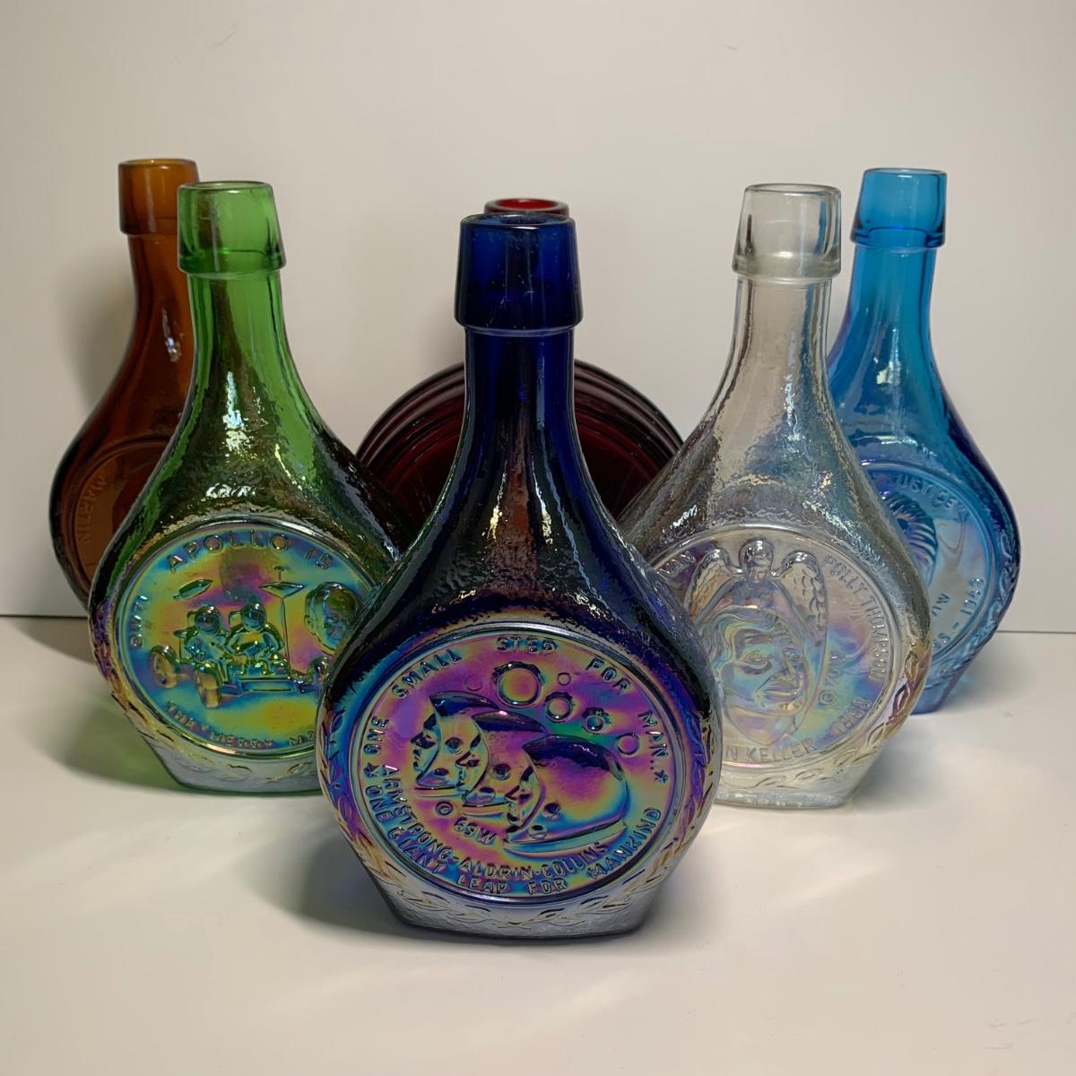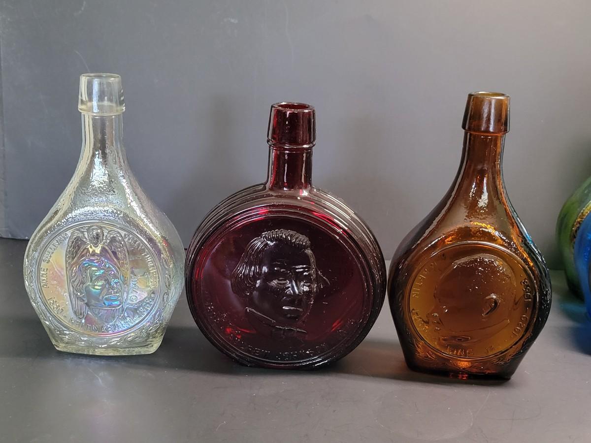LOT::127: Collection of 6 Wheaton Colored Glass Bottles Featuring Icon Figures and Historical Events