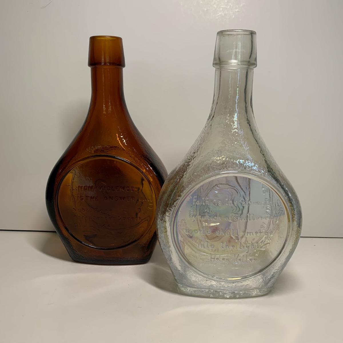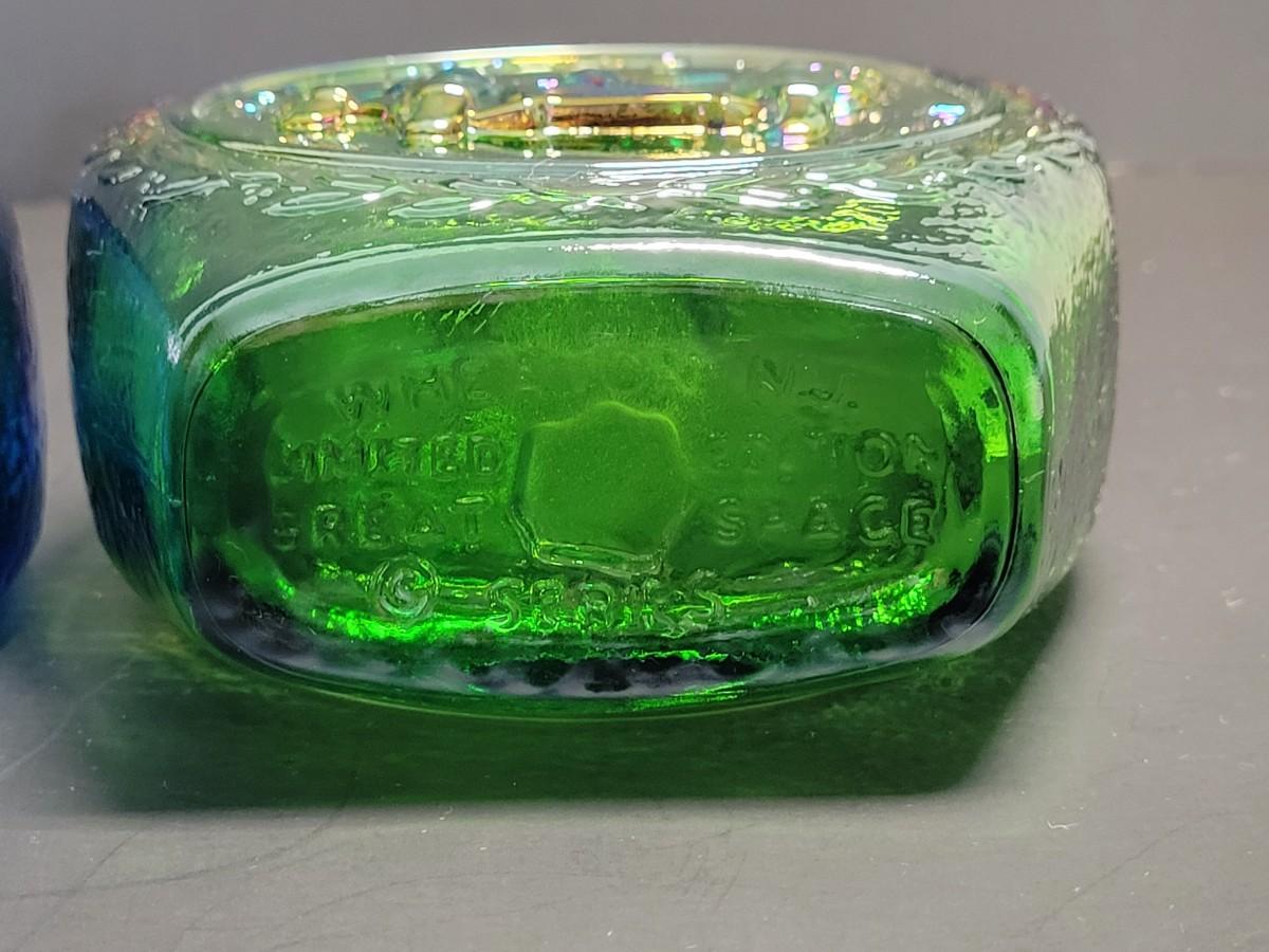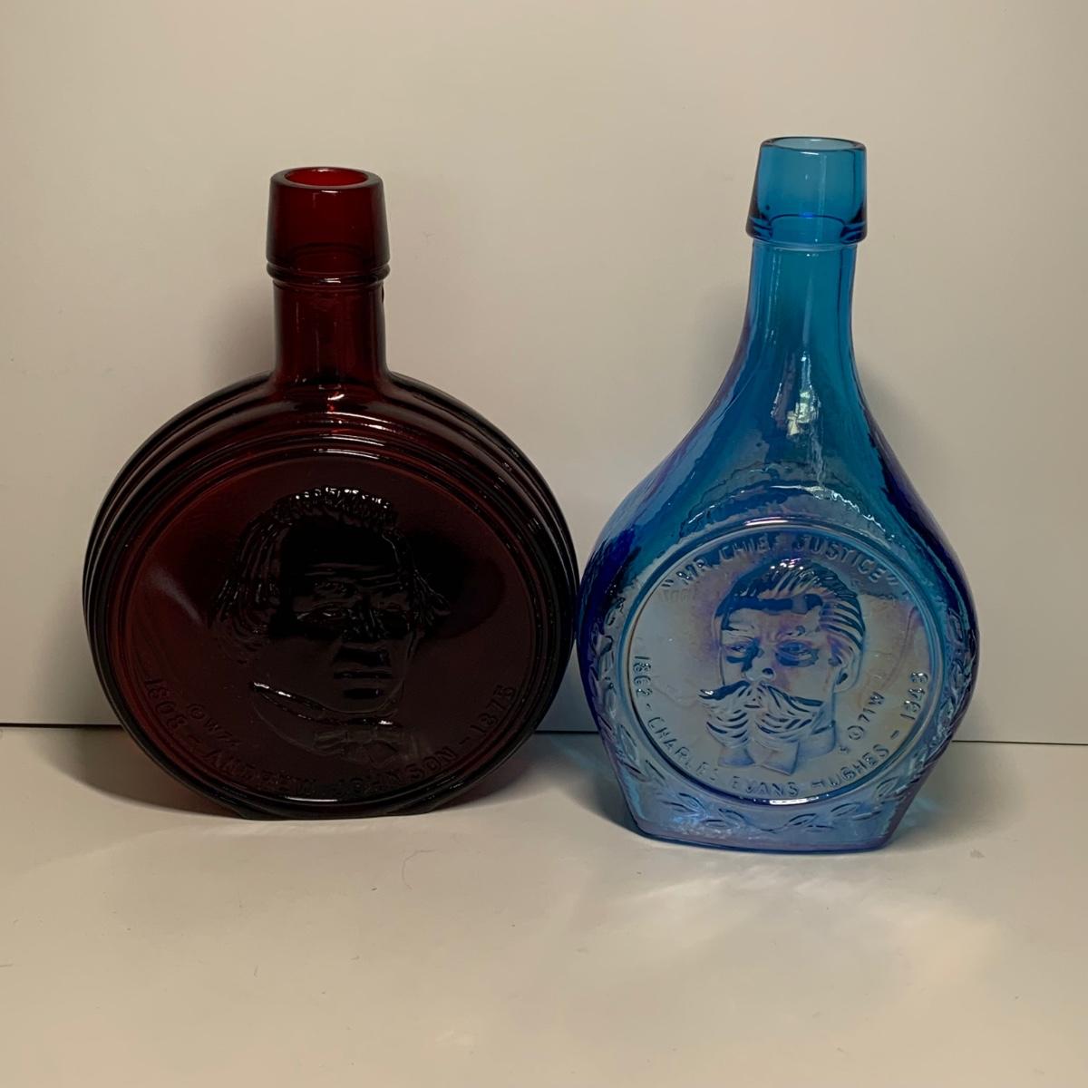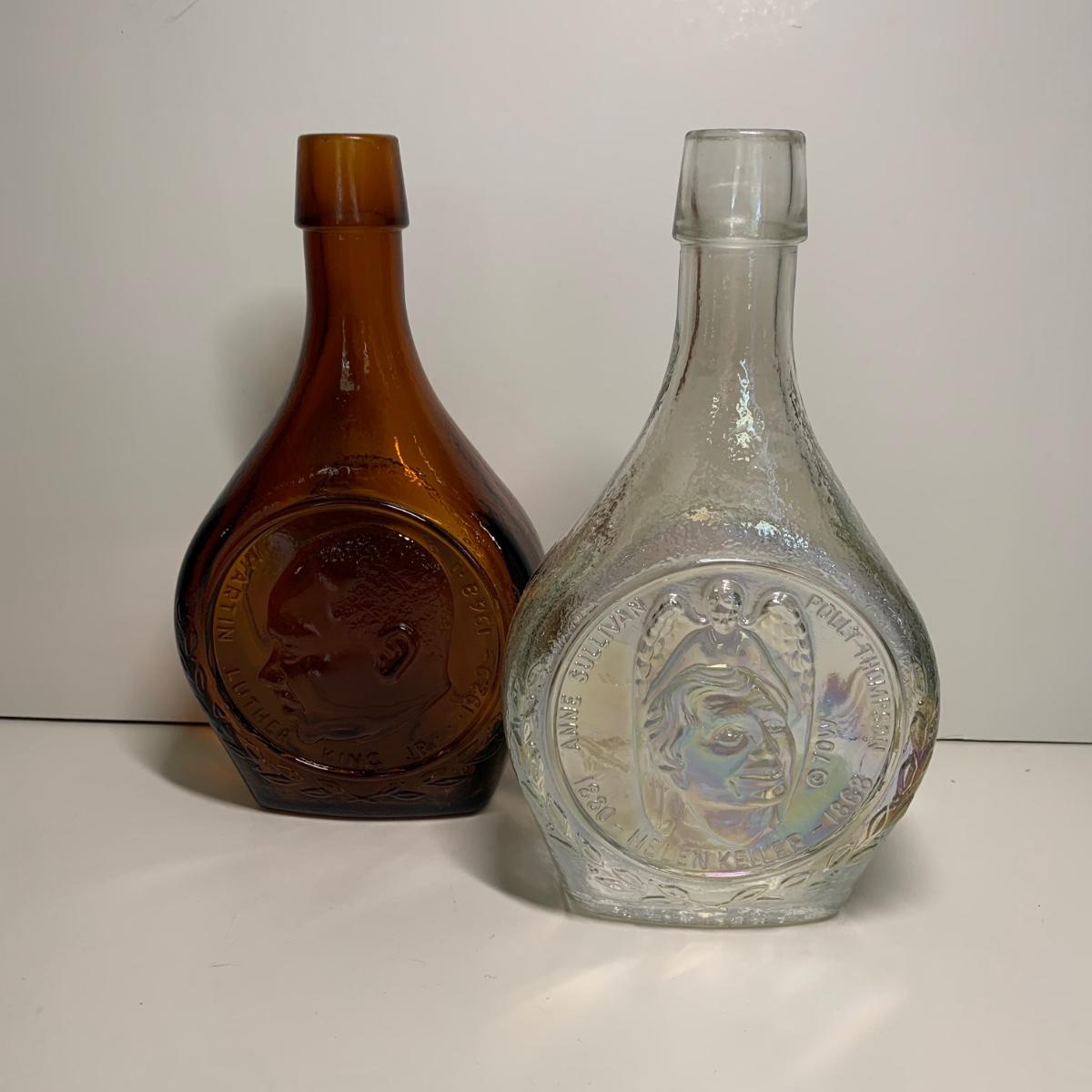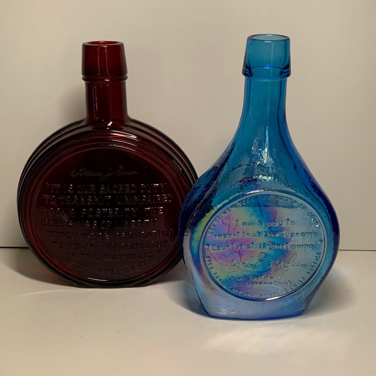 LOT::127: Collection of 6 Wheaton Colored Glass Bottles Featuring Icon Figures and Historical Events