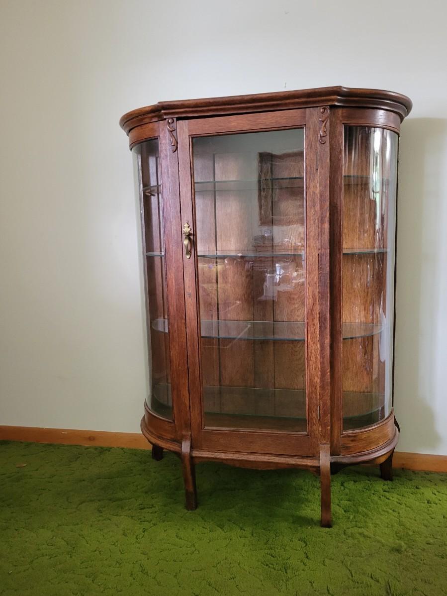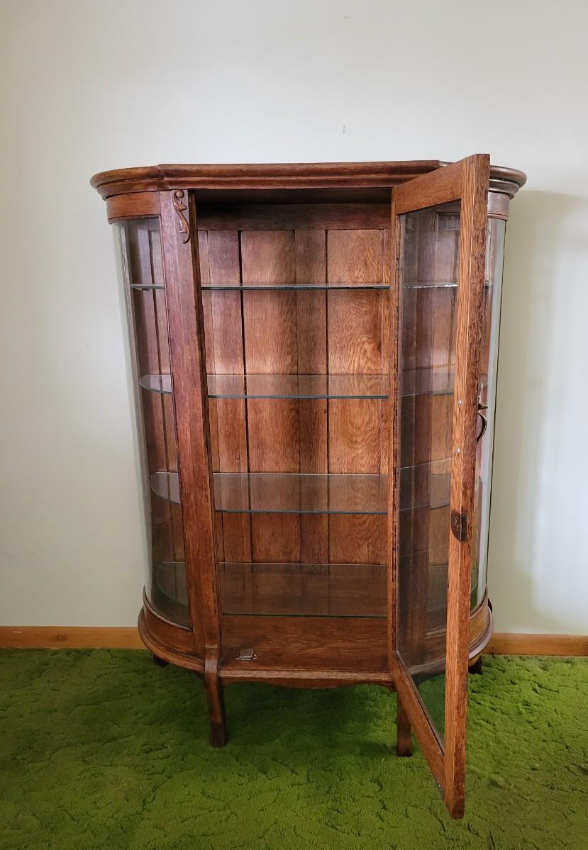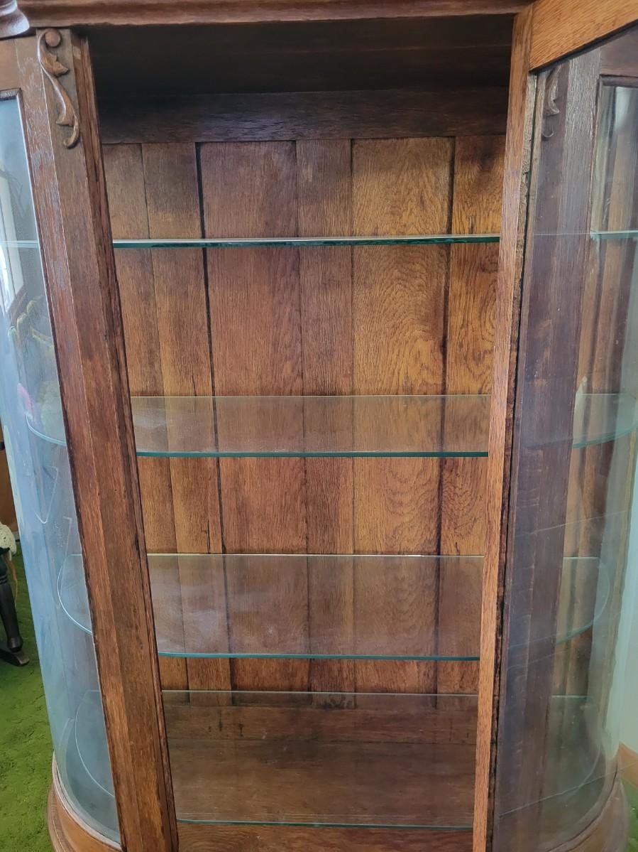 LOT:128: Vintage/Antique Wood Curio/Hutch with Curved Glass Sides and Glass Shelves
