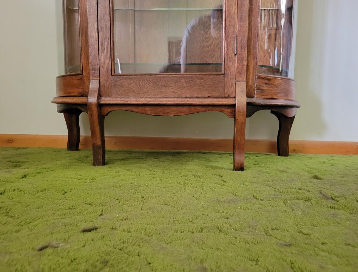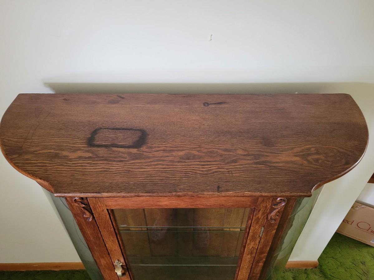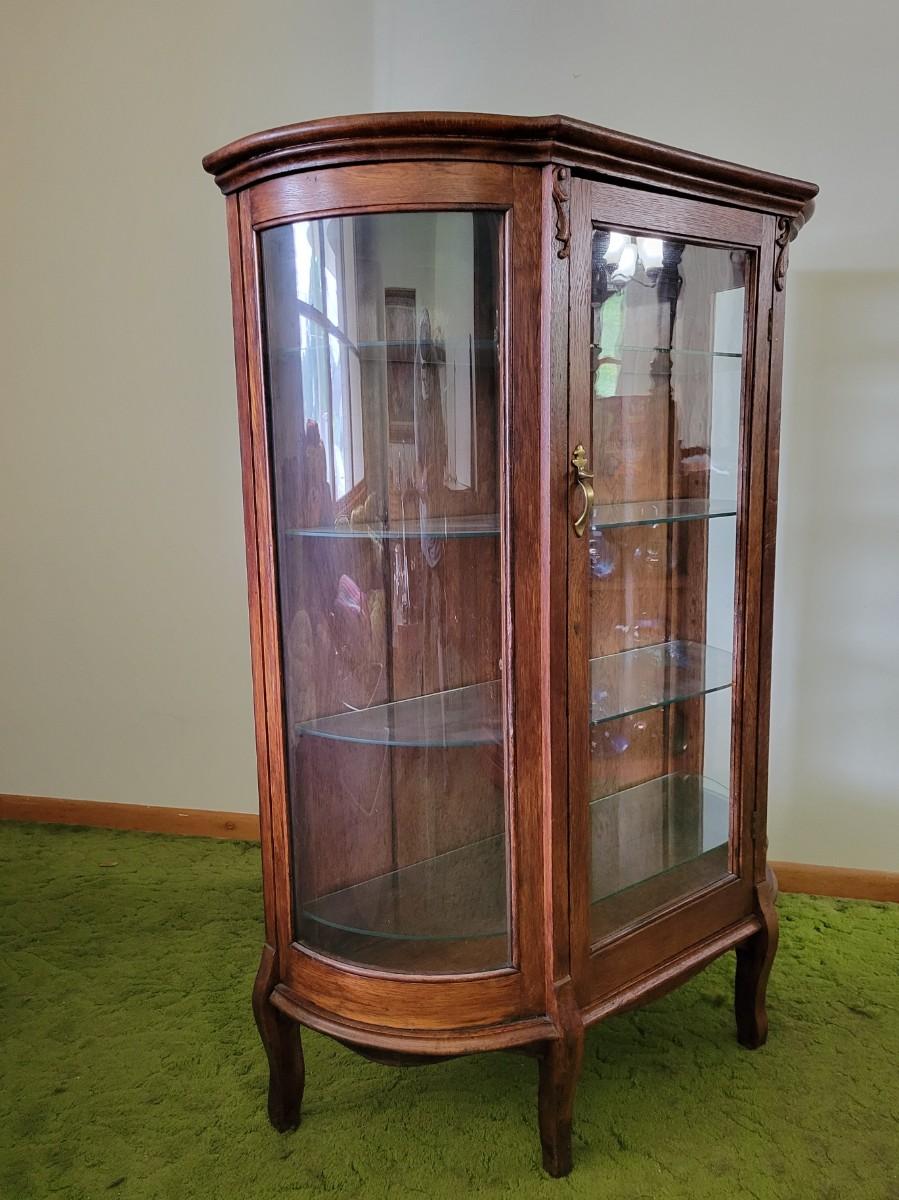 LOT:128: Vintage/Antique Wood Curio/Hutch with Curved Glass Sides and Glass Shelves