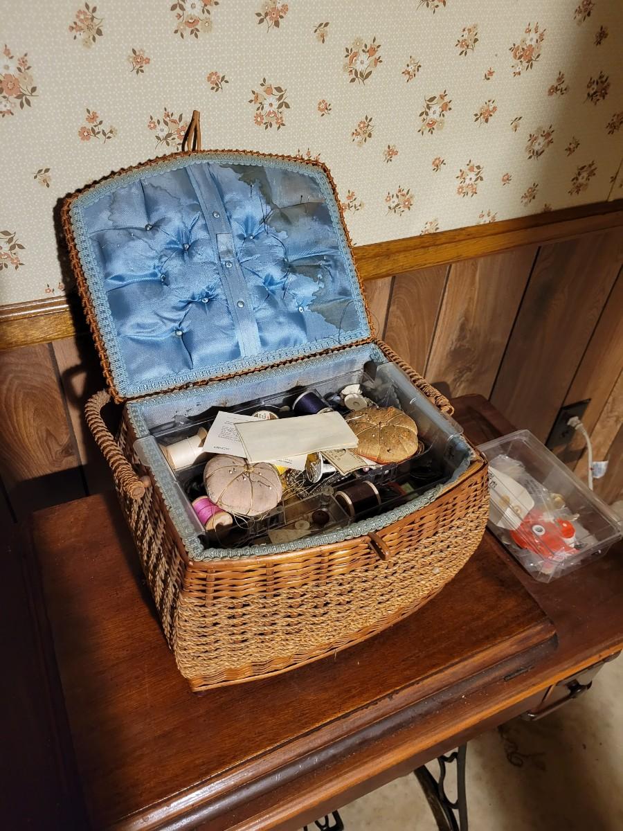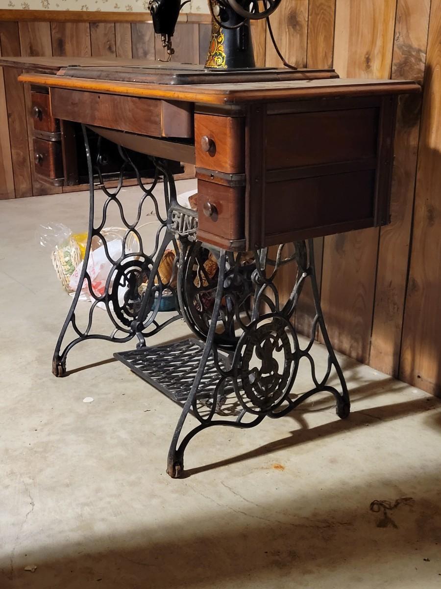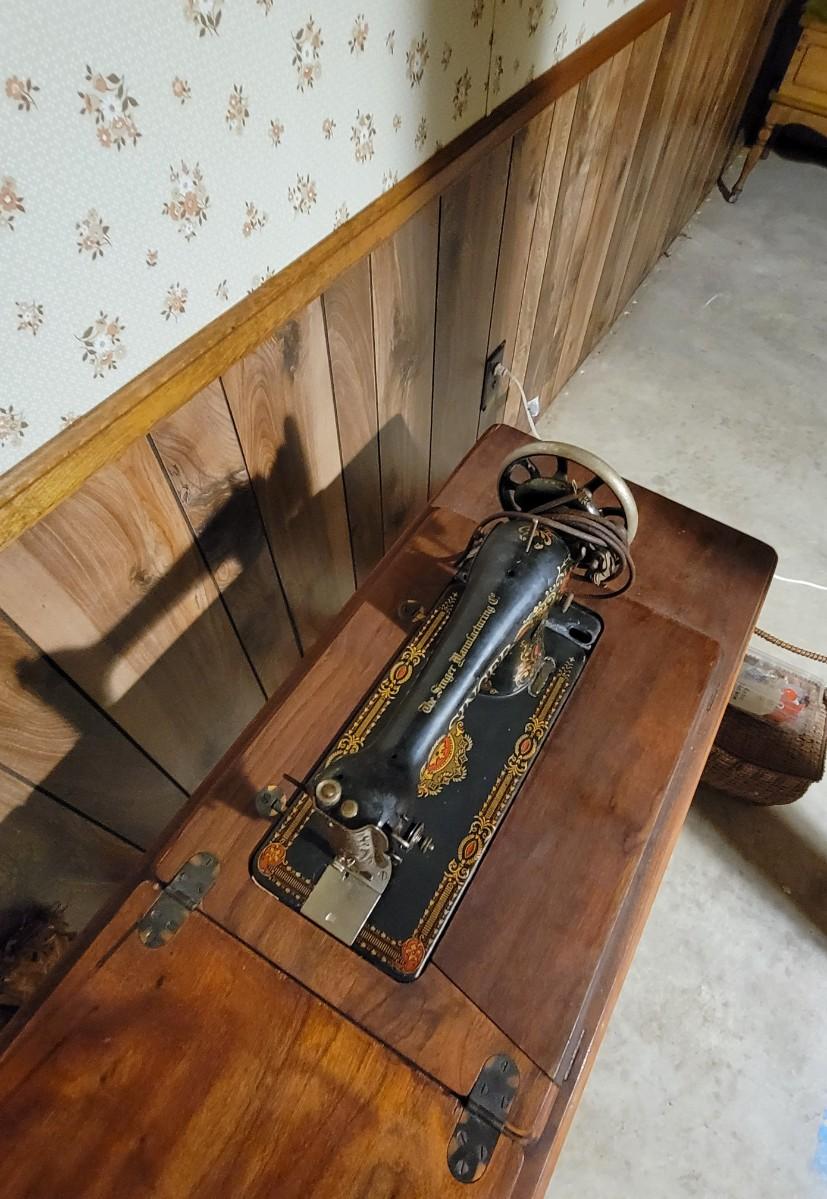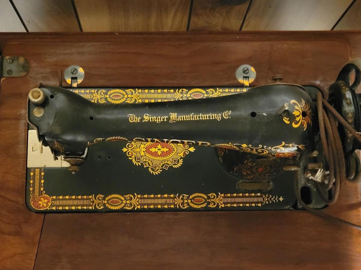 LOT:130: Vintage/Antique Singer Sewing Machine G8731508 with Wood Cabinet and Sewing Baskets with Sewing and Crafting Supplies.