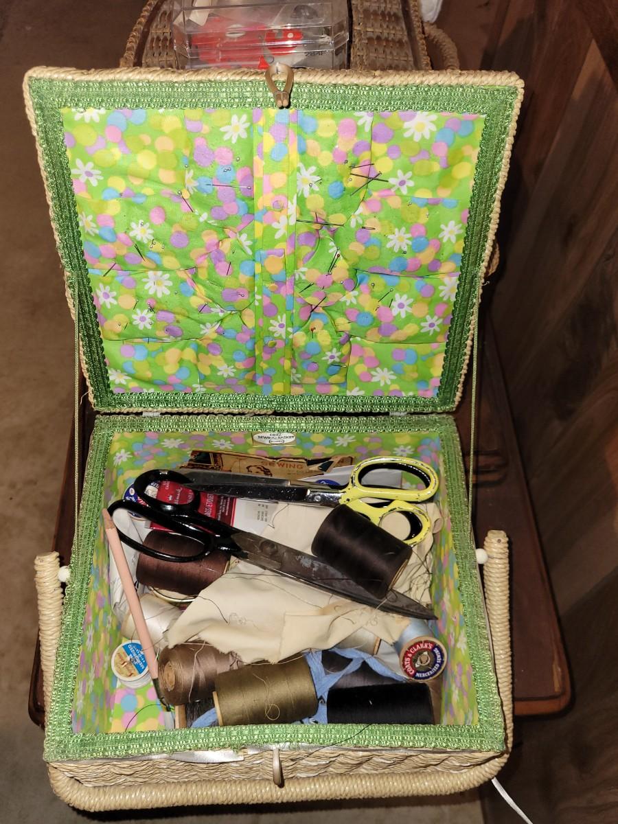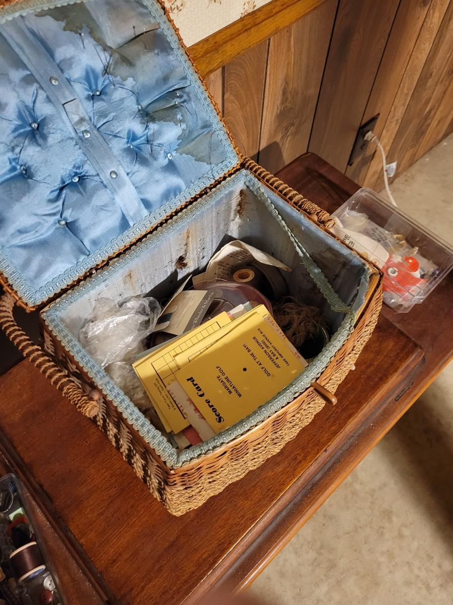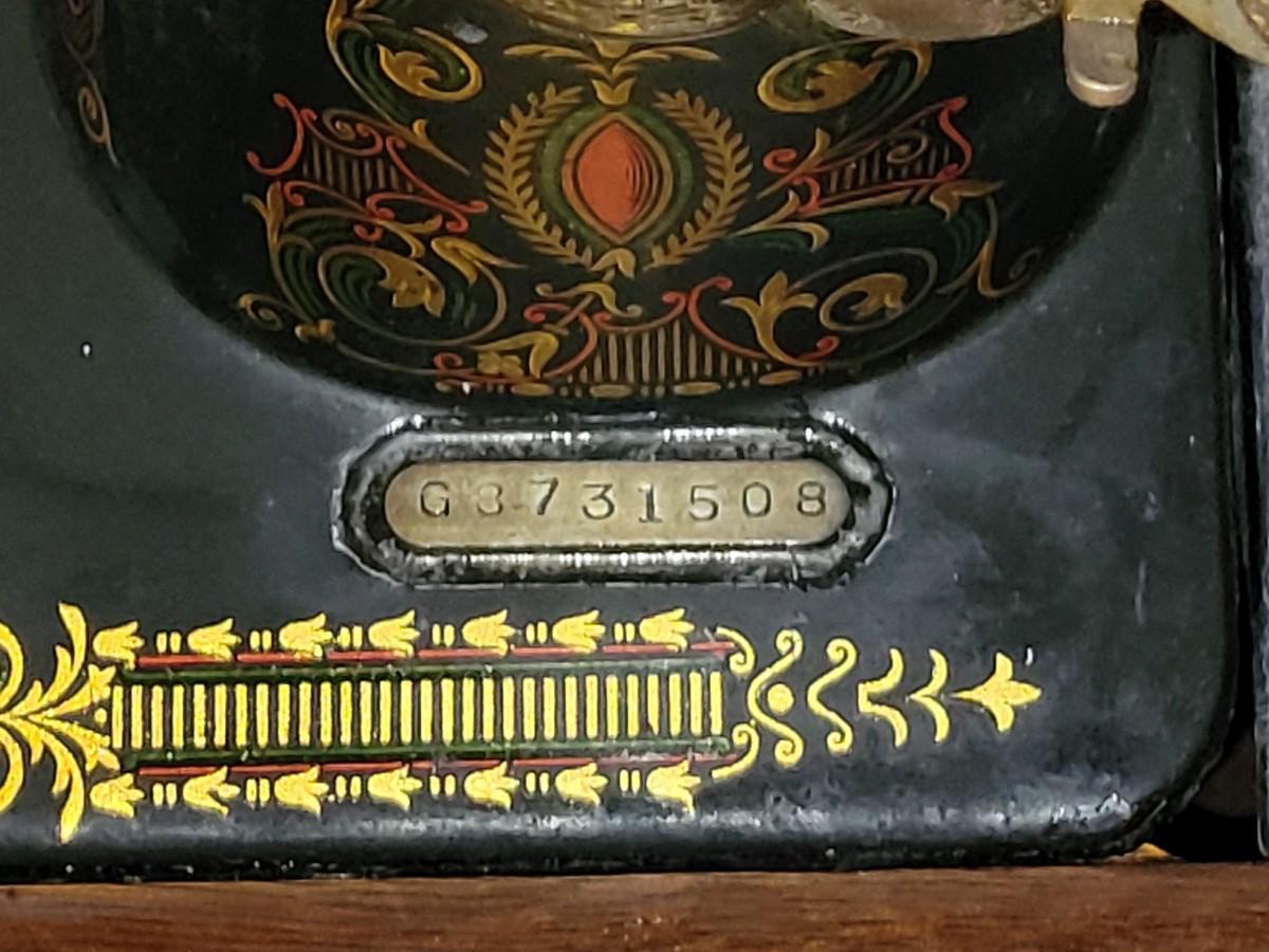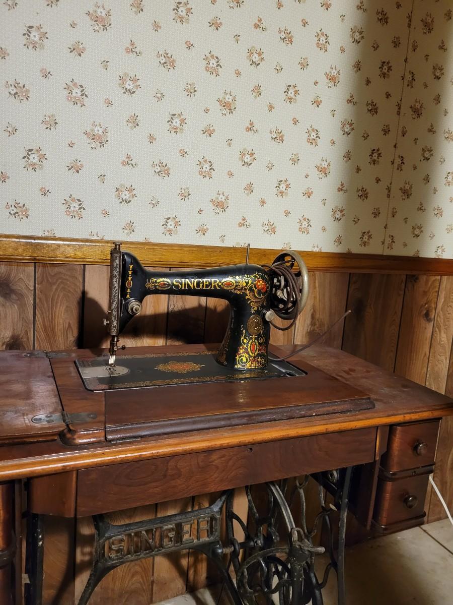 LOT:130: Vintage/Antique Singer Sewing Machine G8731508 with Wood Cabinet and Sewing Baskets with Sewing and Crafting Supplies.