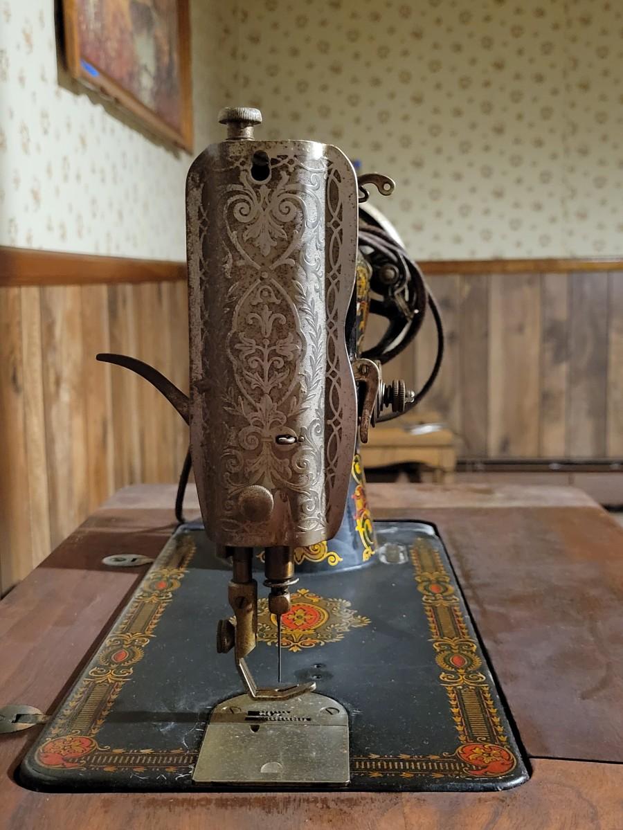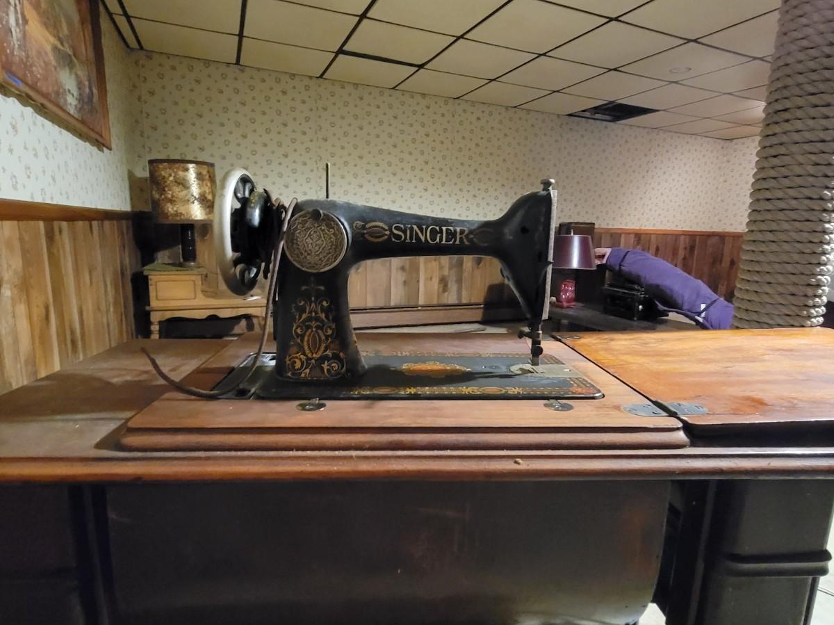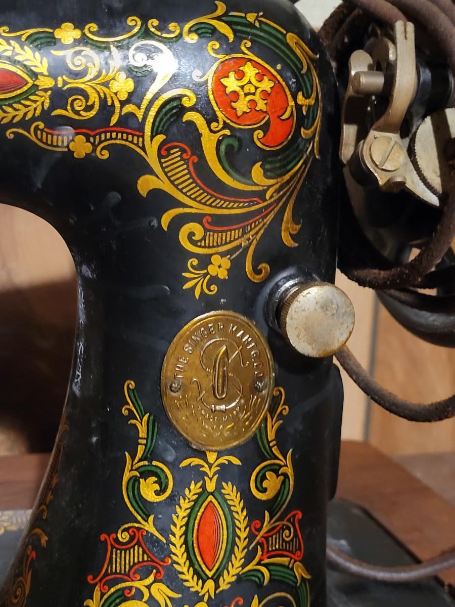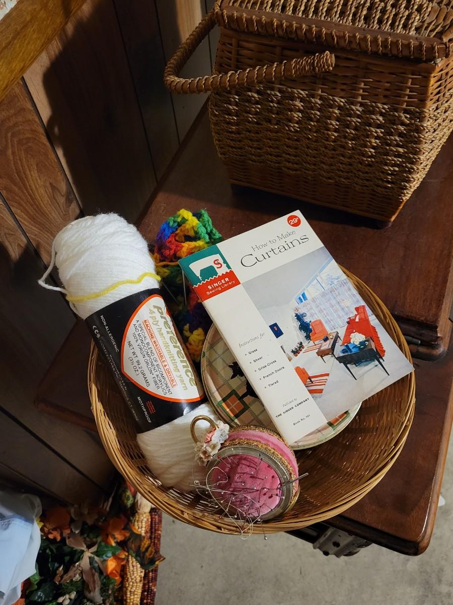 LOT:130: Vintage/Antique Singer Sewing Machine G8731508 with Wood Cabinet and Sewing Baskets with Sewing and Crafting Supplies.