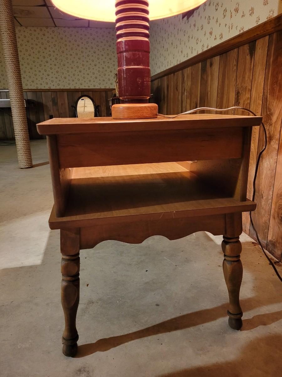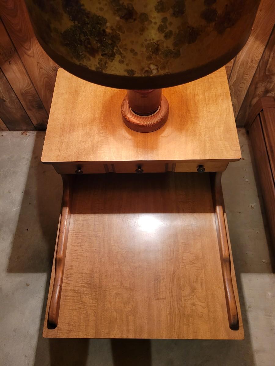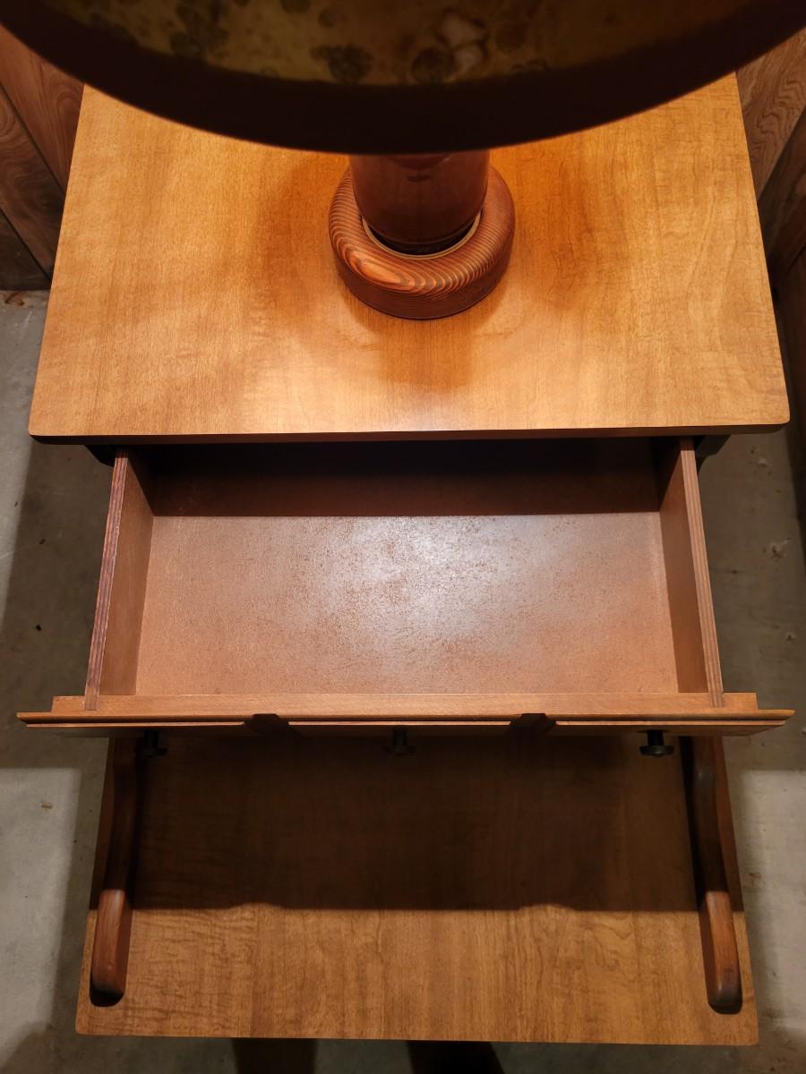 LOT:133: Wood Side Table with Drawers and Mid Centry Moder Lamp