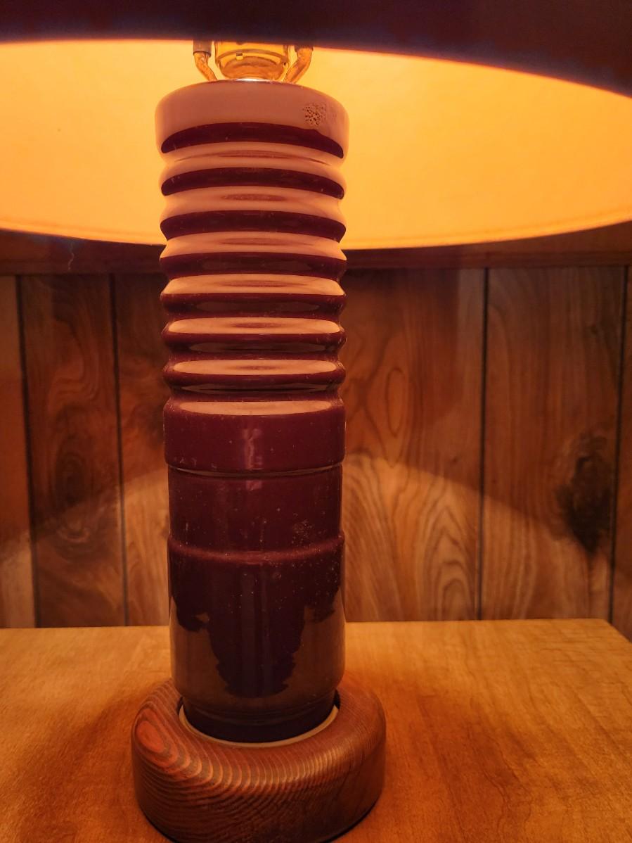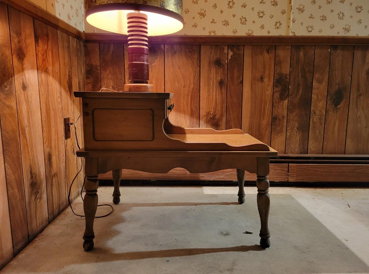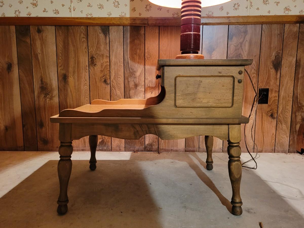 LOT:133: Wood Side Table with Drawers and Mid Centry Moder Lamp