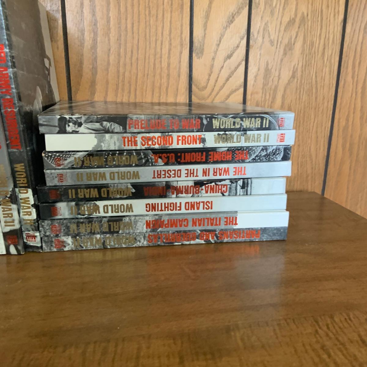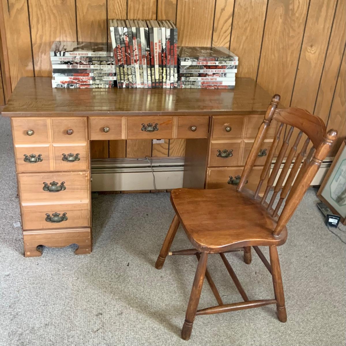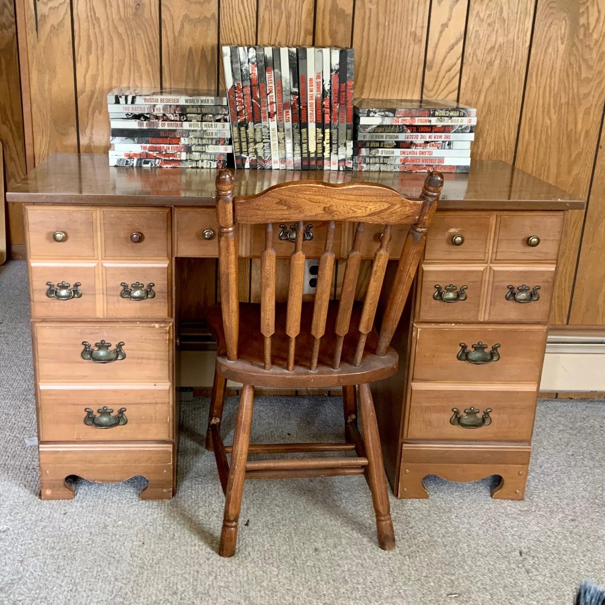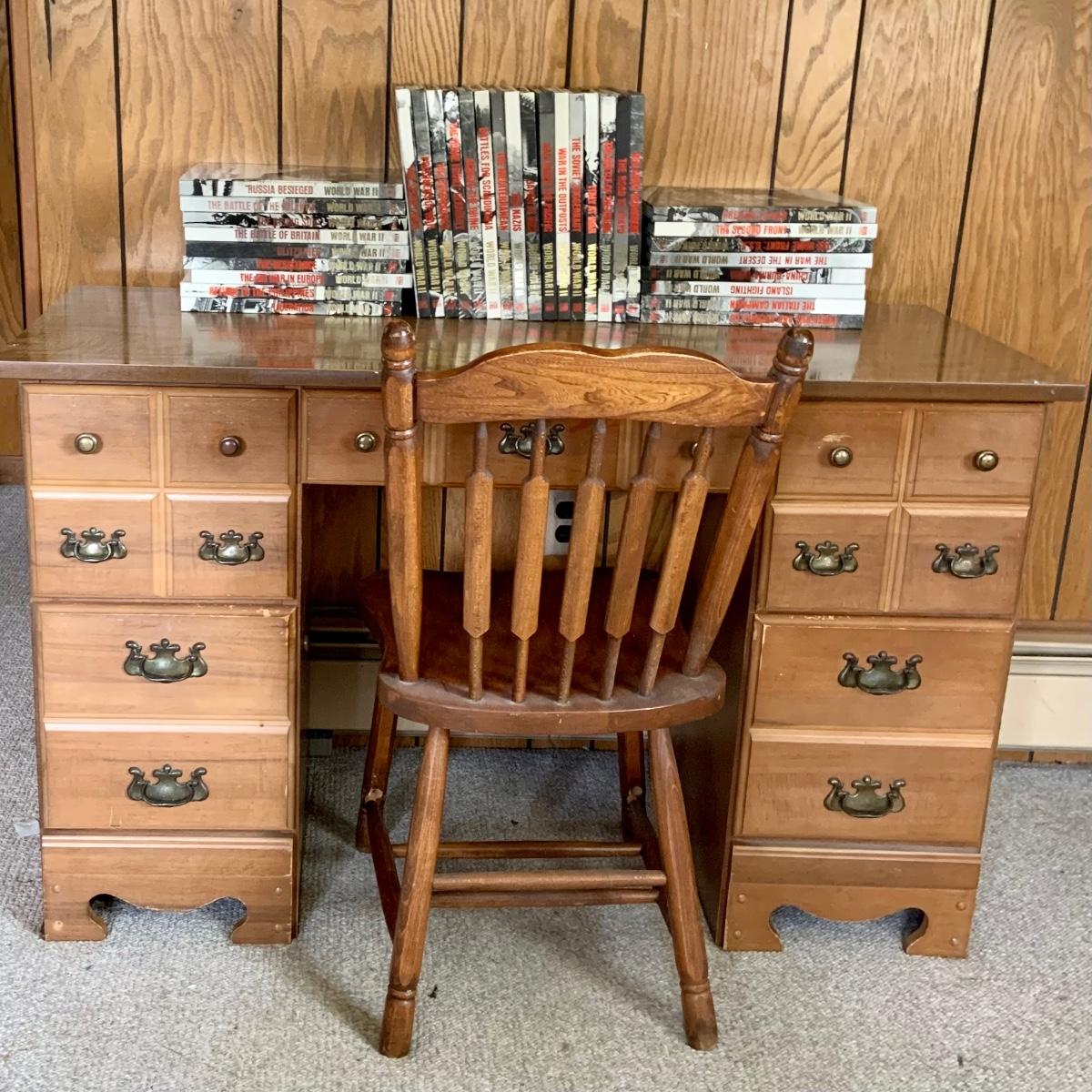 LOT:137: Wooden Desk and Chair with a Collection of Time Life World World War II Books