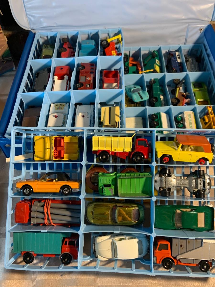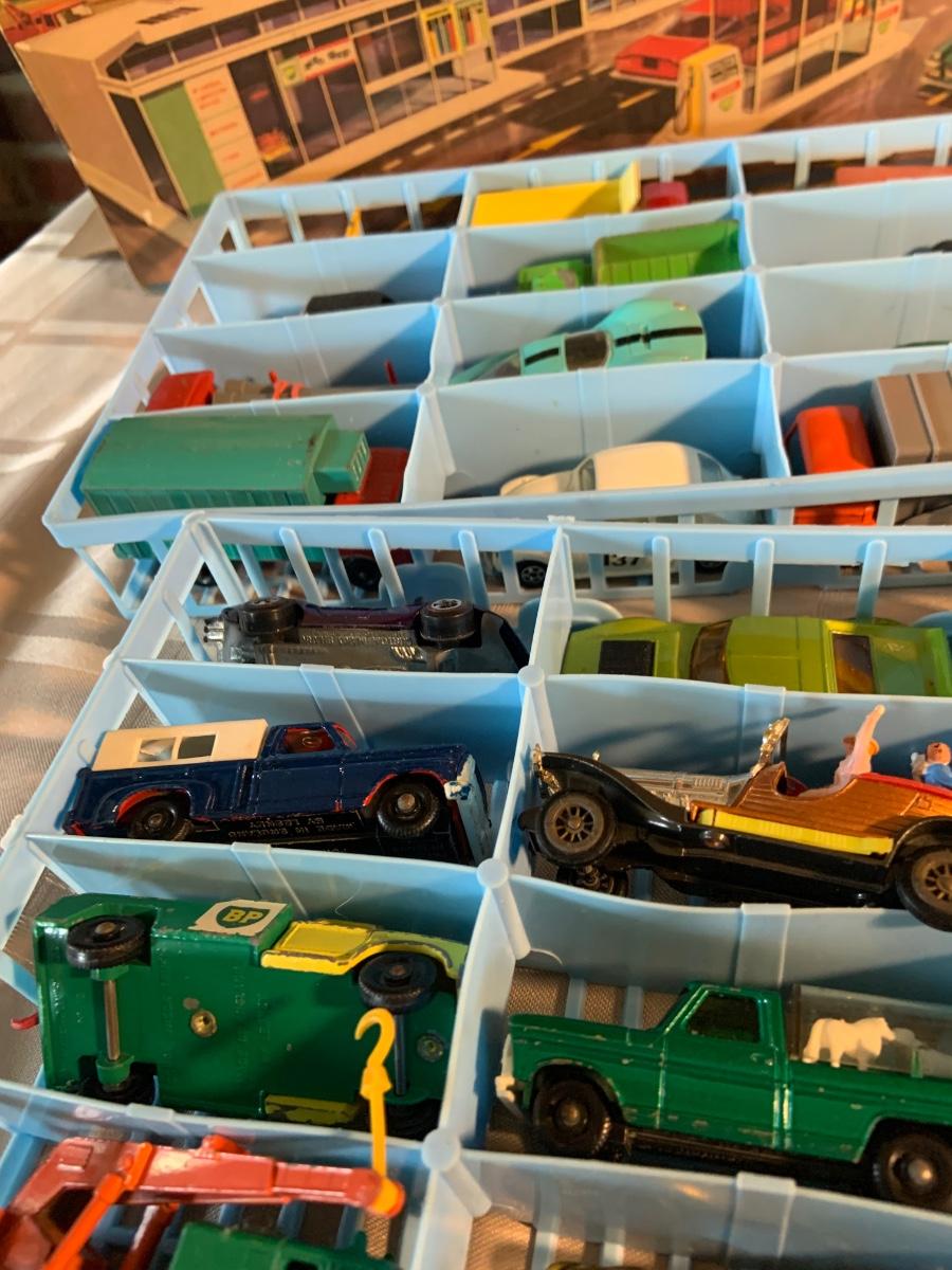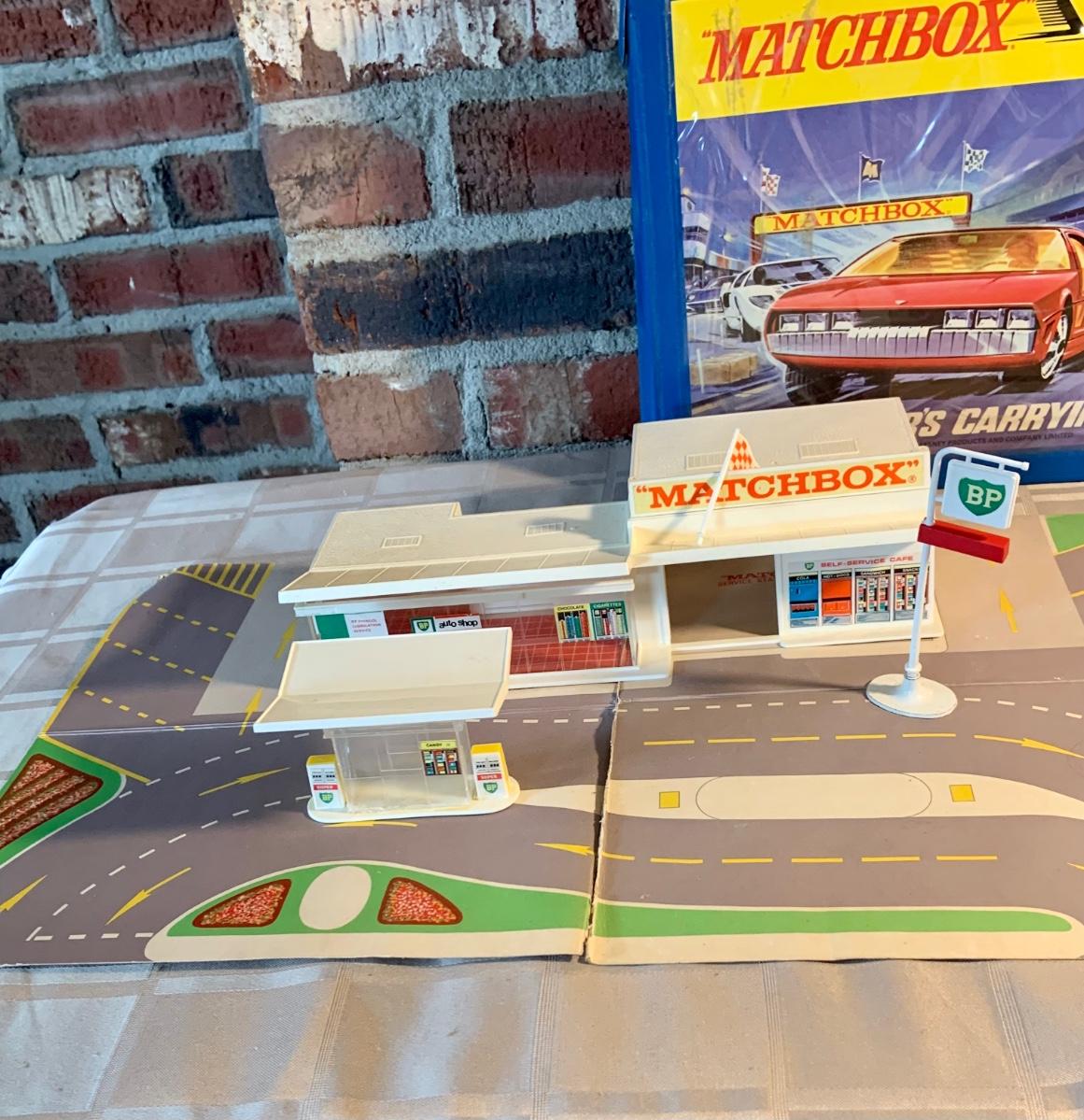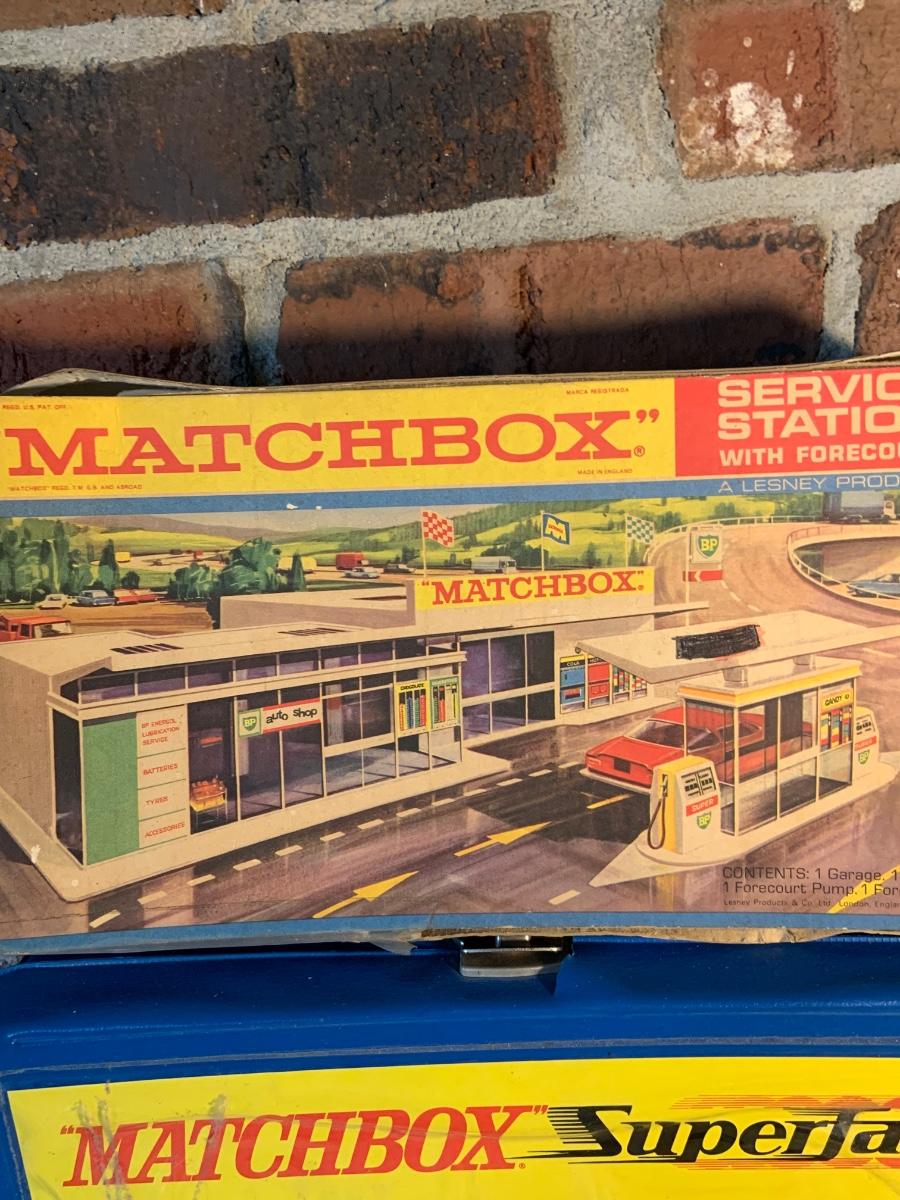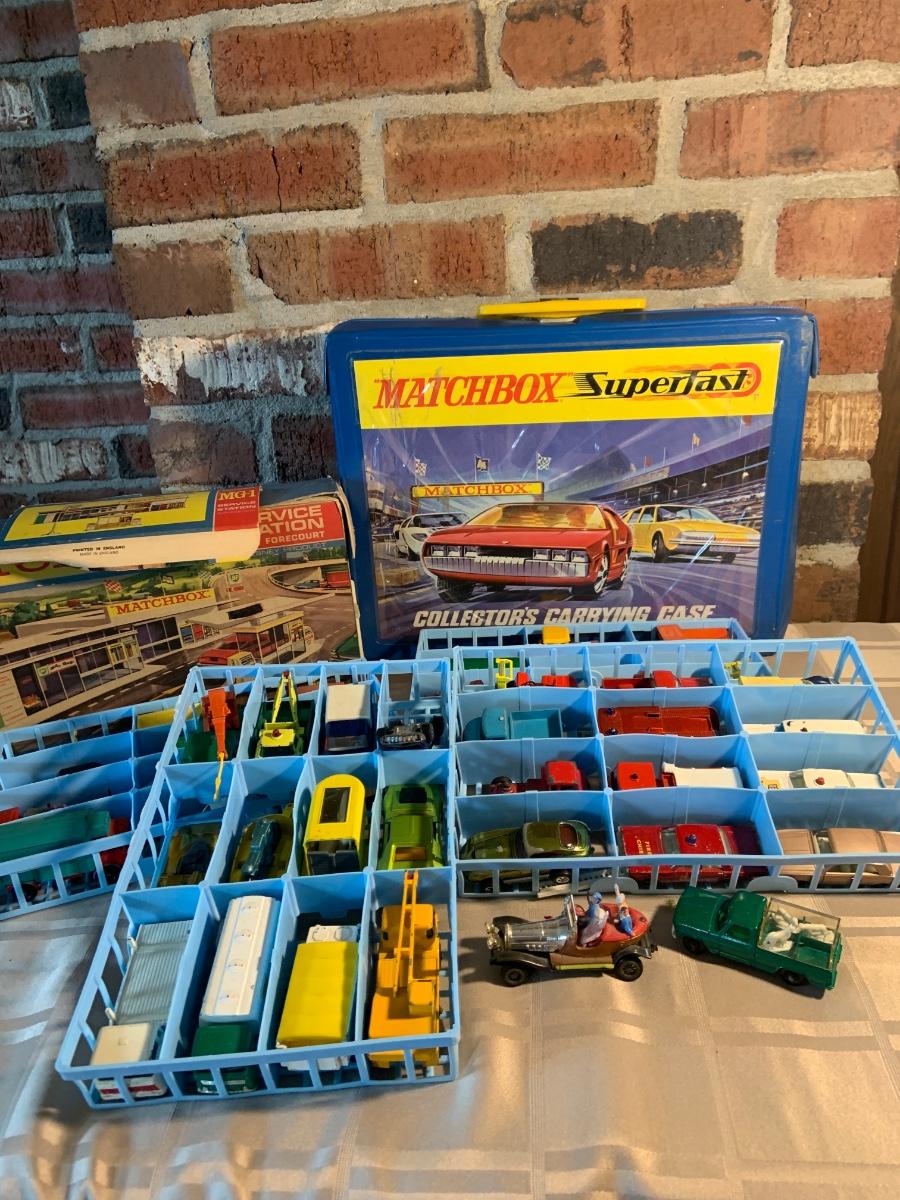 LOT:141: Matchbox Collection Including a Carring Case Loaded with Vintage Cars and a Service Station in Original Box