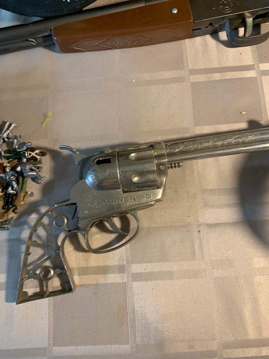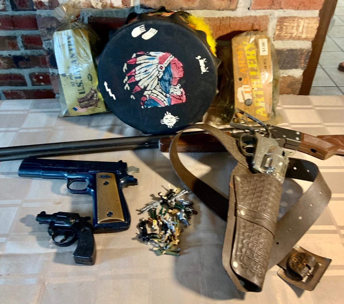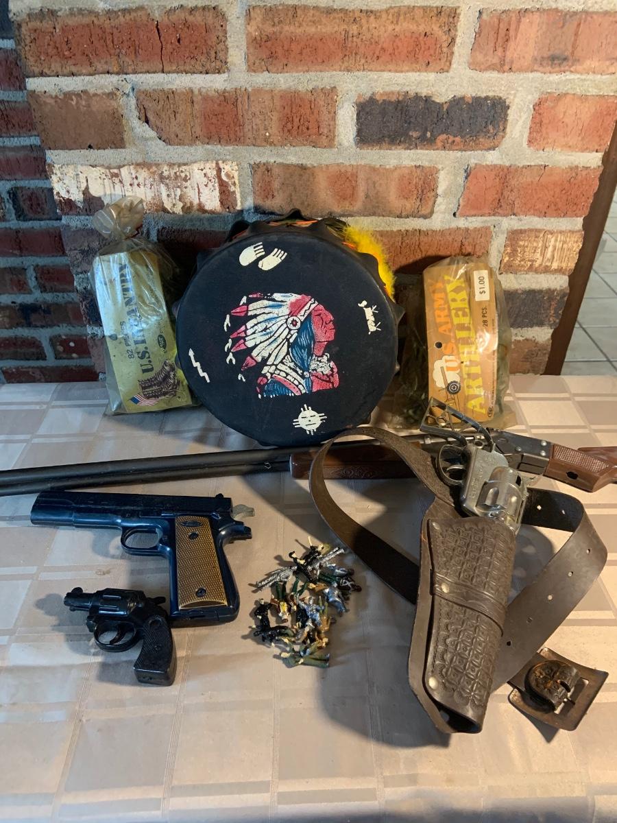 LOT:144G: Vintage Toy Guns, Army Men in Package and Drum