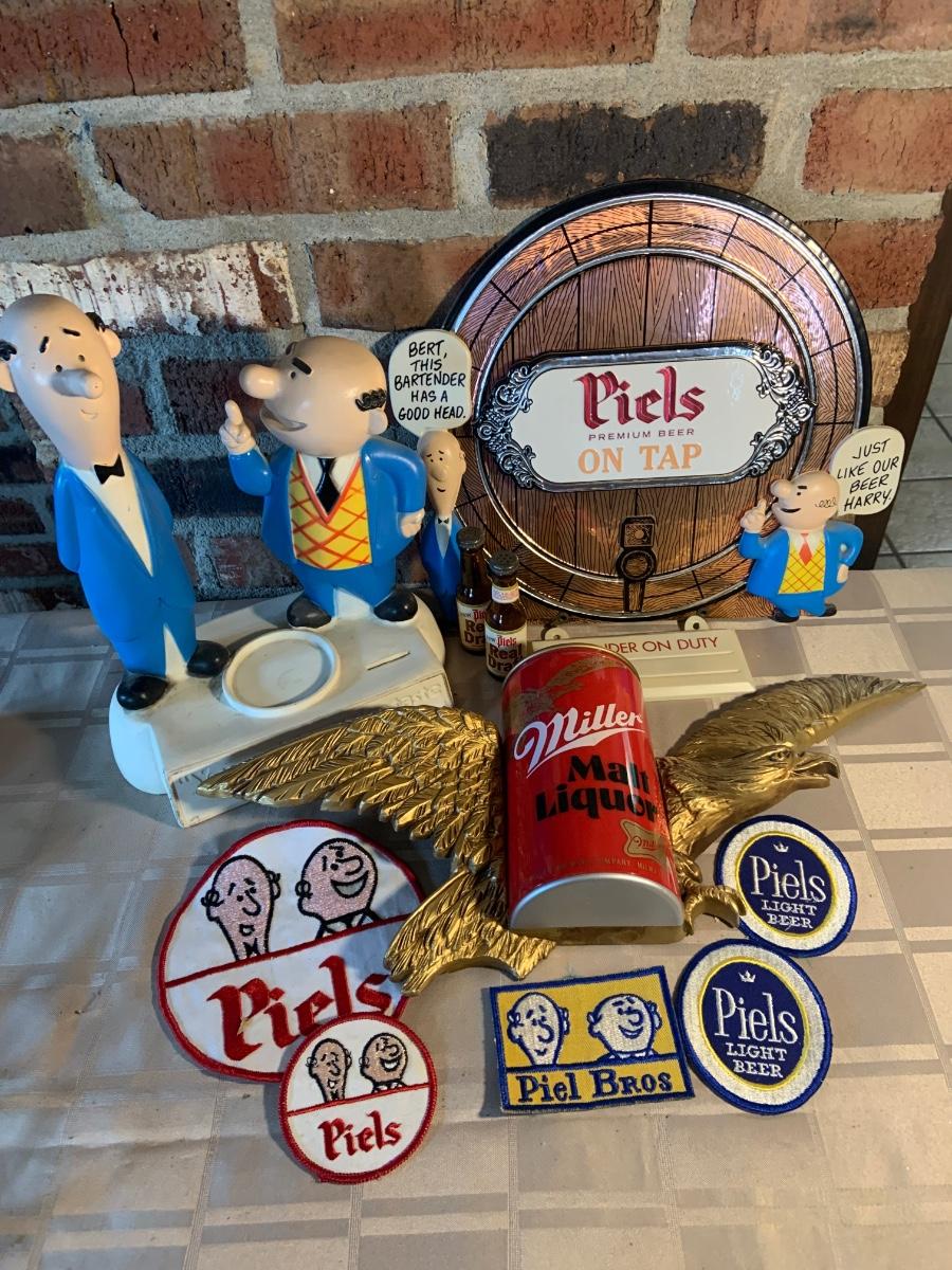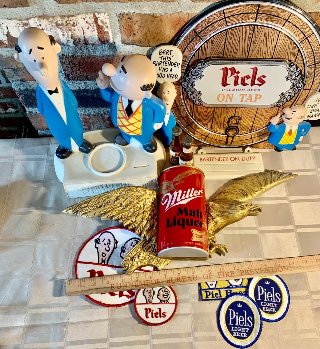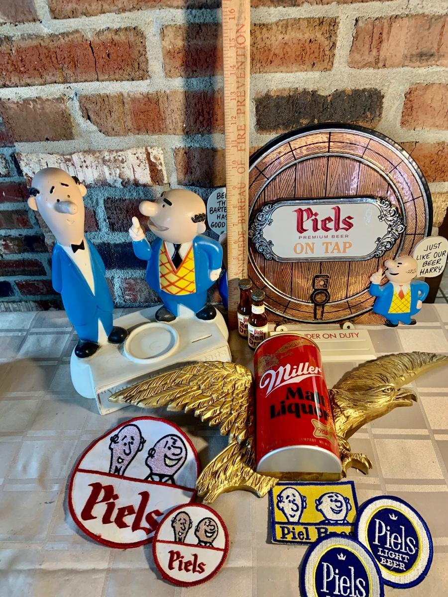 LOT:145G: Piels Beer Bank, Sign, Salt and Pepper Shakers and Patches and a Miller Malt Liquor Sign