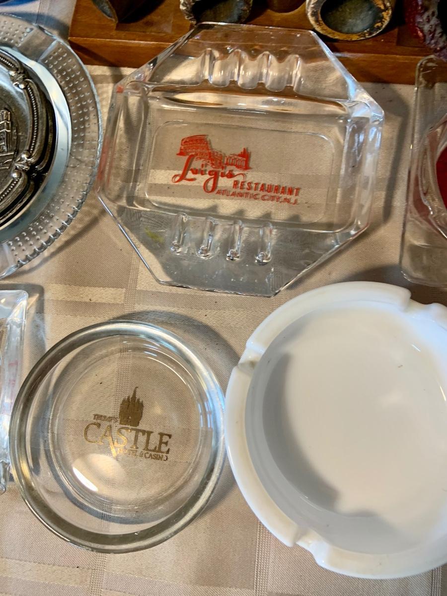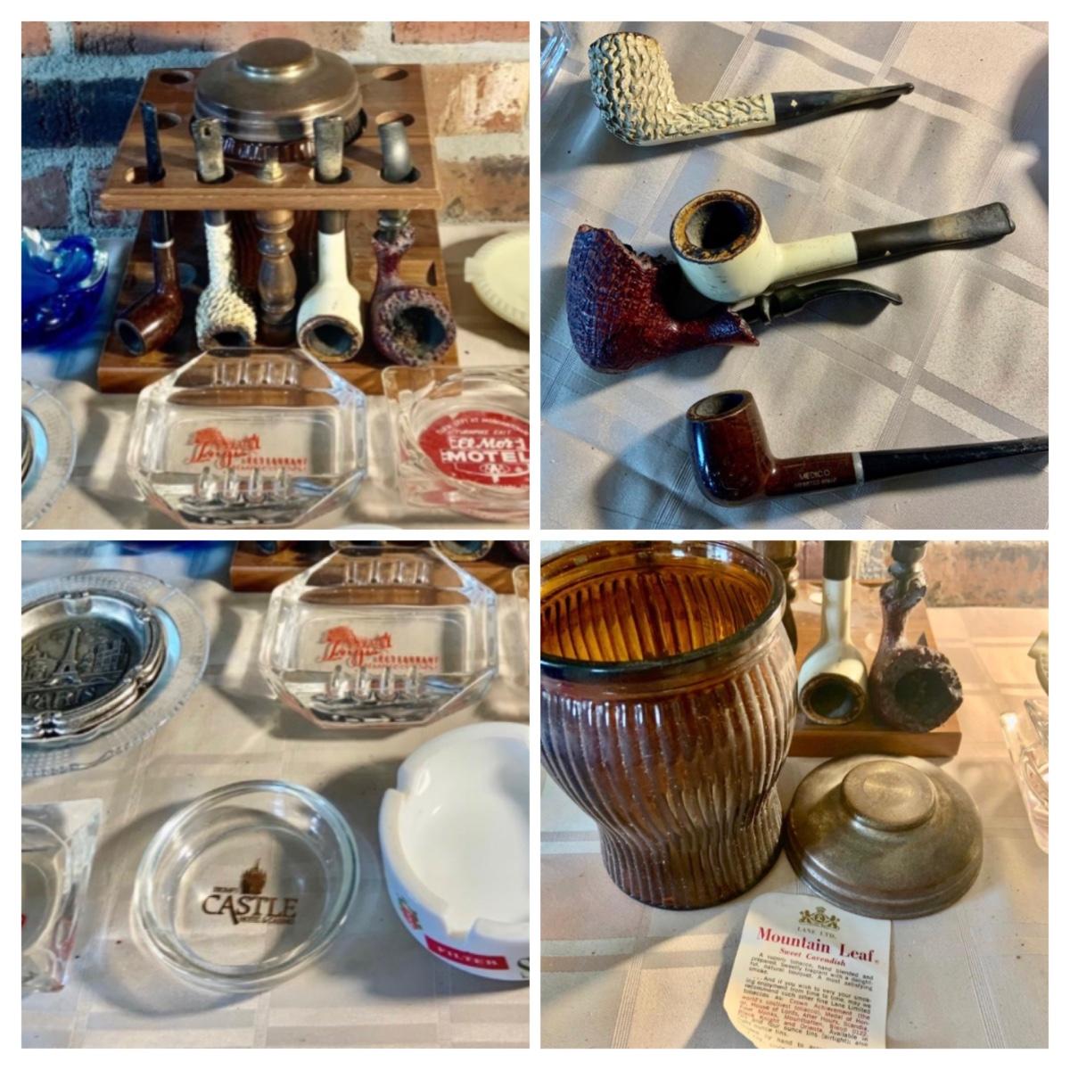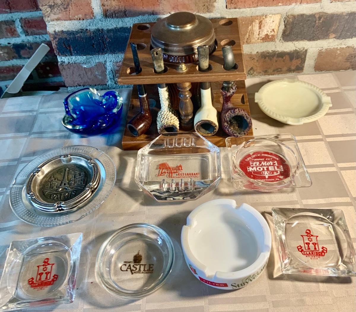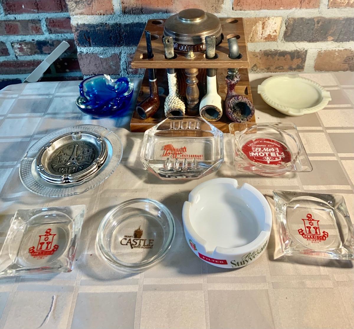 LOT:148G: Pipes, with Stand and Tobacco Jar: and a Large Assortment of Souvinear and Other Ashtrays