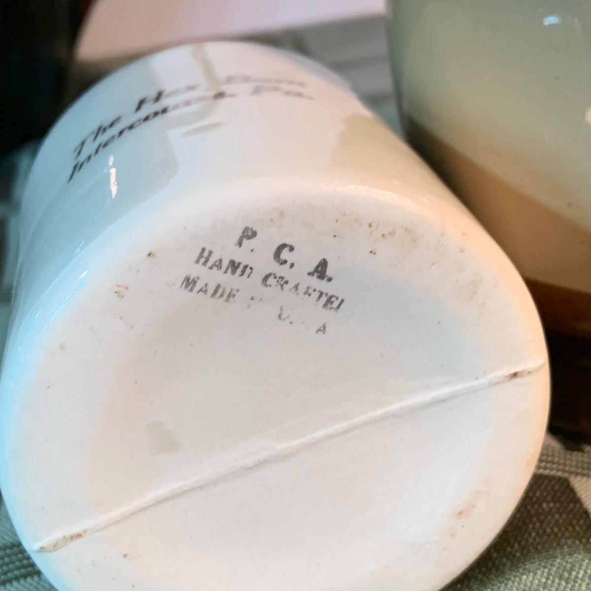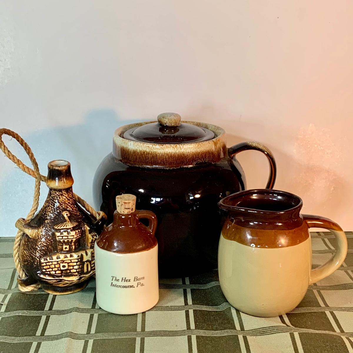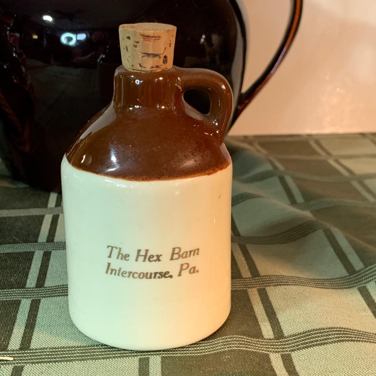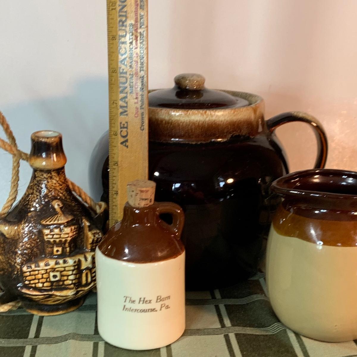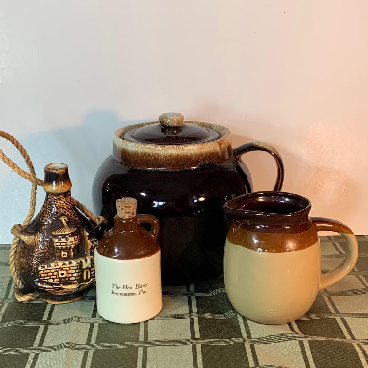 LOT:152G: Pfaltzgraff Crock, Primitive Pitcher, a Jug from the Hex Barn in Intercourse Pa and a RS Marino Bottle