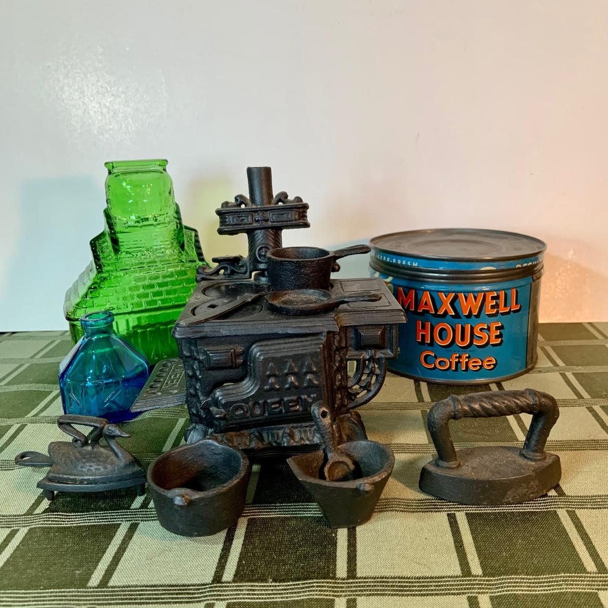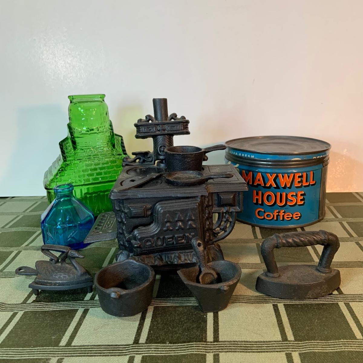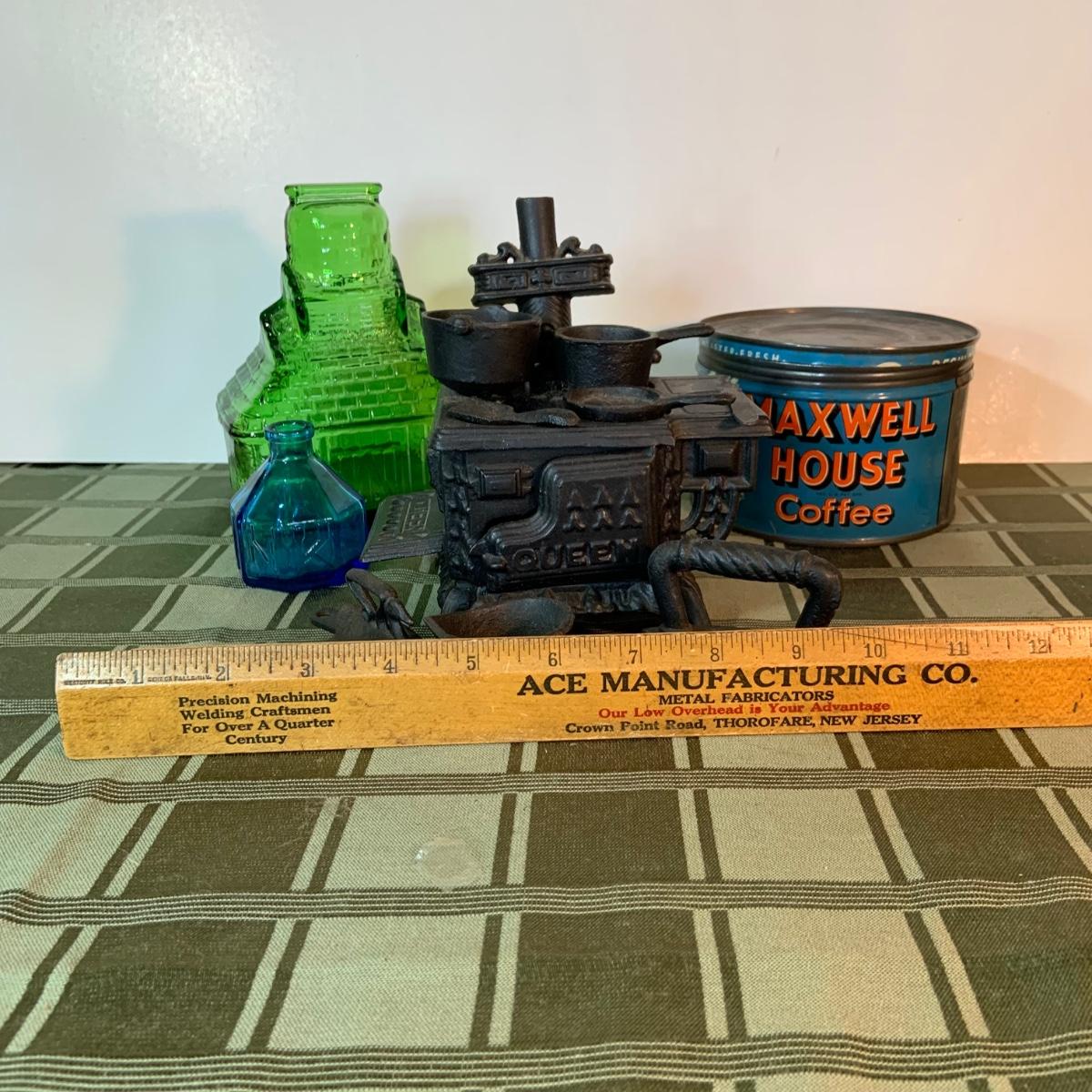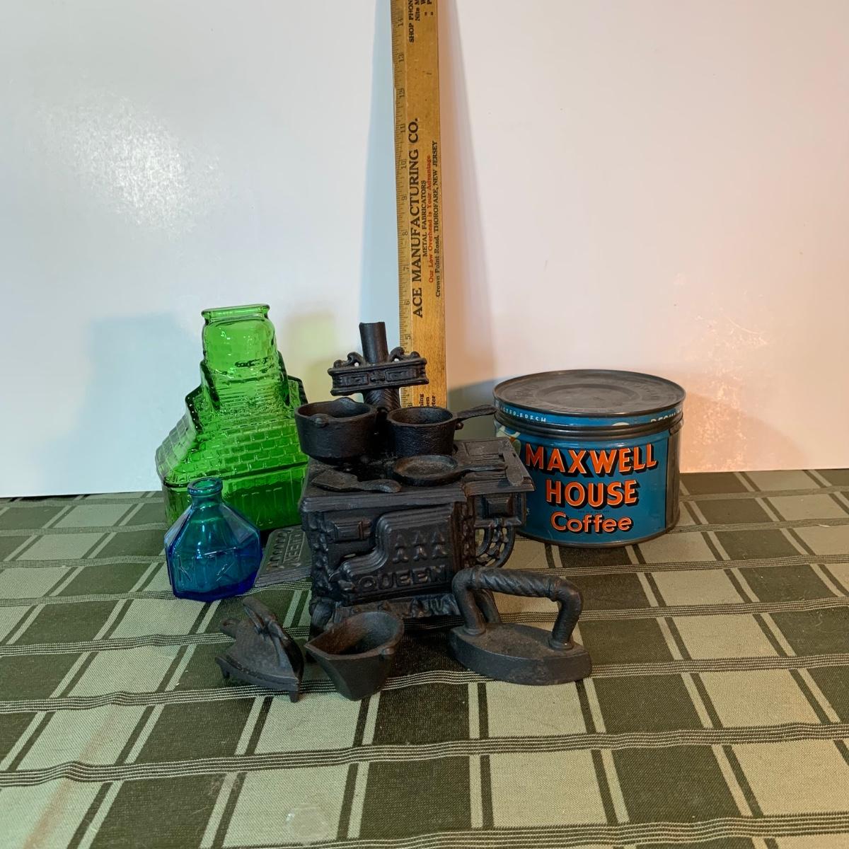 LOT:155G: Queen Miniture Castiron Stove with Pots Pans and More; a Wheaton Blue Inkwell, a Wheaton Flint Glass Bank and a Vintage Maxwell House Coffe Tin