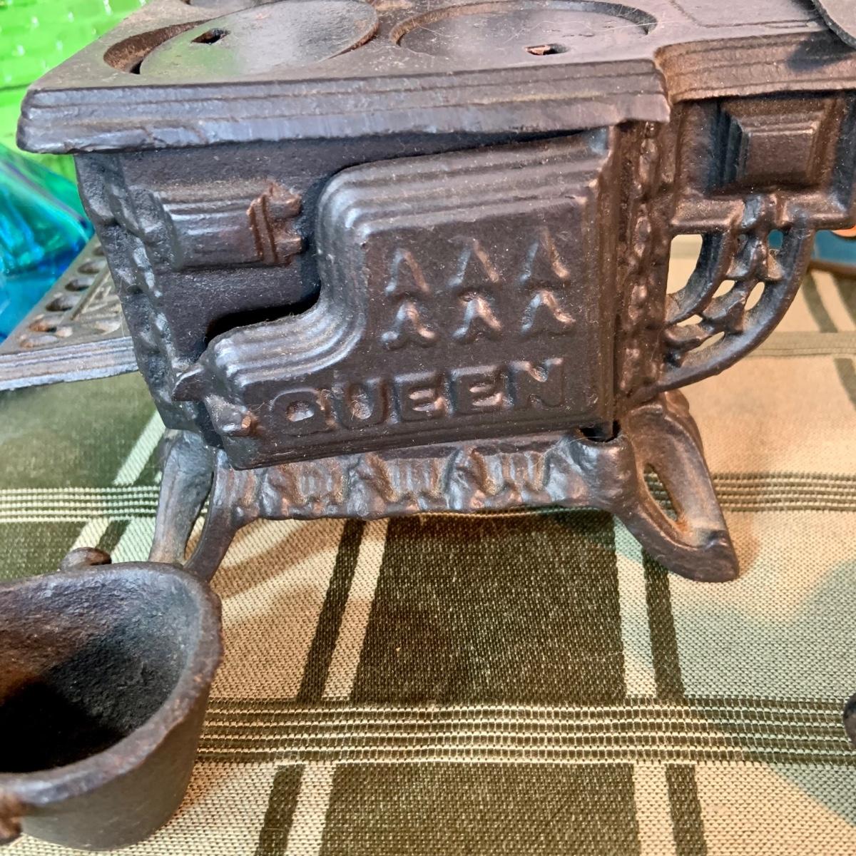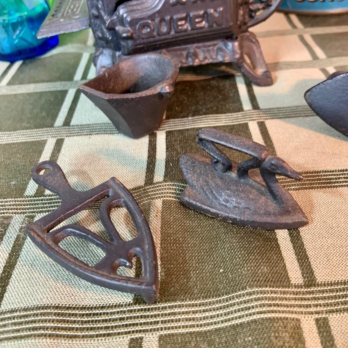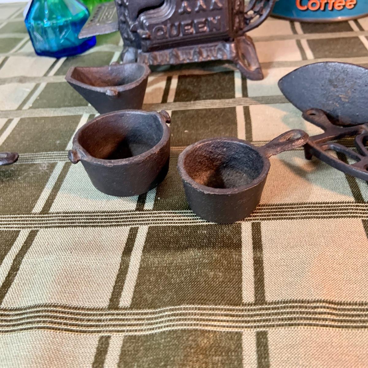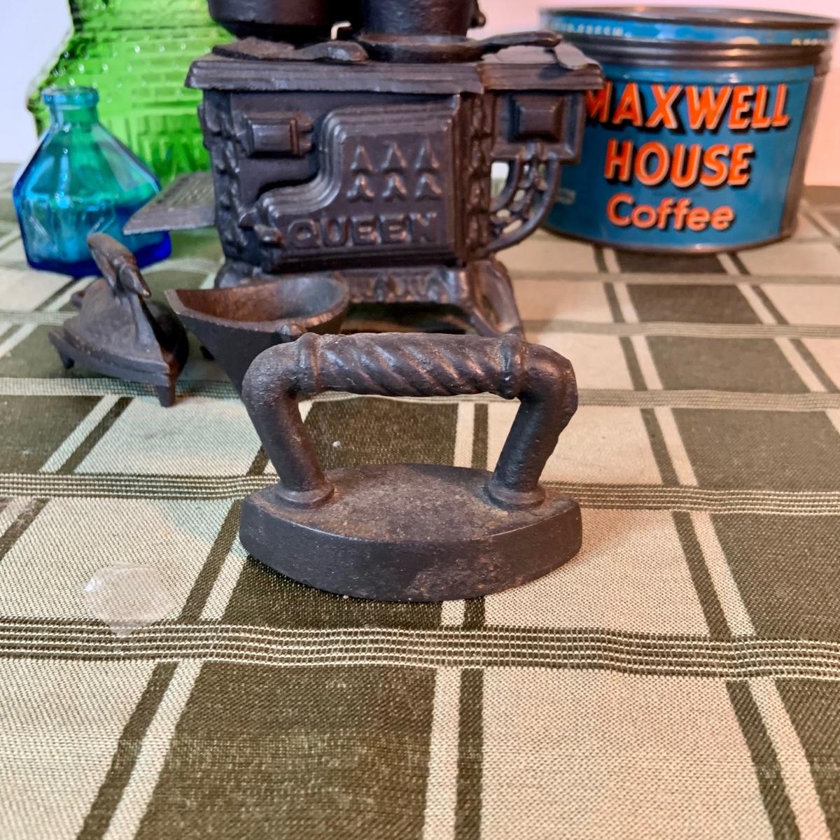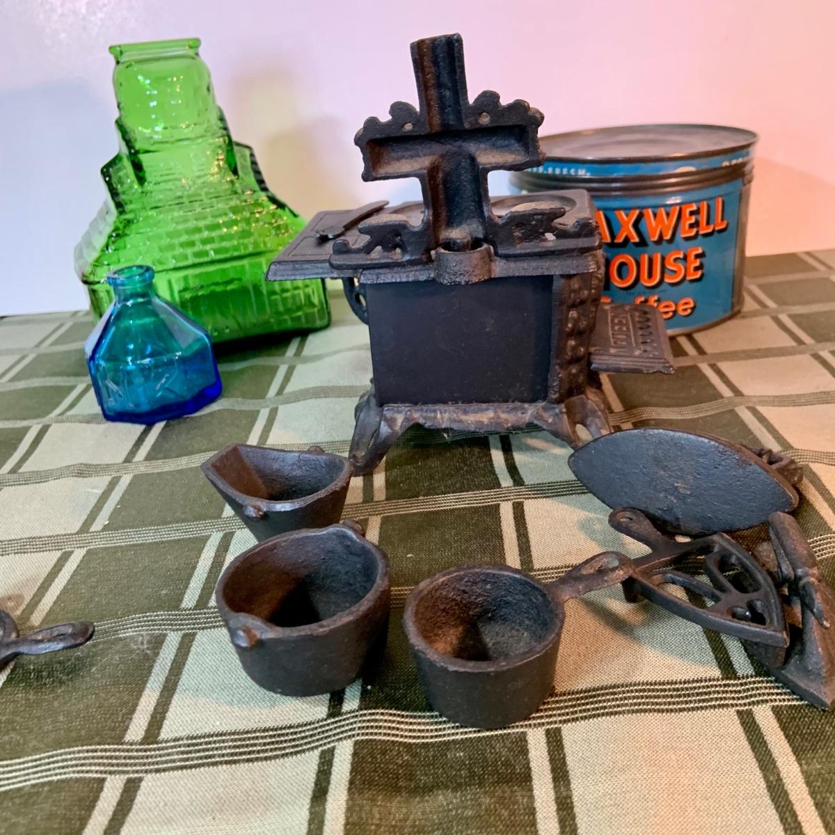 LOT:155G: Queen Miniture Castiron Stove with Pots Pans and More; a Wheaton Blue Inkwell, a Wheaton Flint Glass Bank and a Vintage Maxwell House Coffe Tin