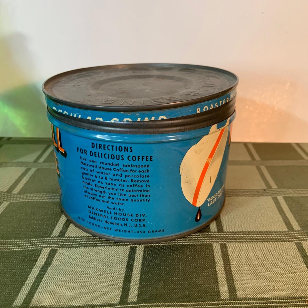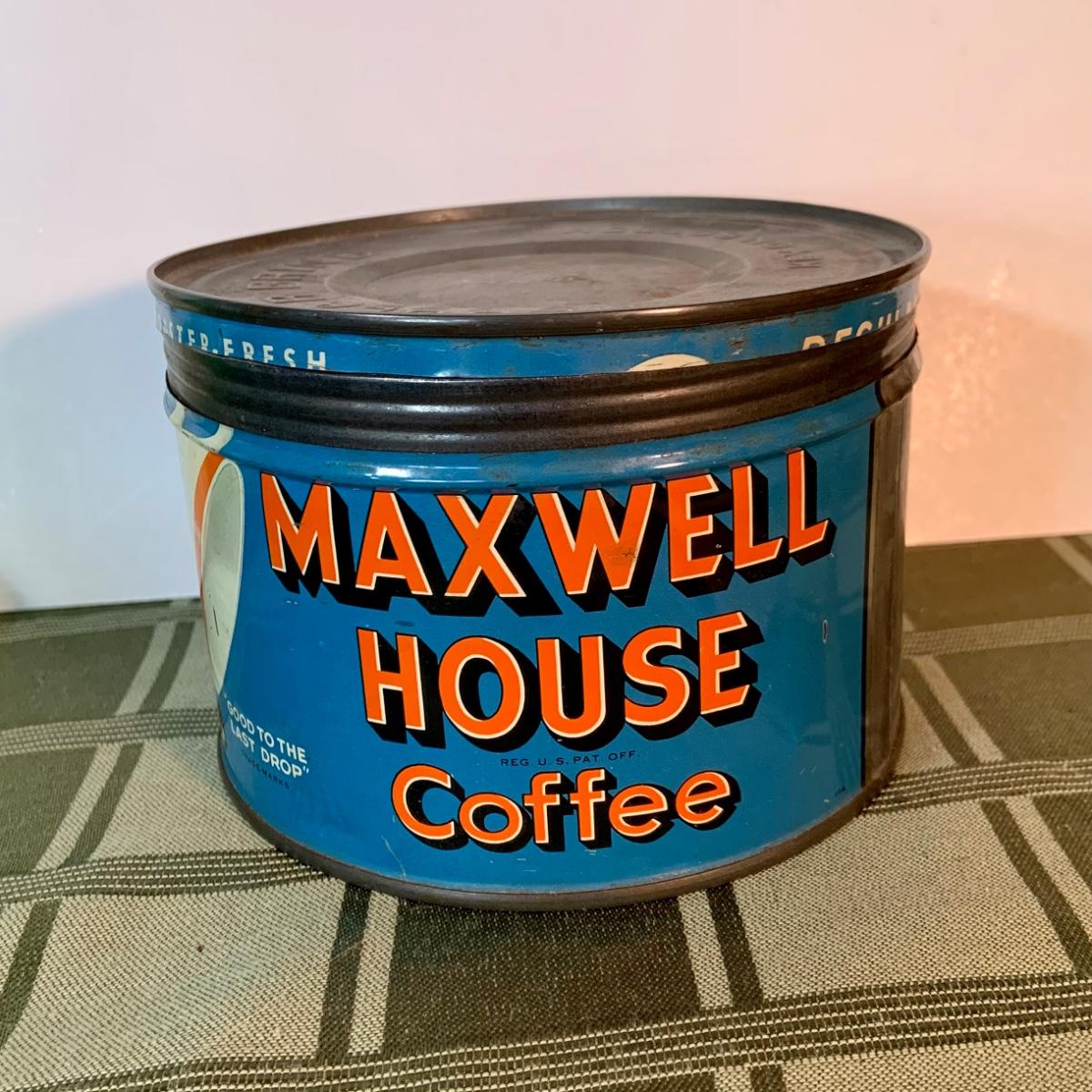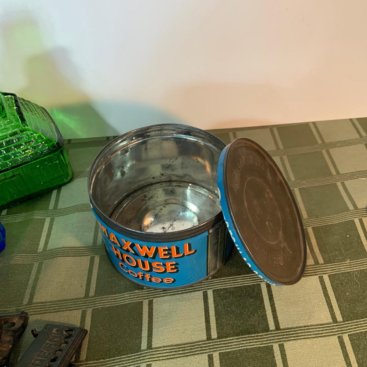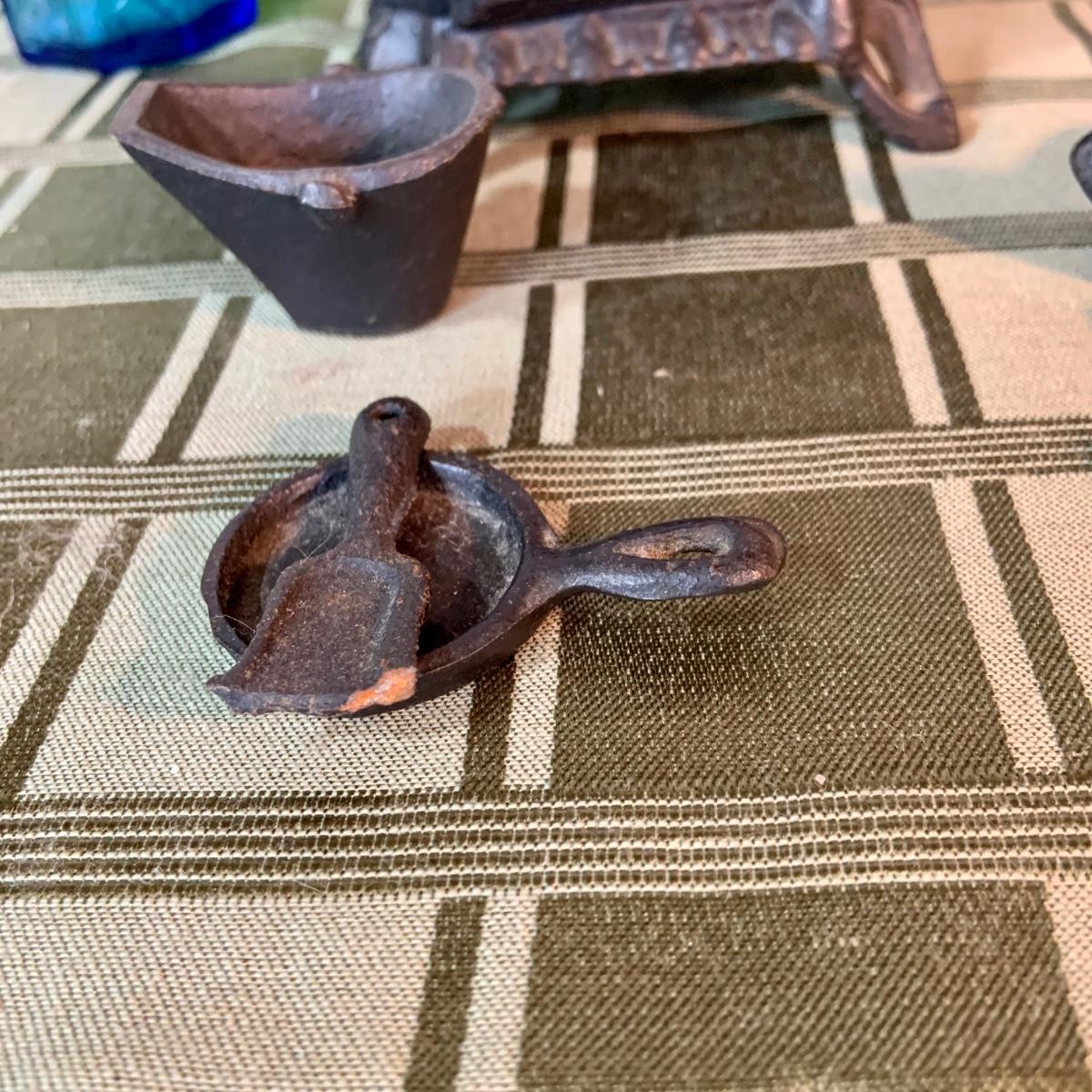 LOT:155G: Queen Miniture Castiron Stove with Pots Pans and More; a Wheaton Blue Inkwell, a Wheaton Flint Glass Bank and a Vintage Maxwell House Coffe Tin