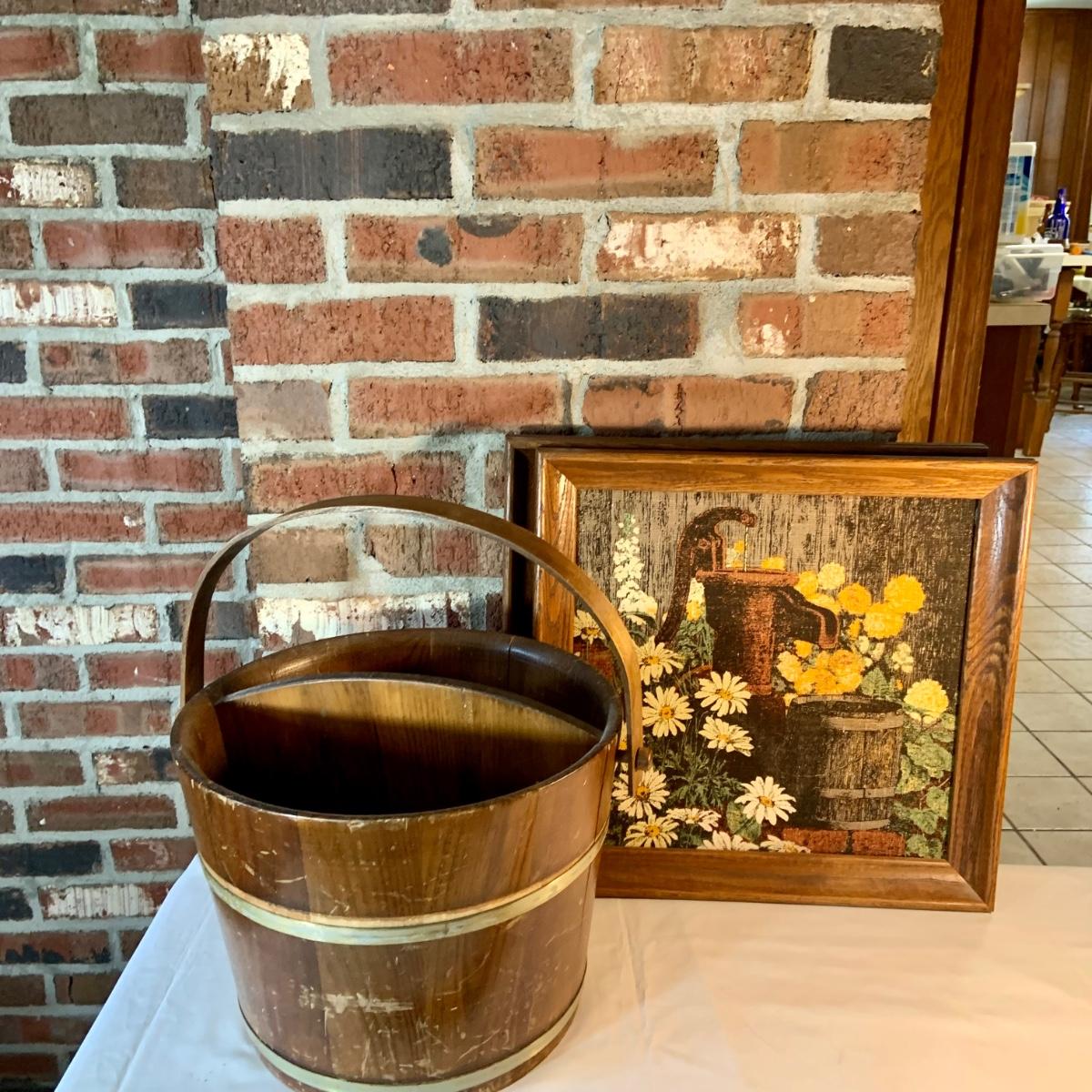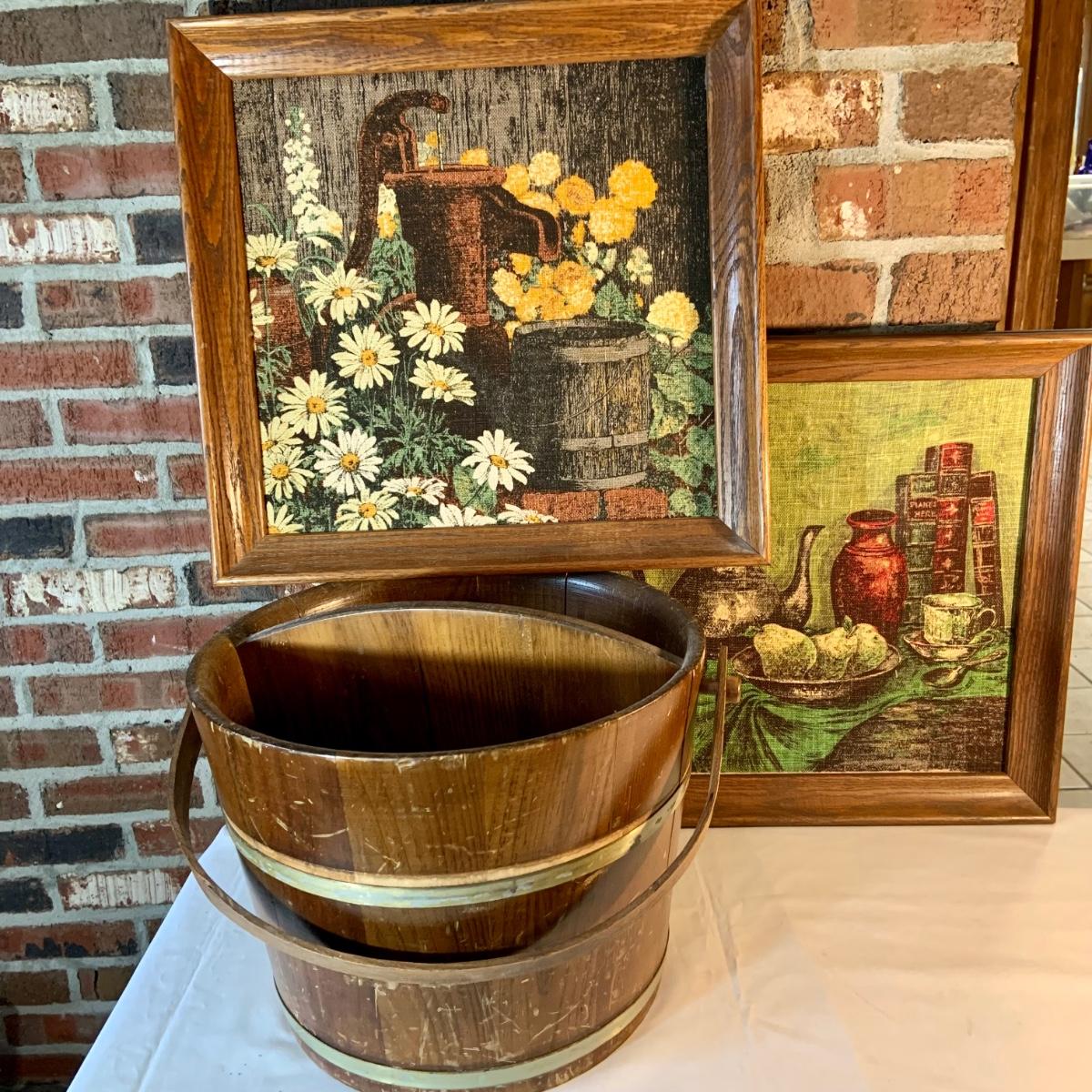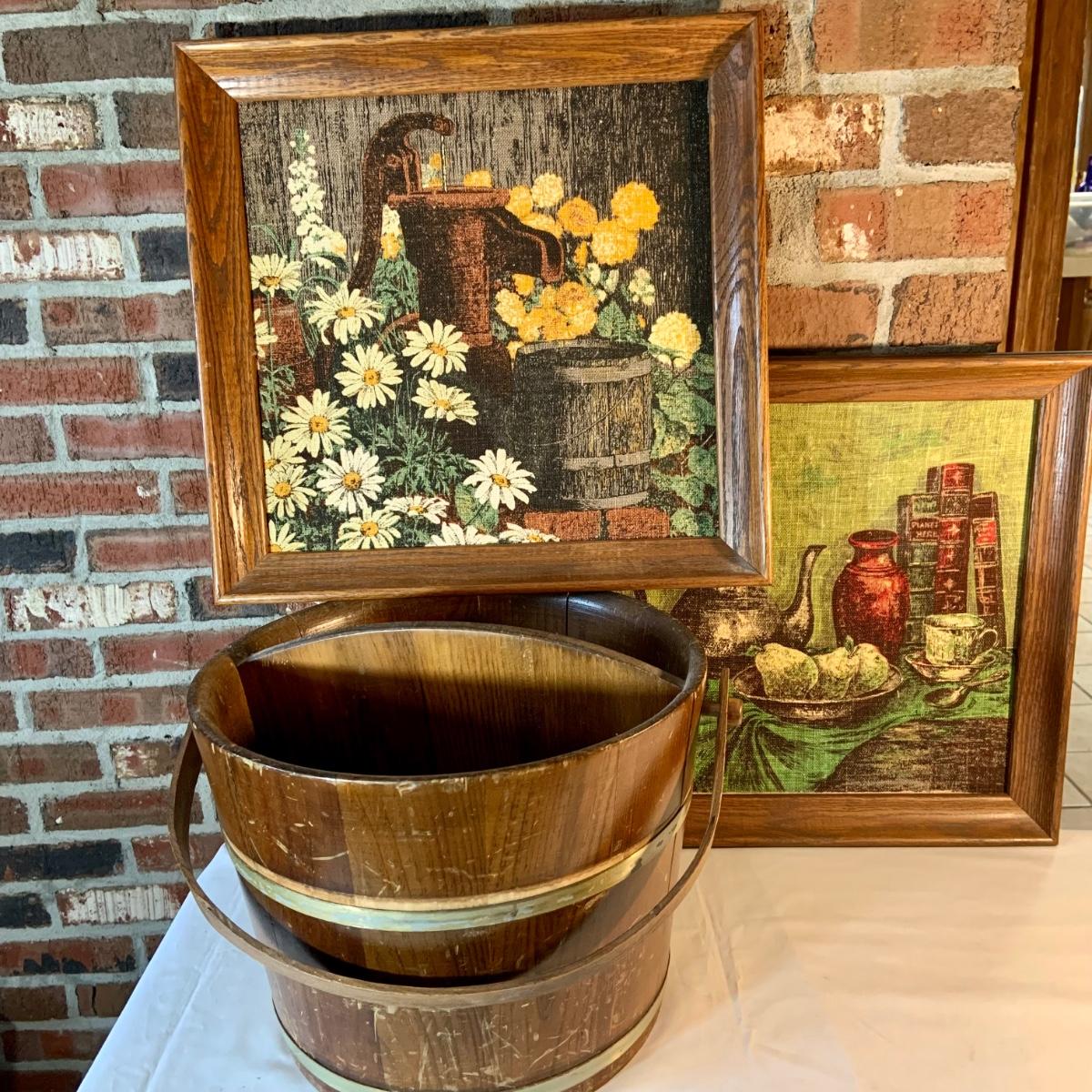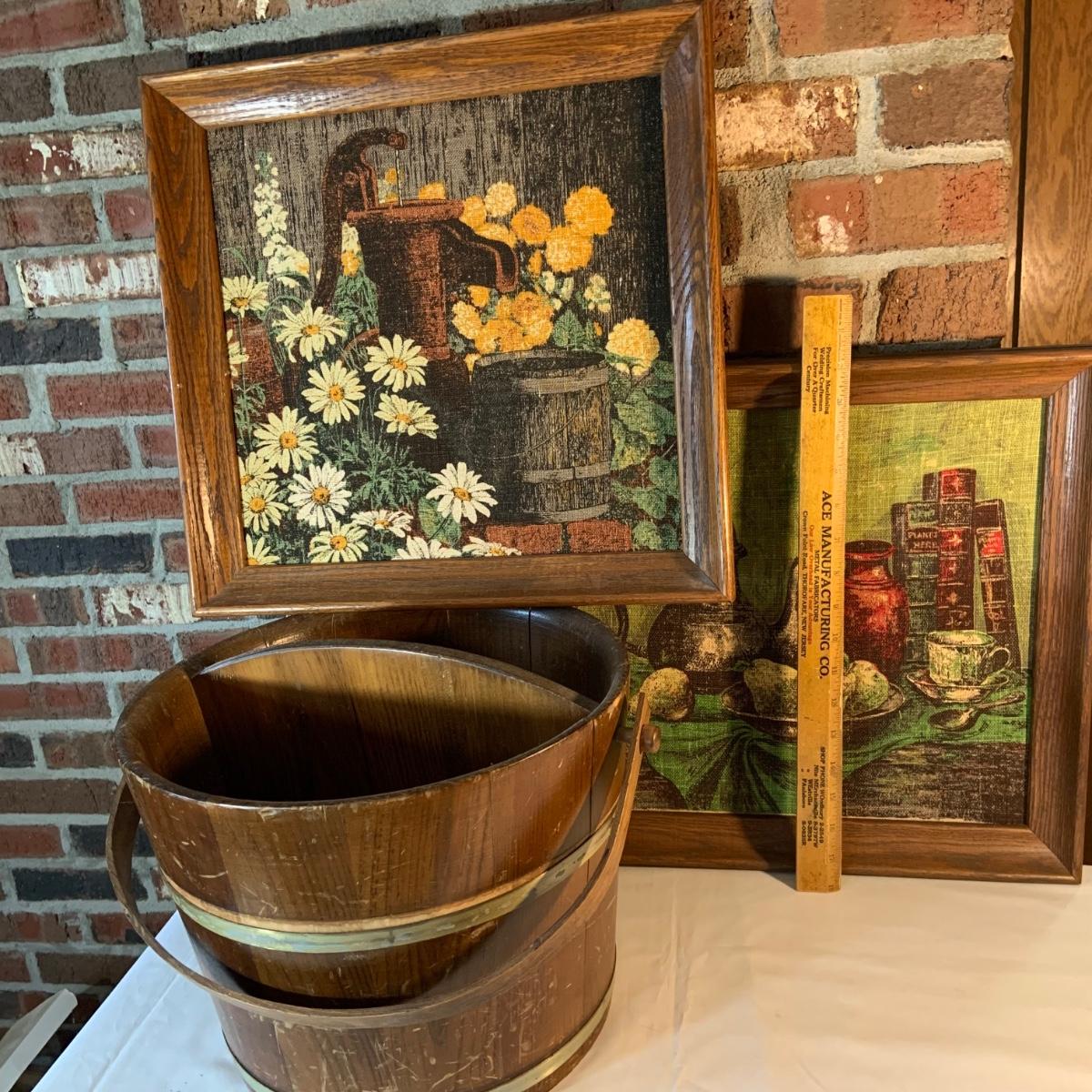 LOT:156G: C. L. Lane -Divided Wood Bucket with Handle and 2 KayDee Linen Hand Prints Framed Wall Art