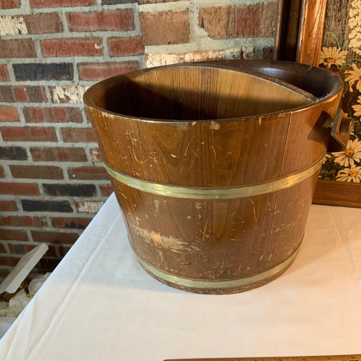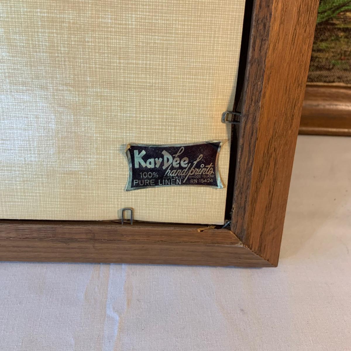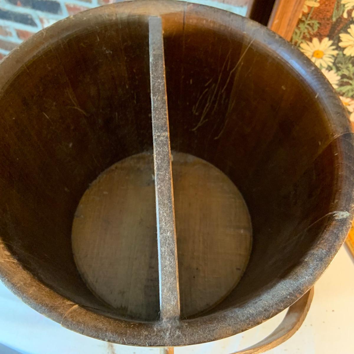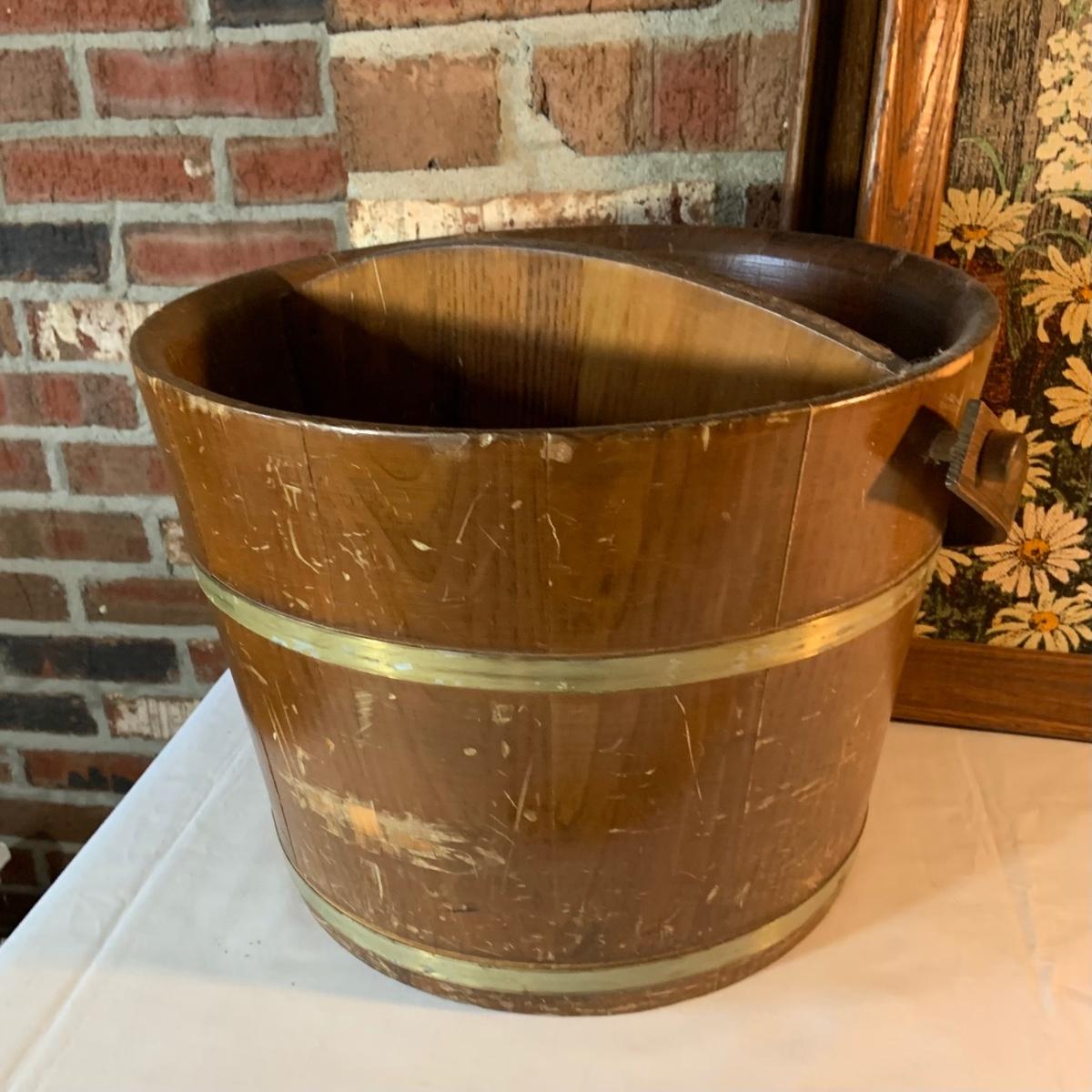 LOT:156G: C. L. Lane -Divided Wood Bucket with Handle and 2 KayDee Linen Hand Prints Framed Wall Art