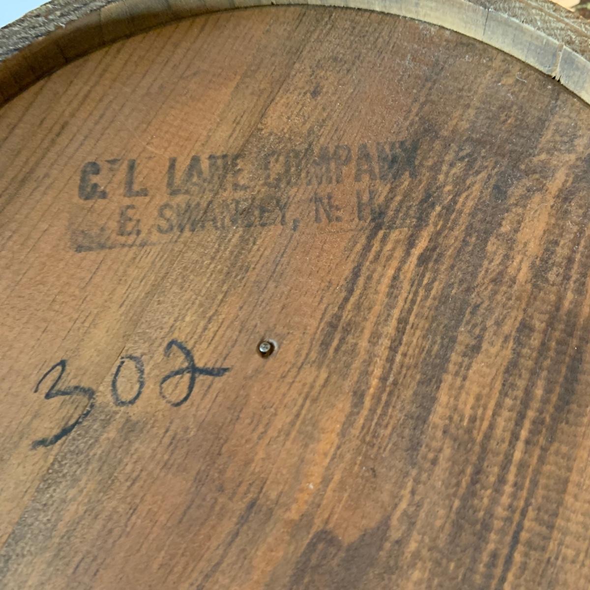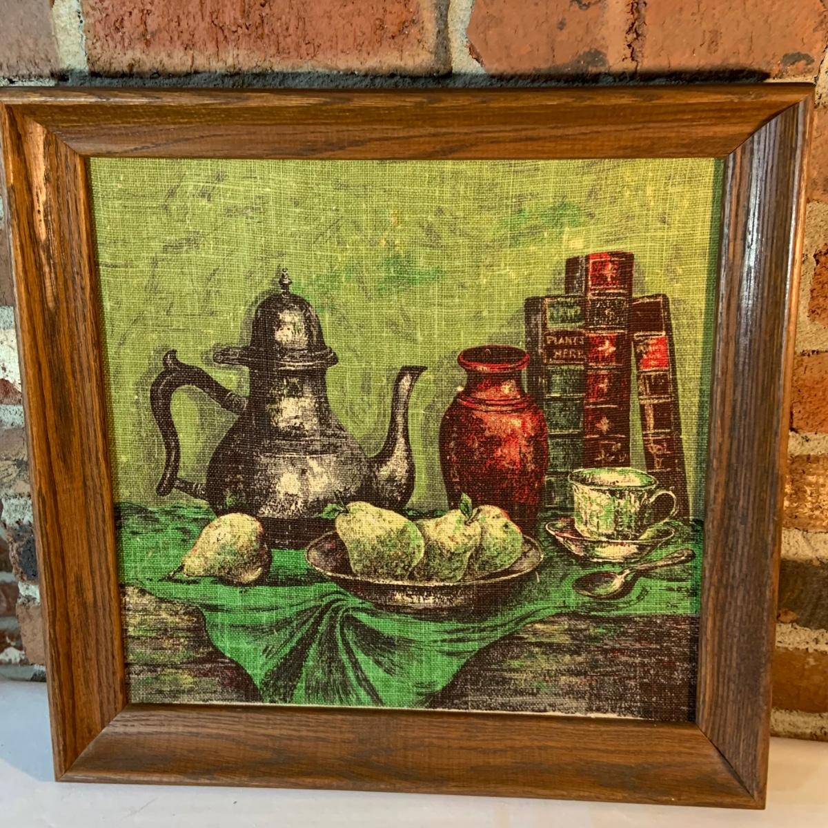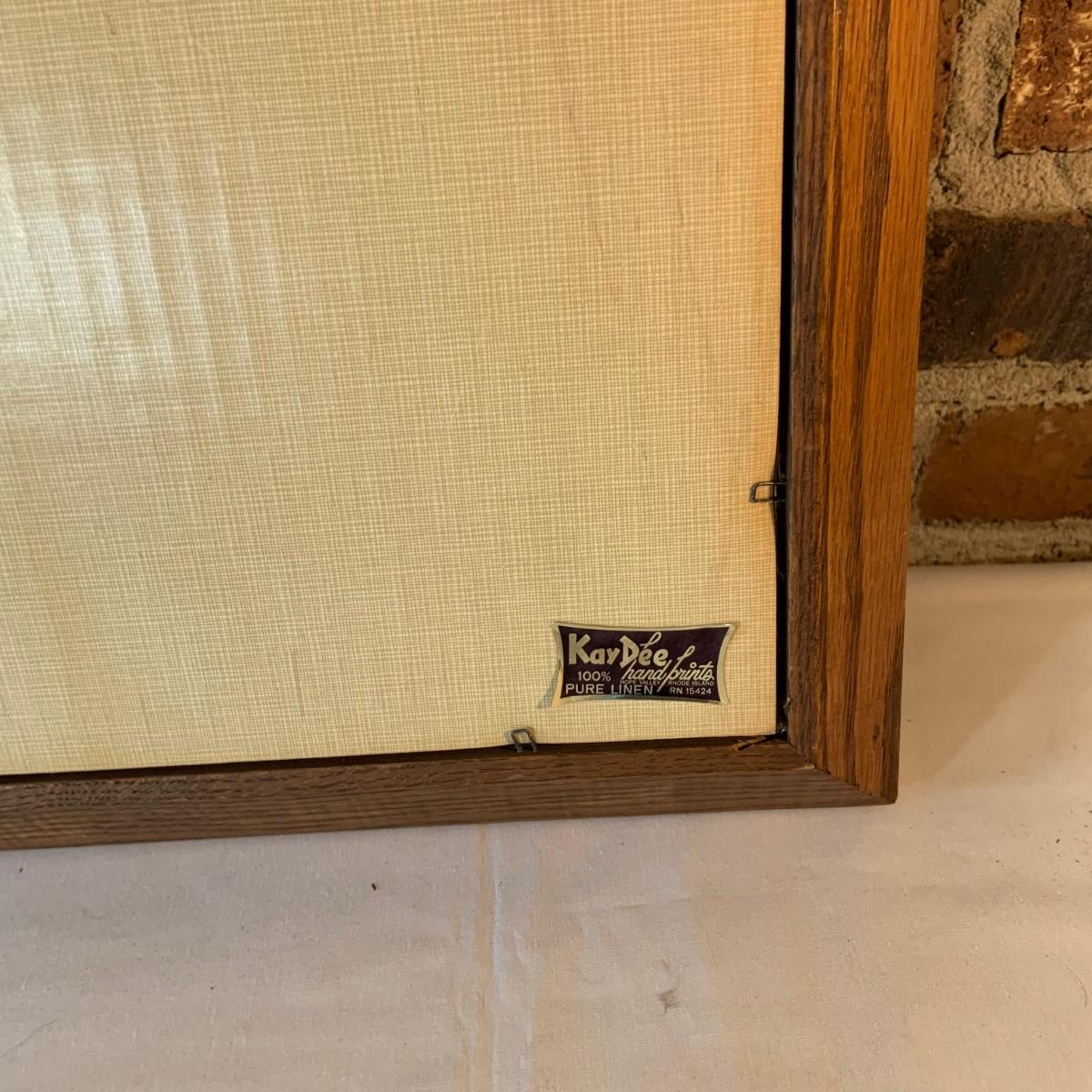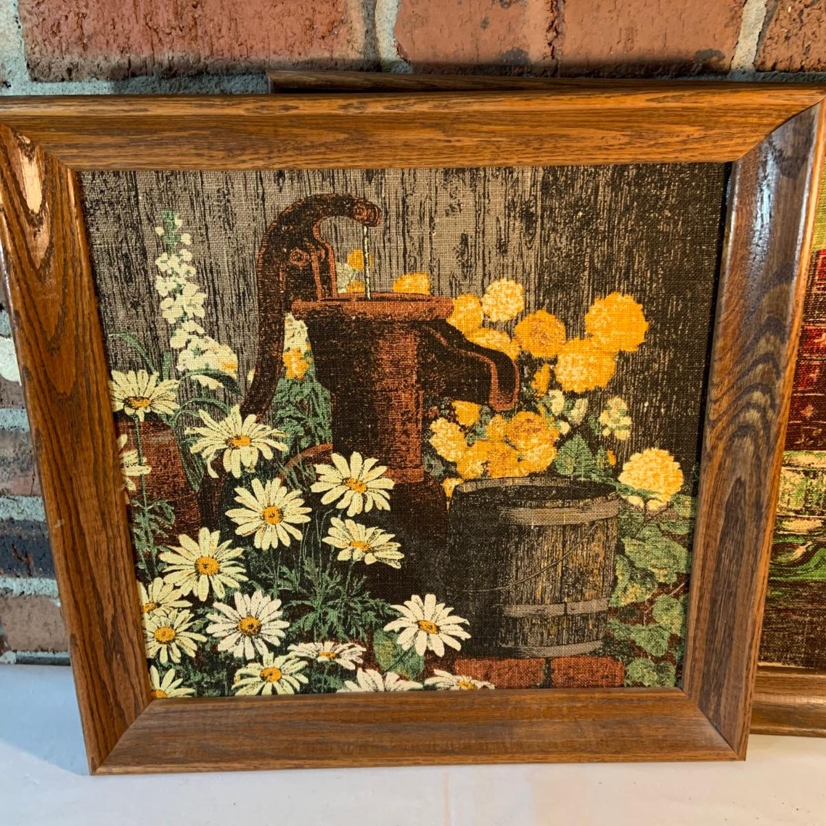 LOT:156G: C. L. Lane -Divided Wood Bucket with Handle and 2 KayDee Linen Hand Prints Framed Wall Art