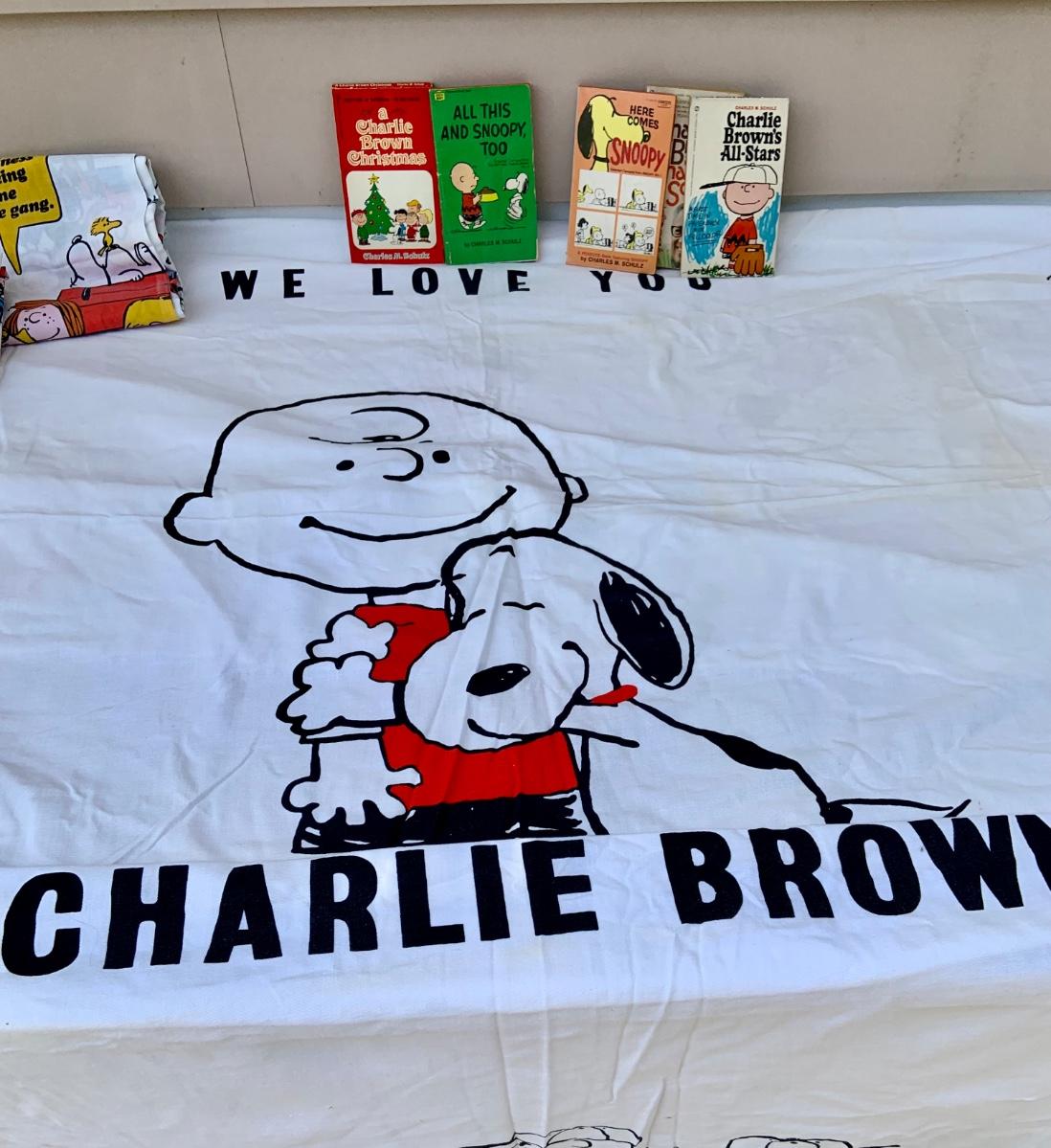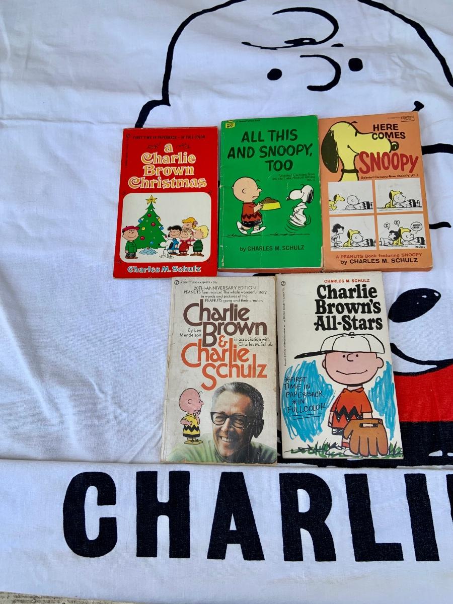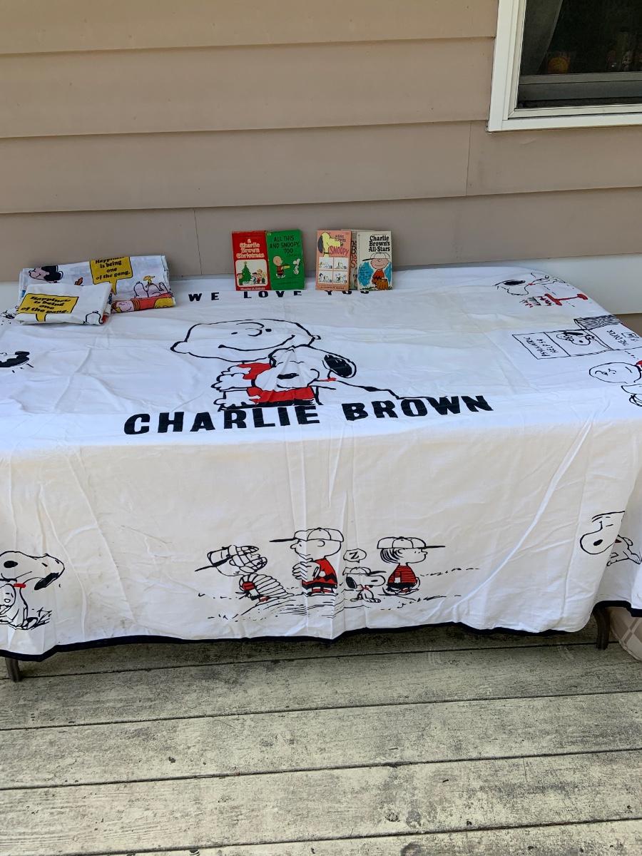 LOT:220: Charlie Brown- Snoopy - Peanuts Bedspread, Pillowcase, and Sheet with Vintage Peanuts Paperback Books