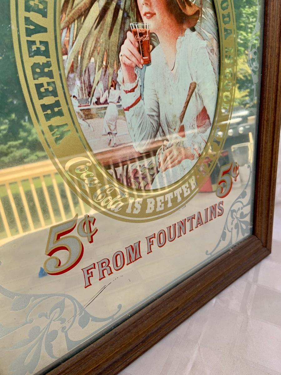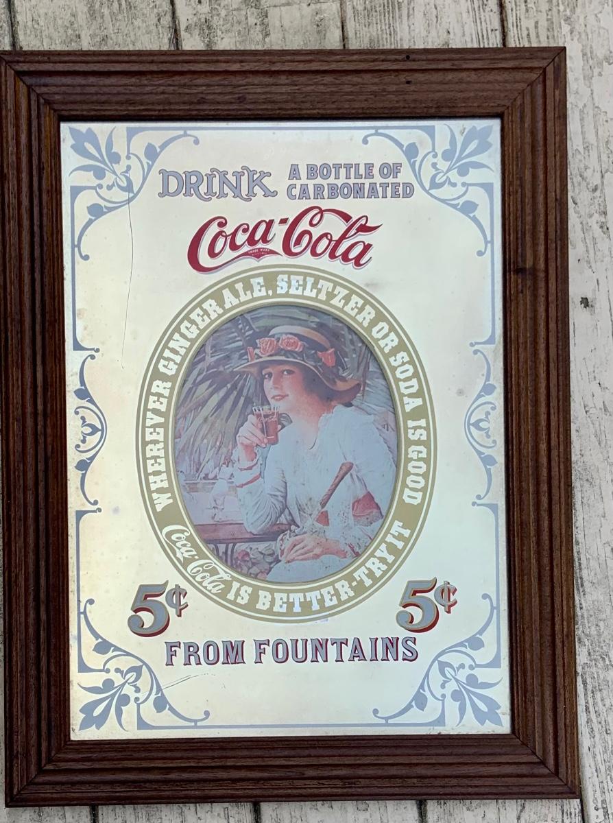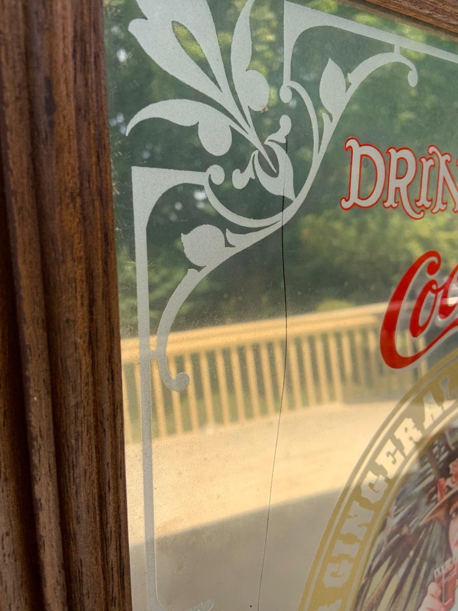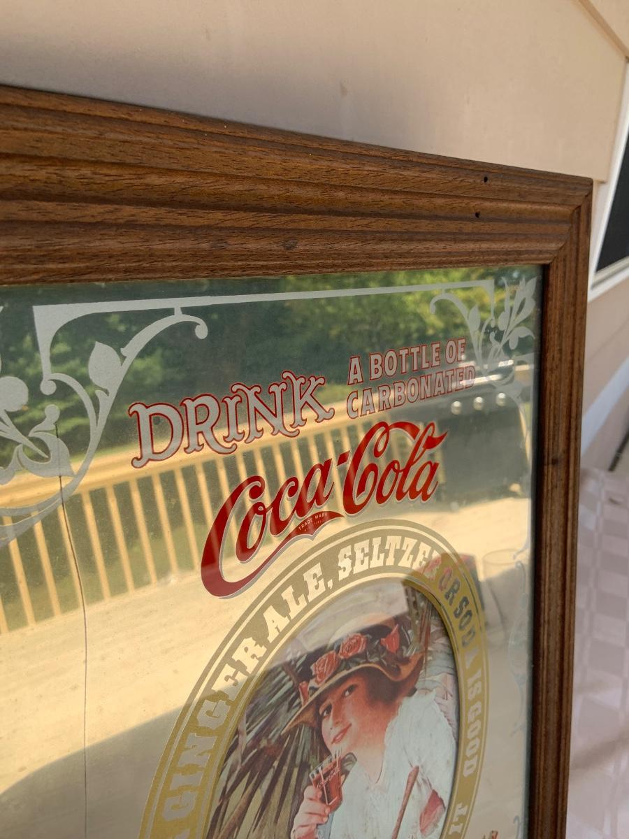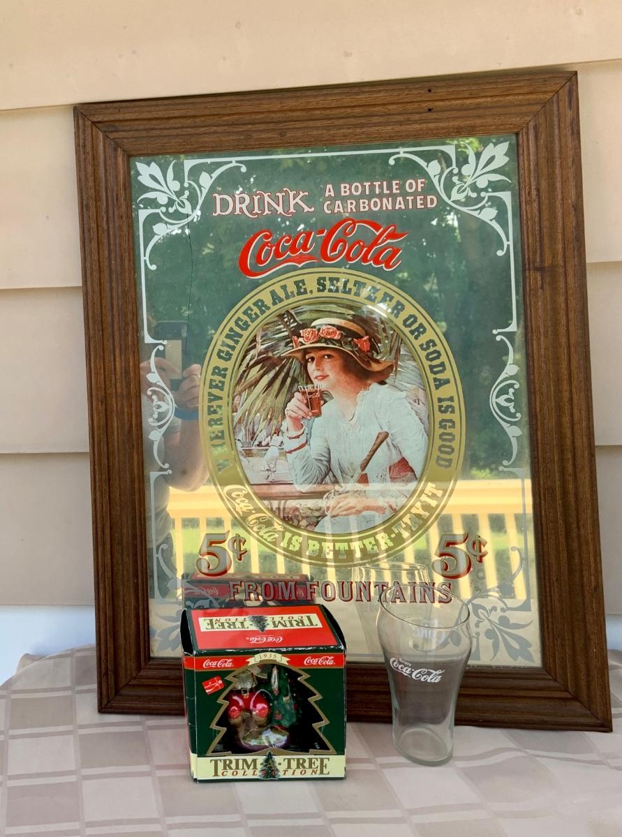 LOT:227G: Coca Cola Framed Mirror with Christmas Ornament and Coke Glass