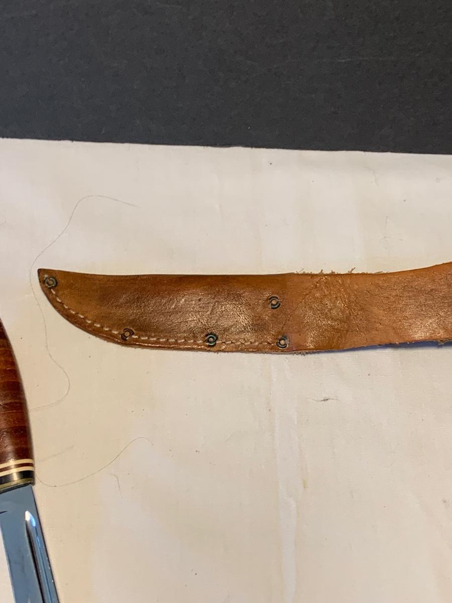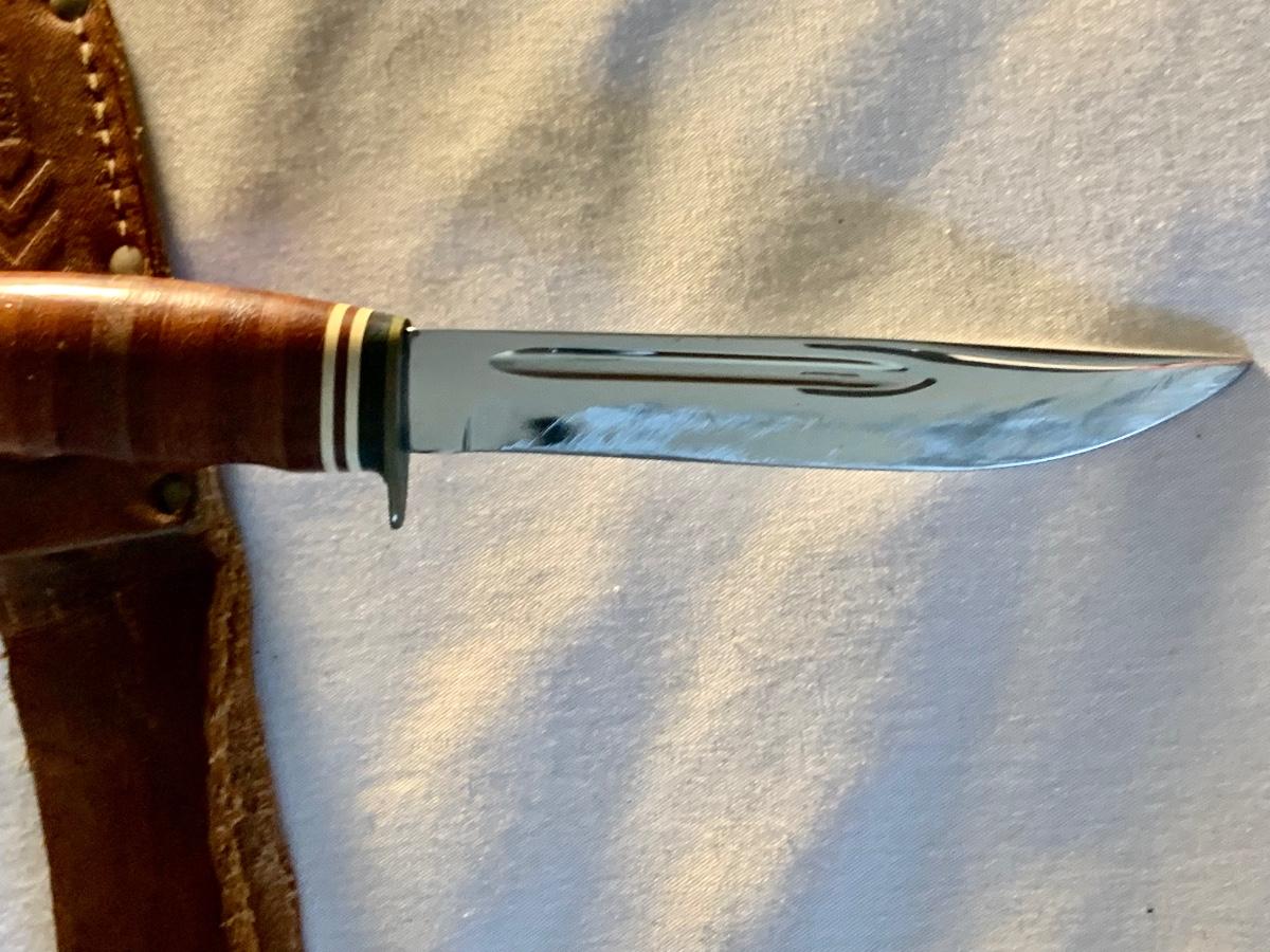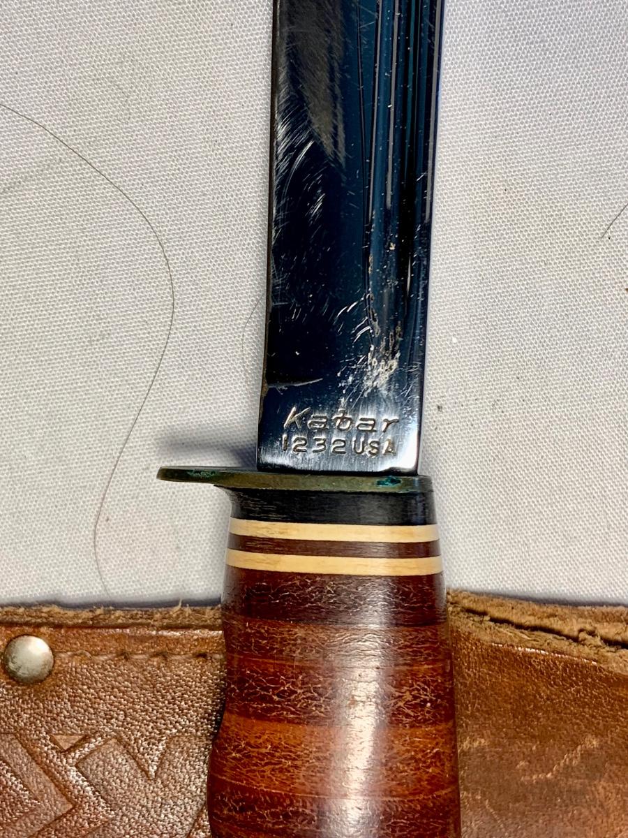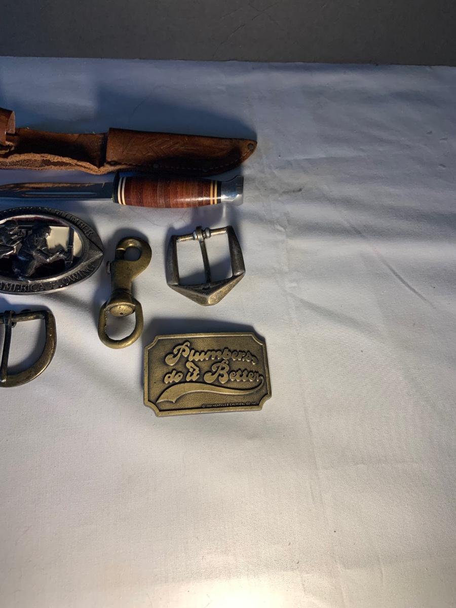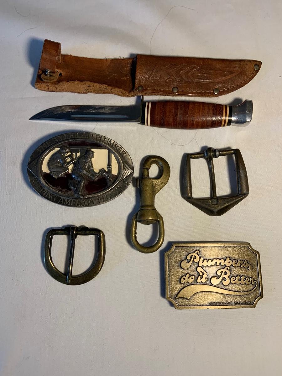 LOT:228G: Kabar 1232 Straight Edge Hunting Knife, Plumbers Belt Buckles and More