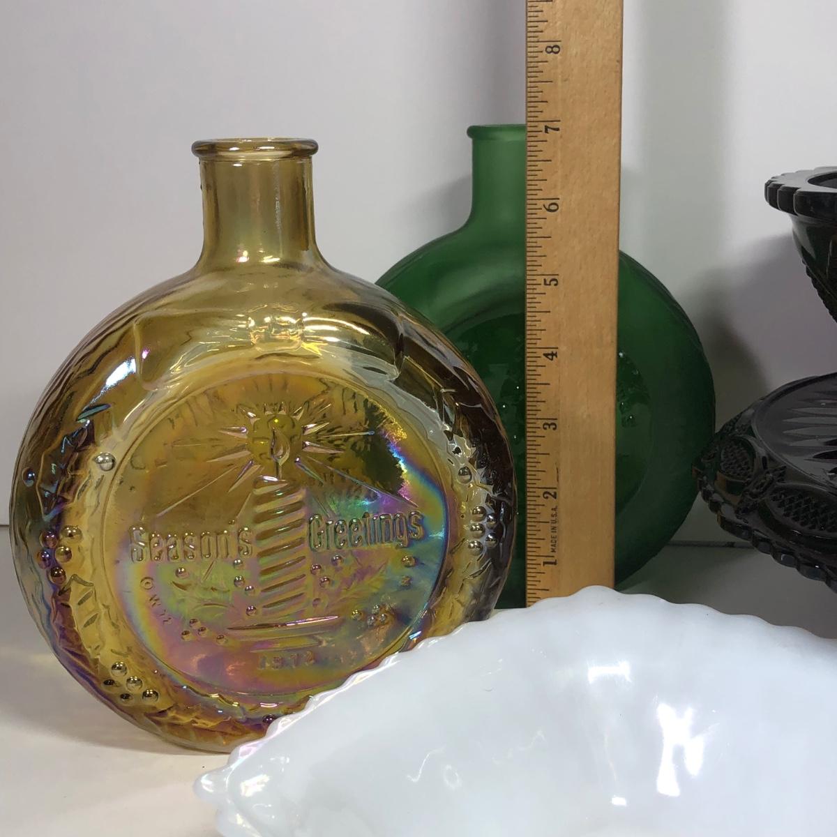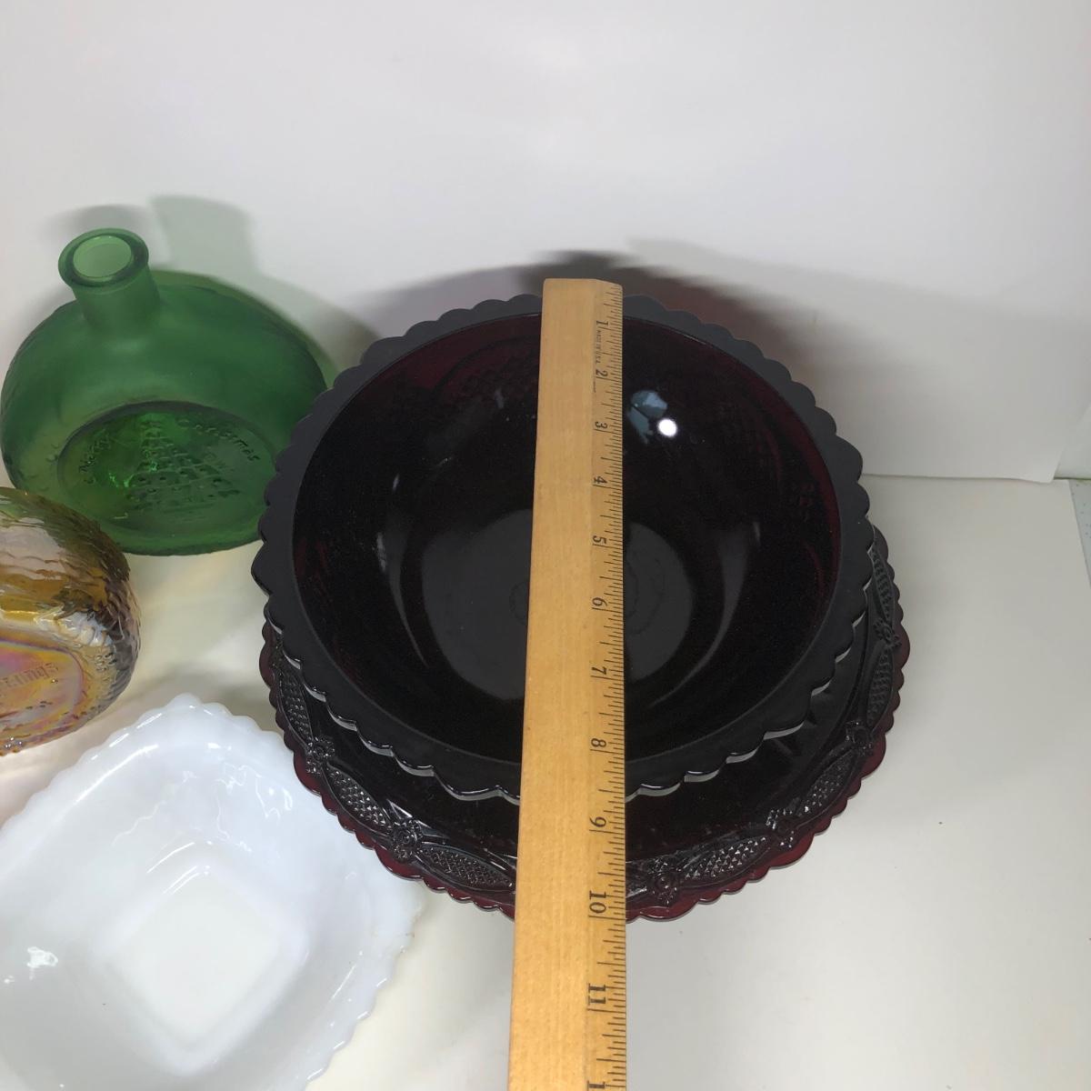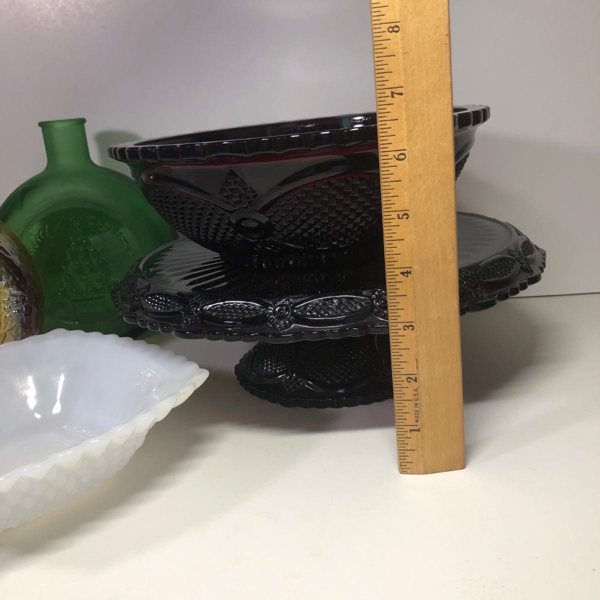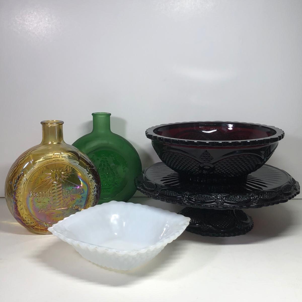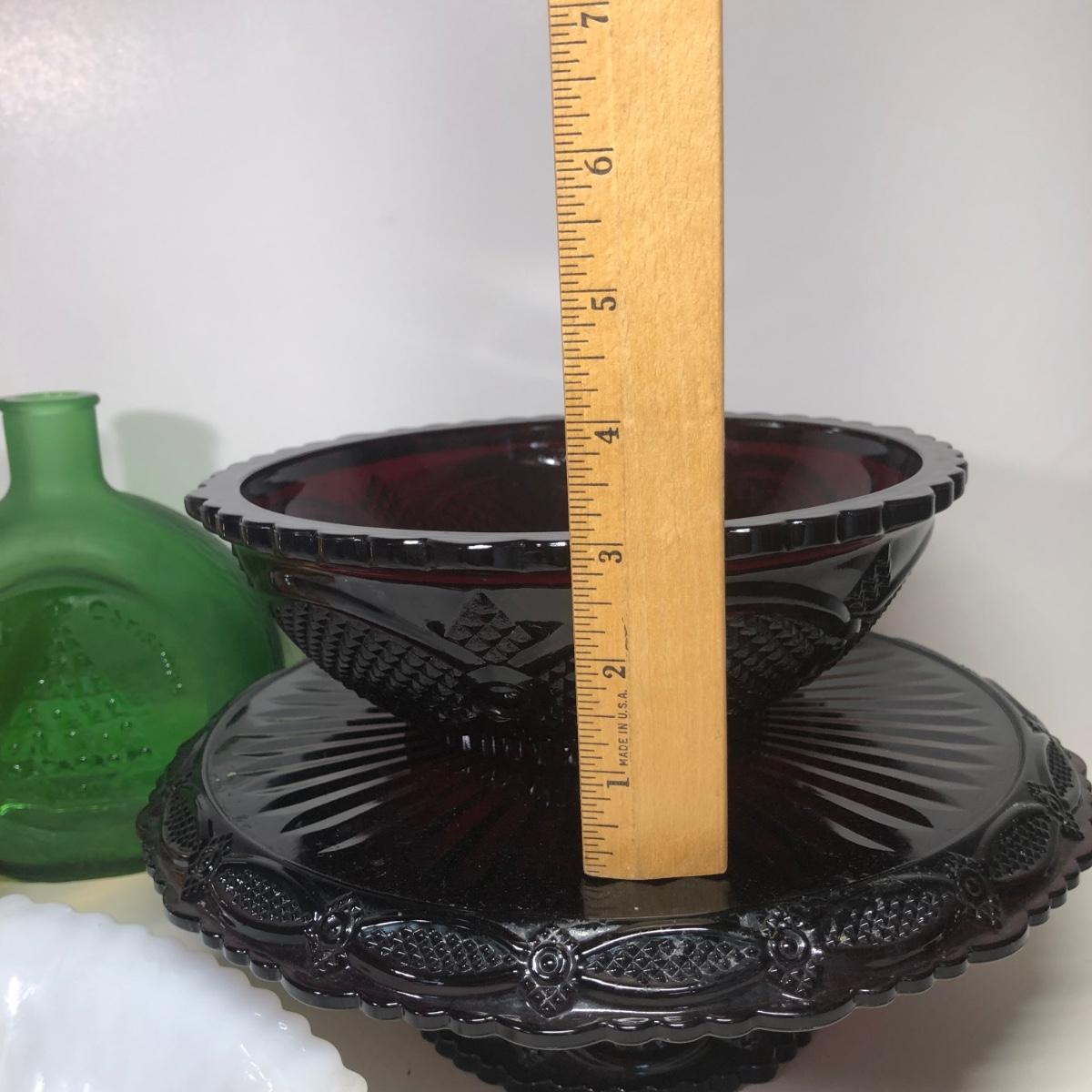 LOT 245M: Wheaton Christmas Bottles, Avon Cape Cod Collection Ruby Red Cake Plate & Serving Bowl & Milk Glass Candy Dish