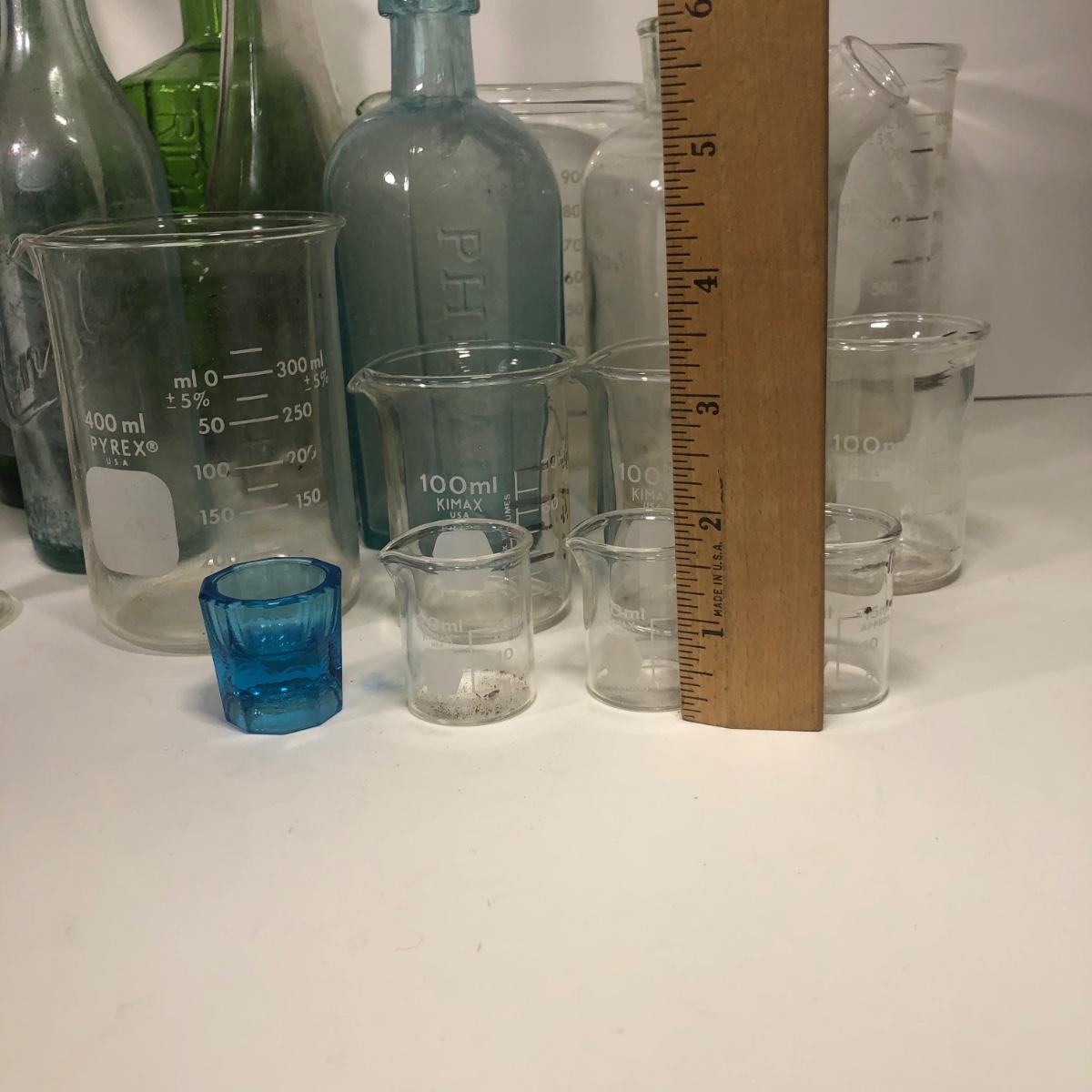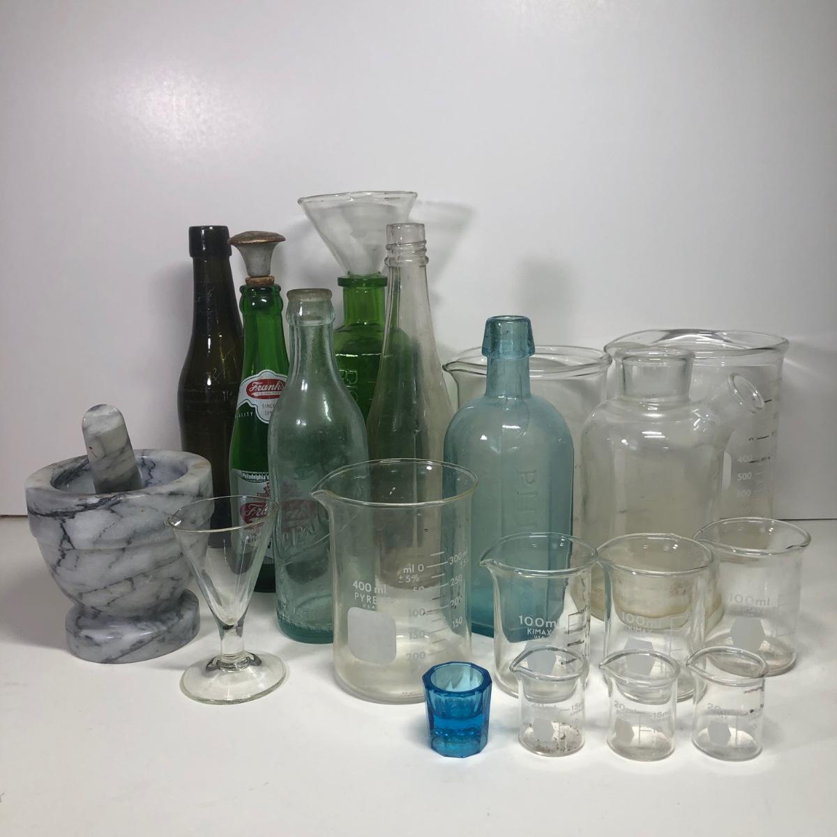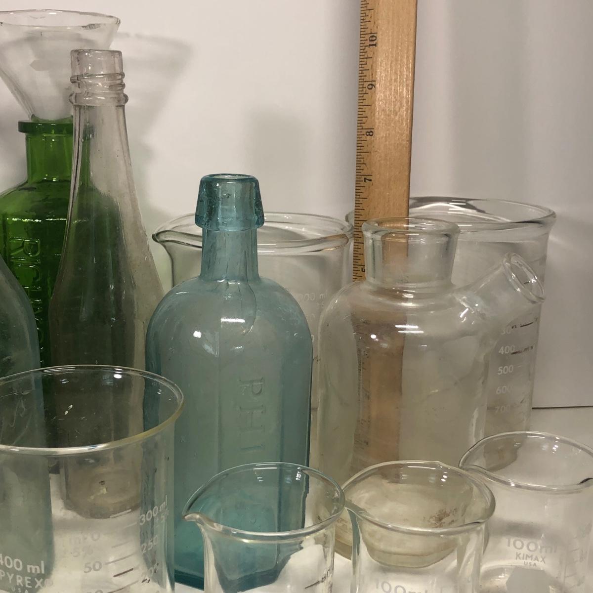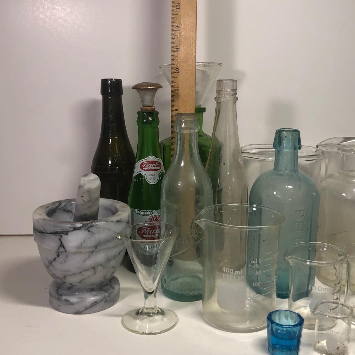 LOT 249M: Pyrex Beakers, Bellco Glassware (from Vineland, NJ), Marble Mortar & Pestle, Vintage Glass Bottles & More