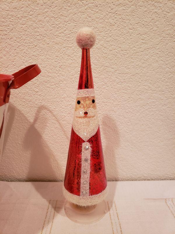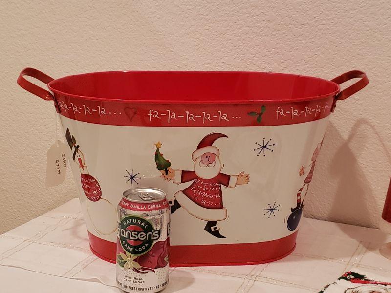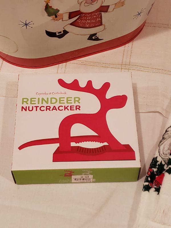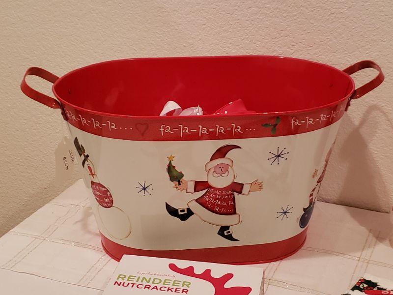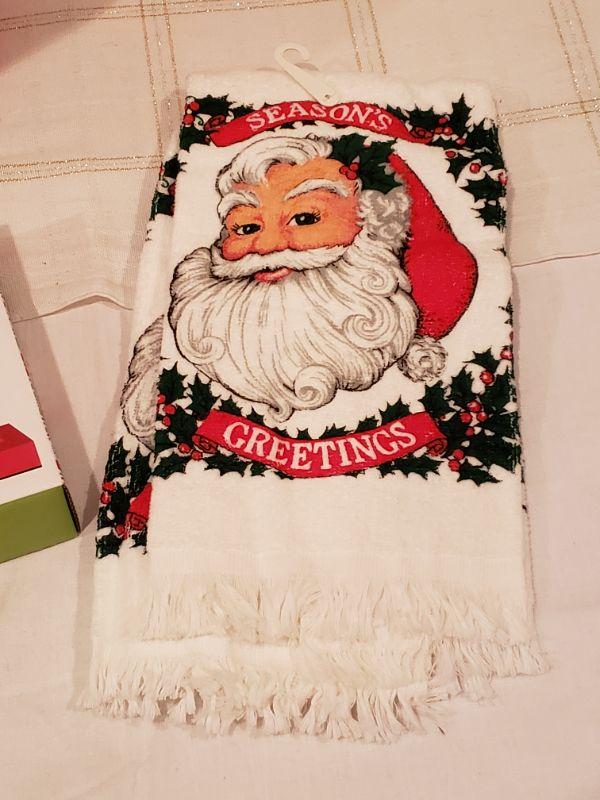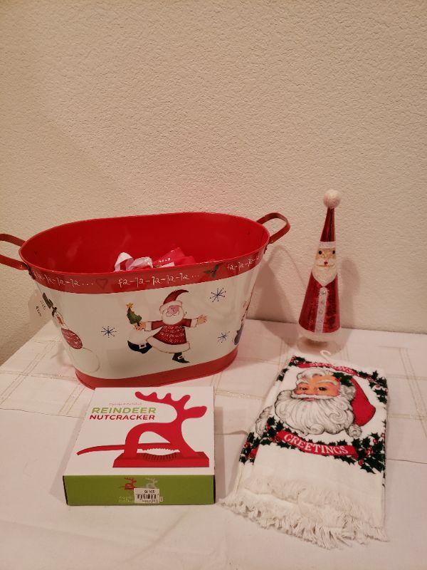 Lot 919: New Holiday Reindeer Nuts, Hand Towels, Glass Light Up Santa and Santa Metal Container