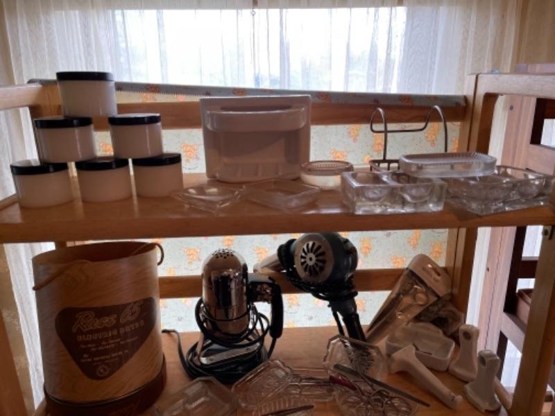 Lot 91B1. Two vintage hair dryers, vintage milk glass cosmetic containers, soap caddies, etc.--Was $75 - -NOW $18.75