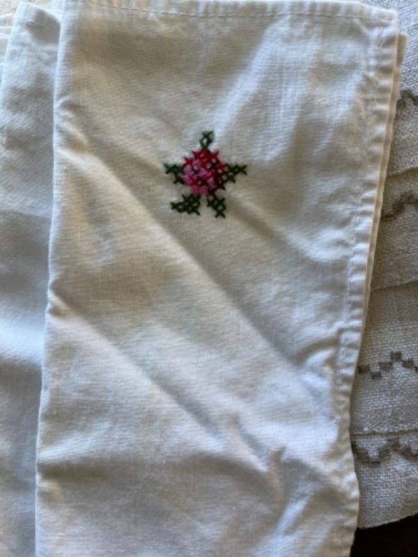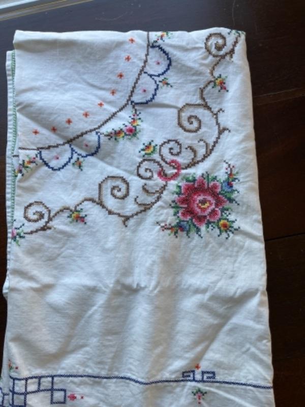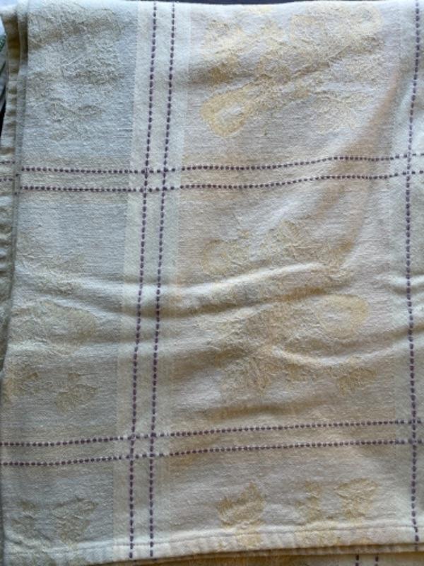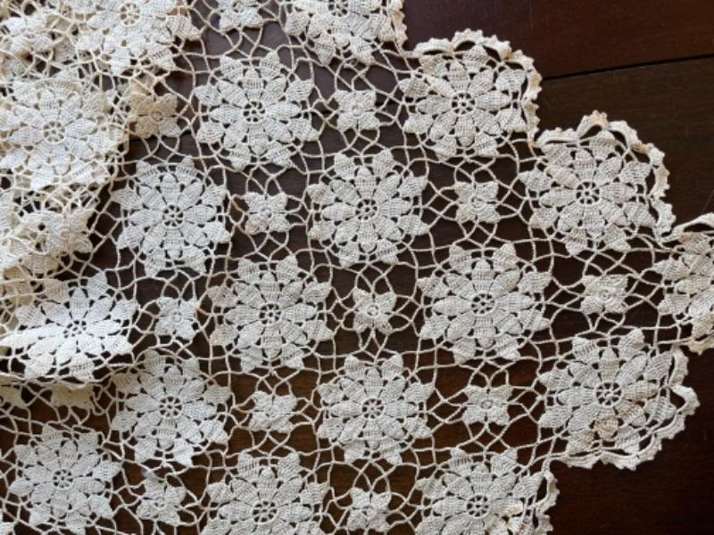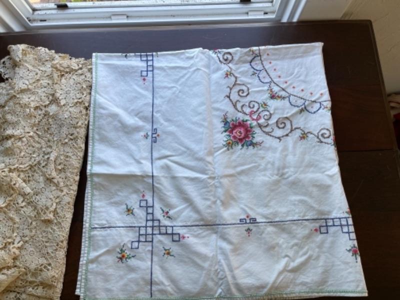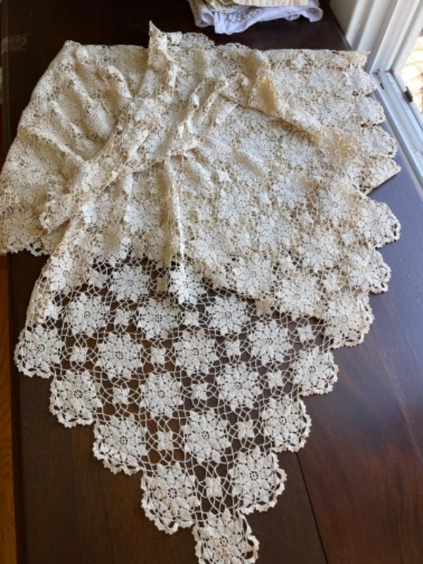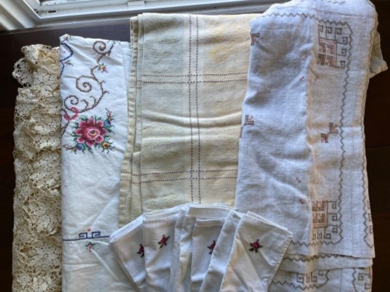 Lot 91BR. Vintage crocheted lace tablecloth, cotton napkins, table linens--$85