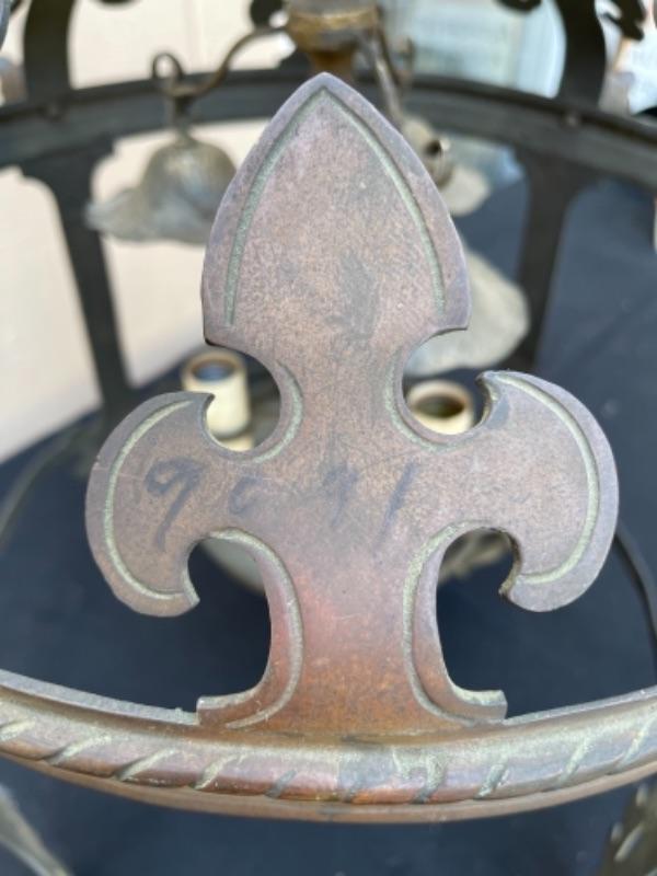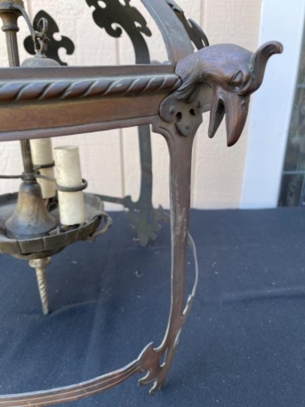 Lot 91DM. Vintage French Medieval Gothic hanging light, bronze and wrought iron, cage with three arms, chainlink, hardwire, 26” T x 22” diameter from birds beak to beak “” $90.00
