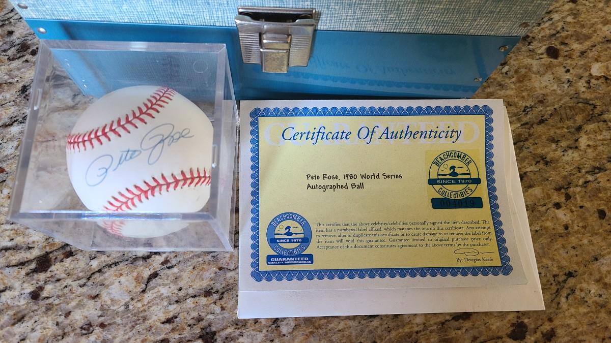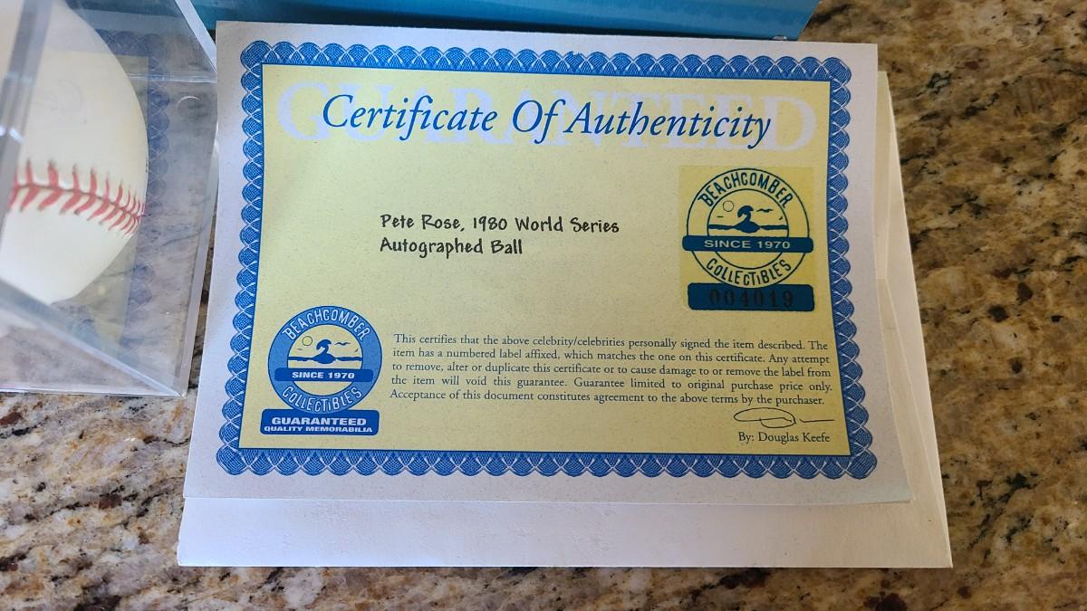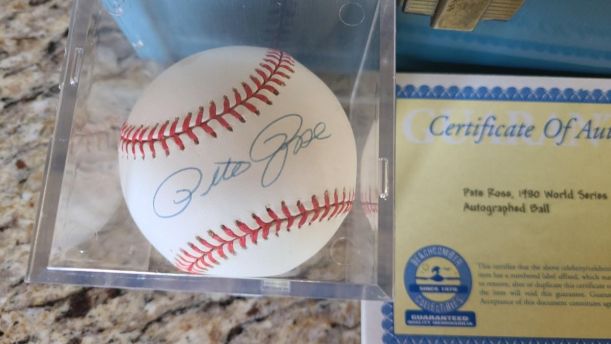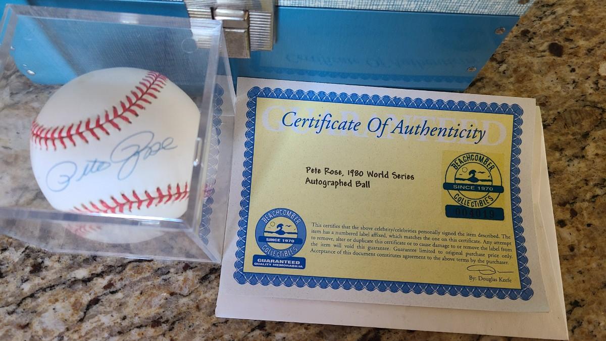 Pete Rose autographed ball with COA. Please see all pictures for content of the lot, condition of the lot, and measurements if taken. Pictures are the best representation of the items listed and items are untested unless indicated in description. Thank you for looking and have fun bidding!