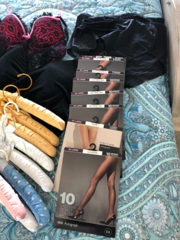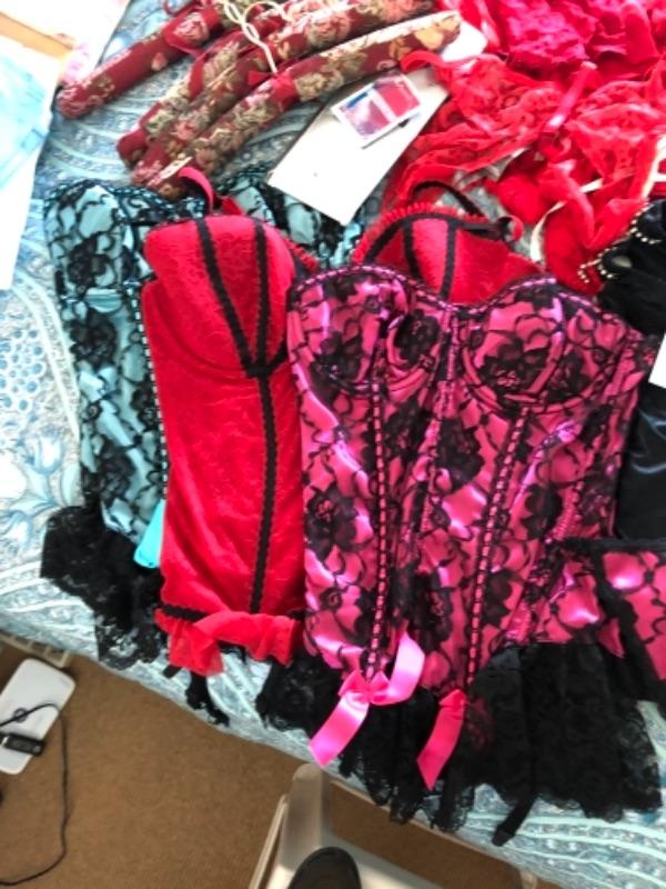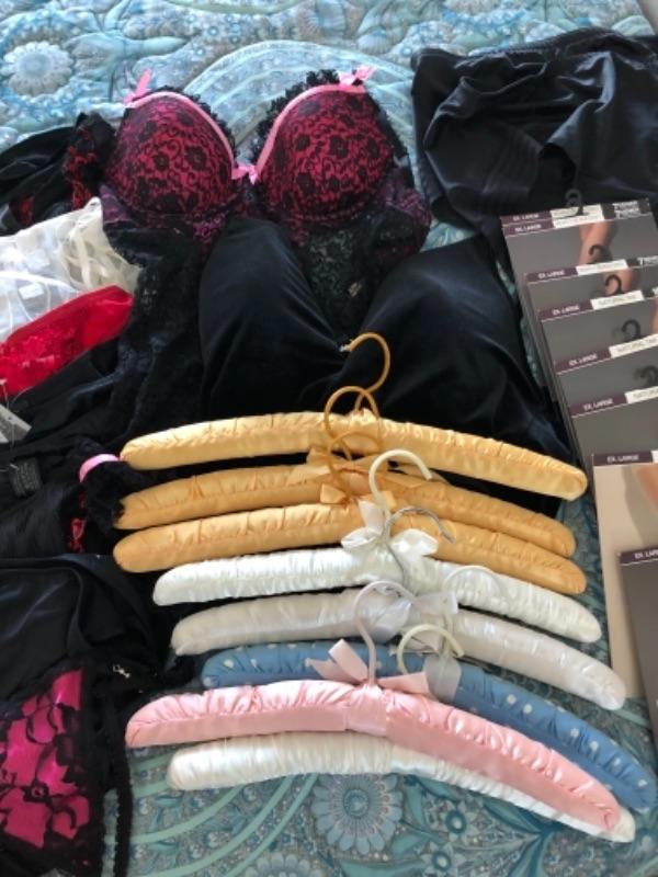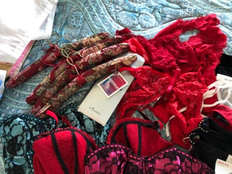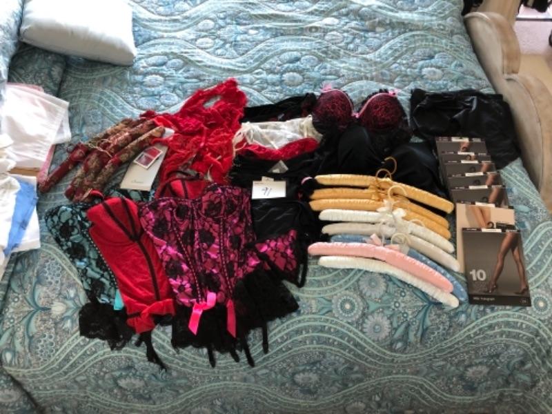 Lot 91U. Large set of lingerie (women’s large/extra large) underwear, nylons, garter belts, padded hangers, lace teddies, bustiers, etc,--$105