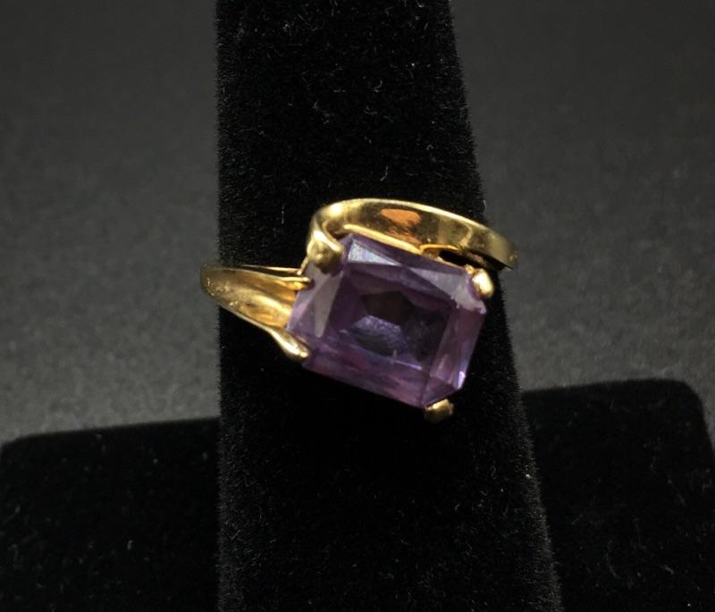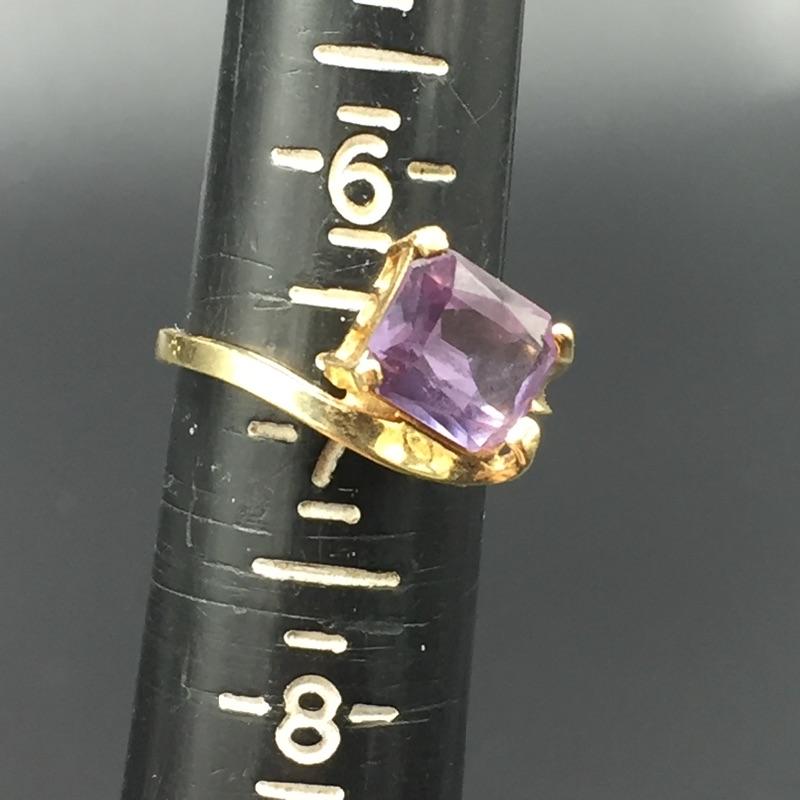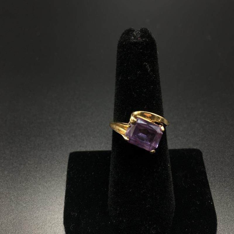 Lovely 10K gold ring with purple stone that looks like Amethyst but cannot be verified. Ring measures size 6.75 - See pictures.