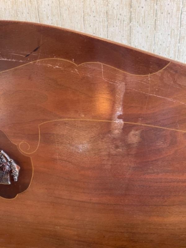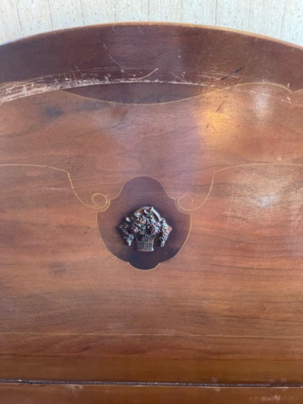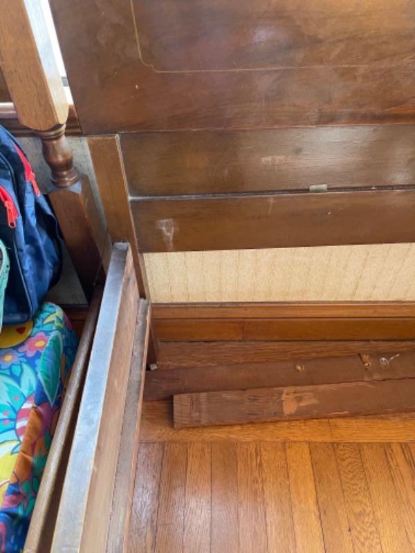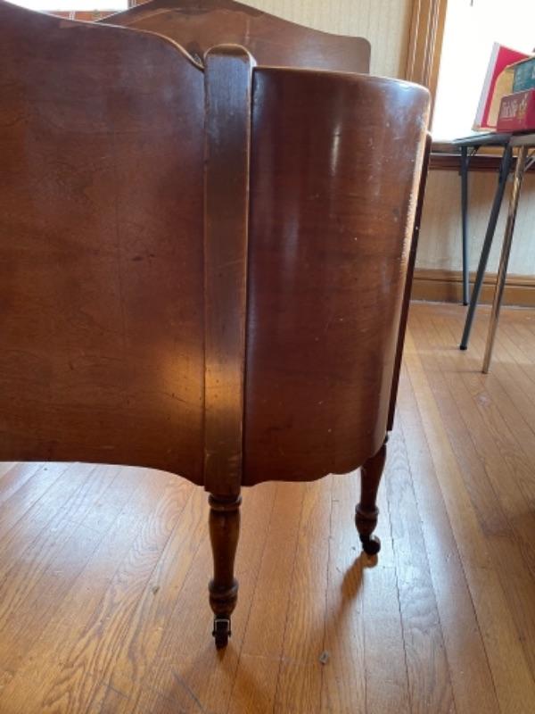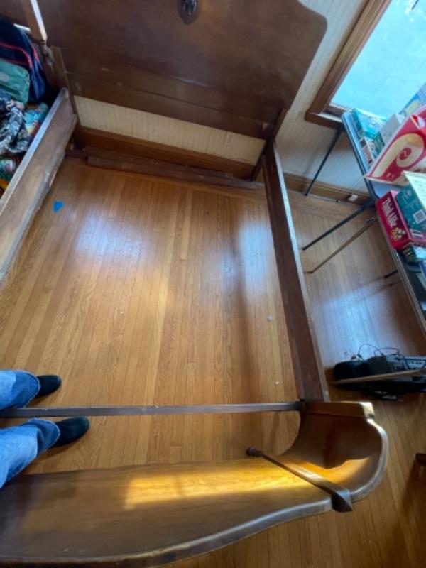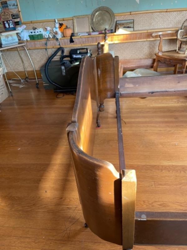 Lot 92. 1940s double bedframe (77.5”L x 54.5”W), wood with curved footboard on wooden casters--Was $35 - - Now $20
