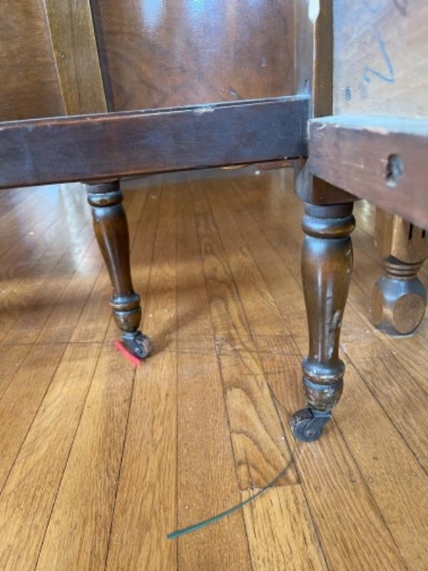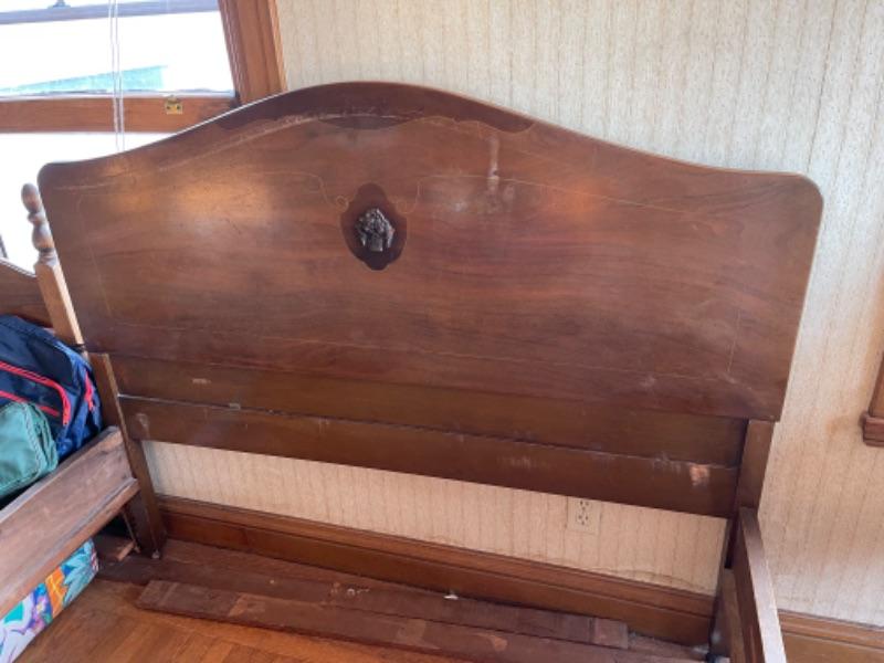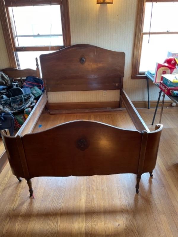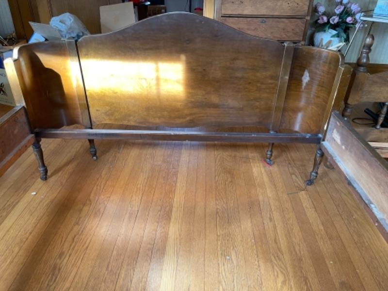 Lot 92. 1940s double bedframe (77.5”L x 54.5”W), wood with curved footboard on wooden casters--$20