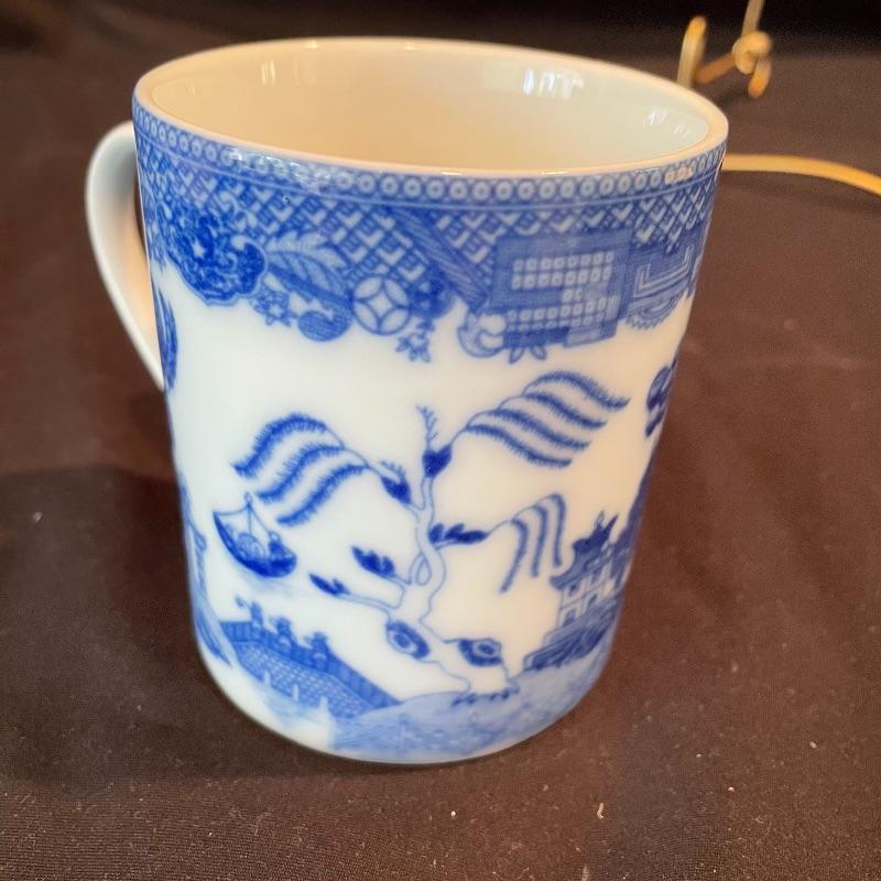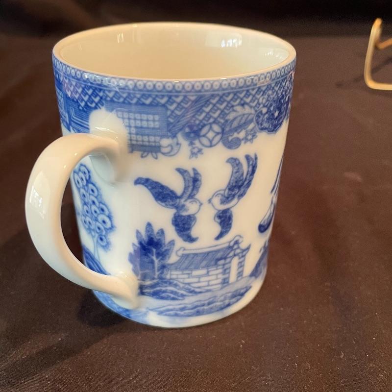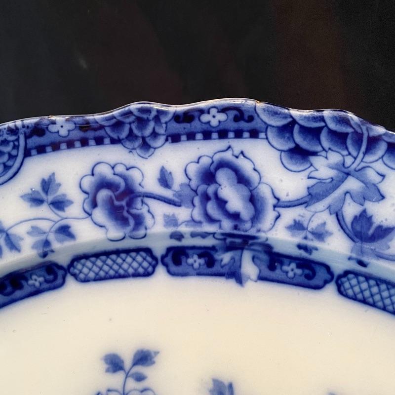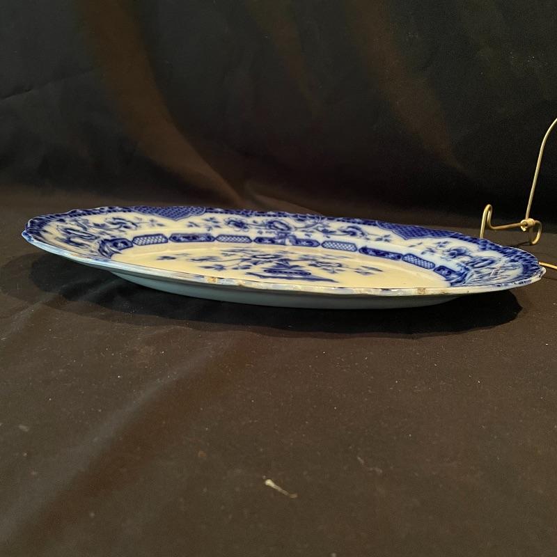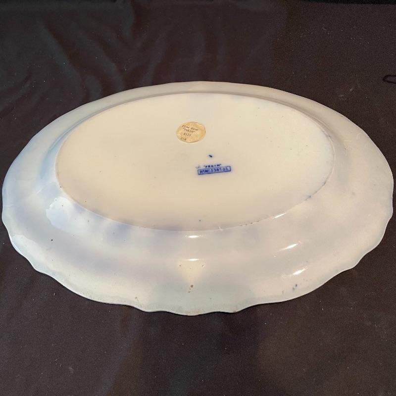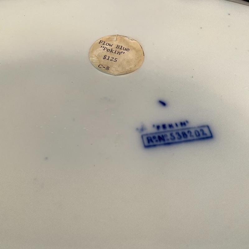 Here’s a beautiful, vivid duo for dining and decor. Lot features a 16” x 12.5” Flow Blue platter marked “Pekin” Ro. No. 538202. A quick internet search found the piece is probably by Albert Jones, Staffordshire. The platter is in very nice condition without cracks or chips. There are some blemishes on the edge of the plate, an example is noted in images. Platter is paired with a intricately designed mug. See images, shipping available.