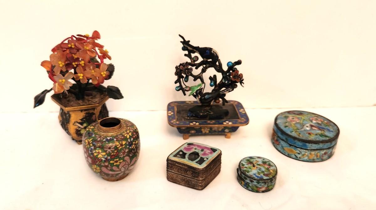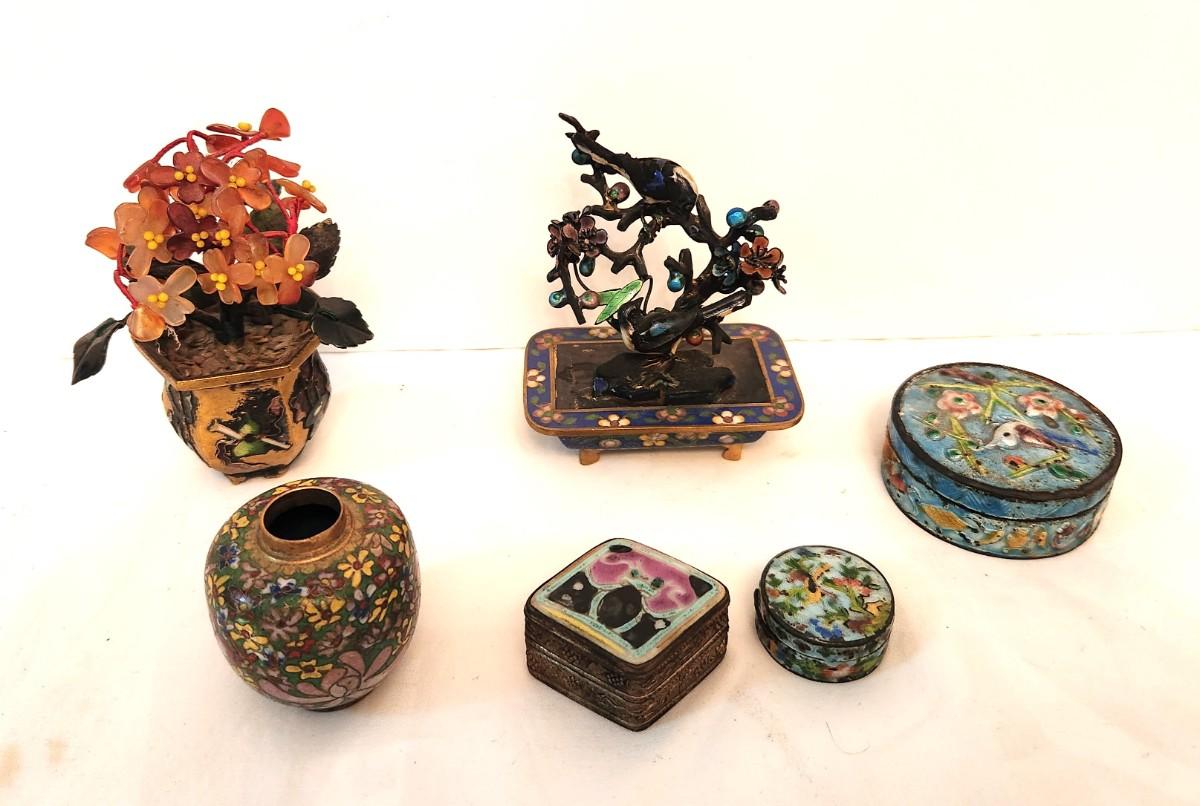 Nice 6 piece lot of Asian style decorator Cloisonne - you get all you see here. Small vase, 2 florals, 4 boxes. All in good vintage condition.