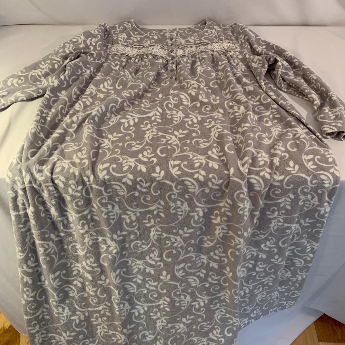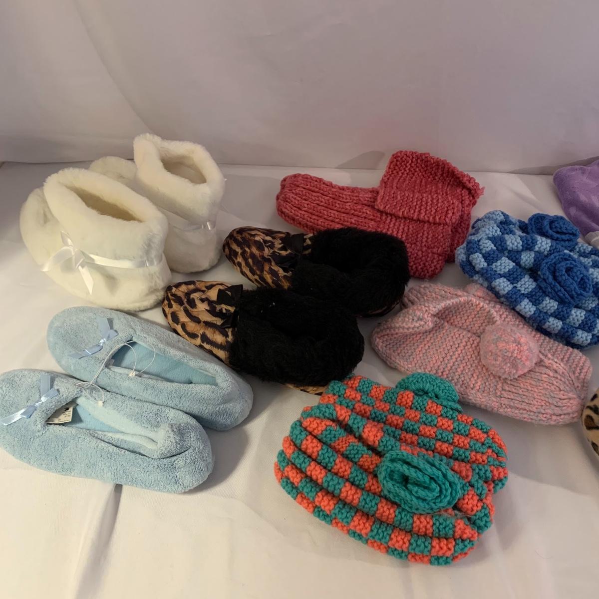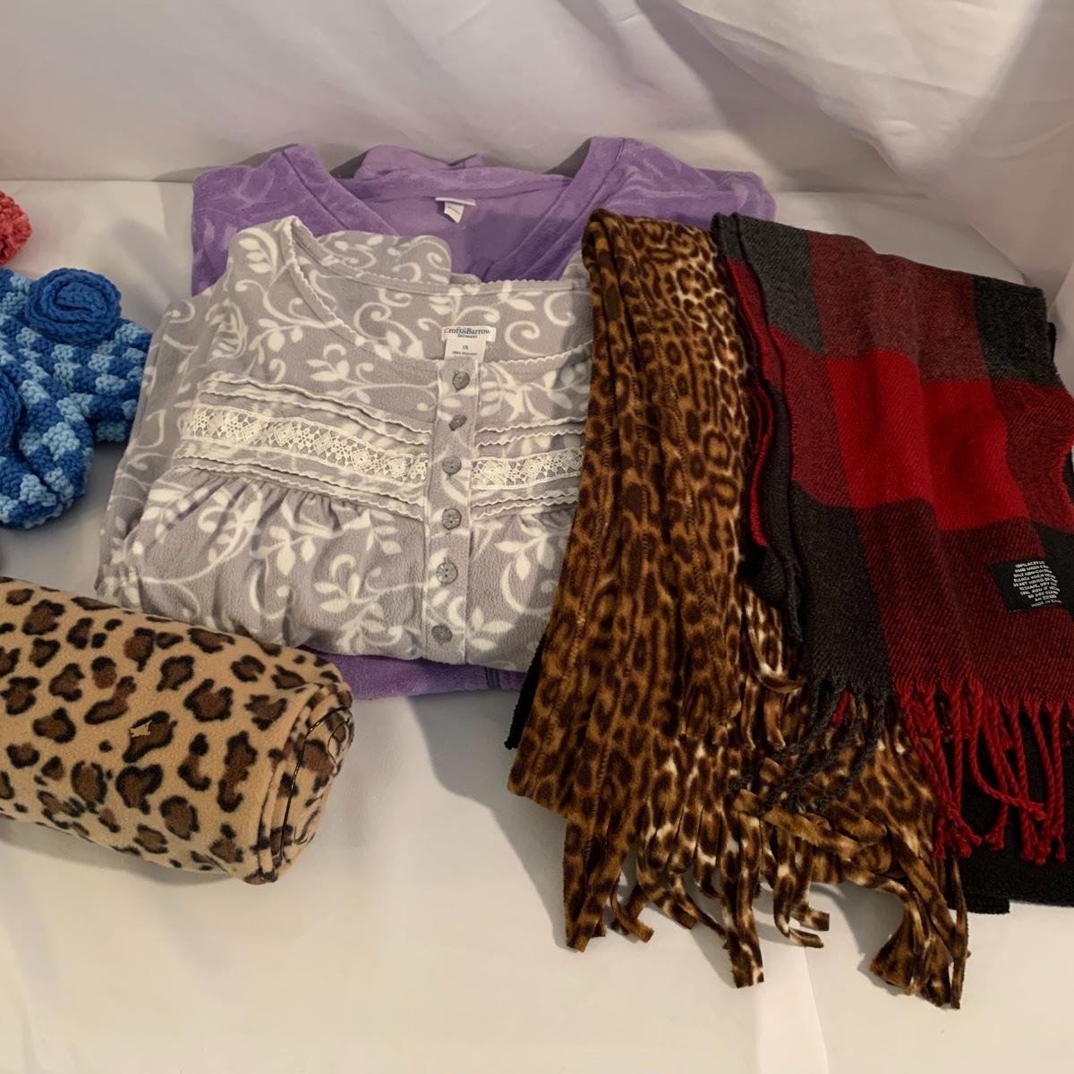 This lot includes women’s nightwear, such as, slippers and nightgowns, as well as, winter accessories. The winter accessories include three fleece scarves, a matching set with gloves, a scarf, and a hat. Some of the slippers are crochet booties and the others are fuzzy slippers. The nightgowns are both by the brand Croft&Barrow. The purple one is a size 3X and the grey nightgown is a size 1X. Shipping available.