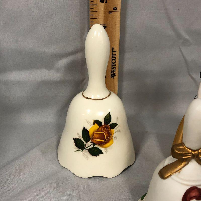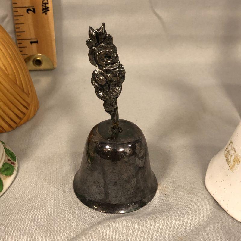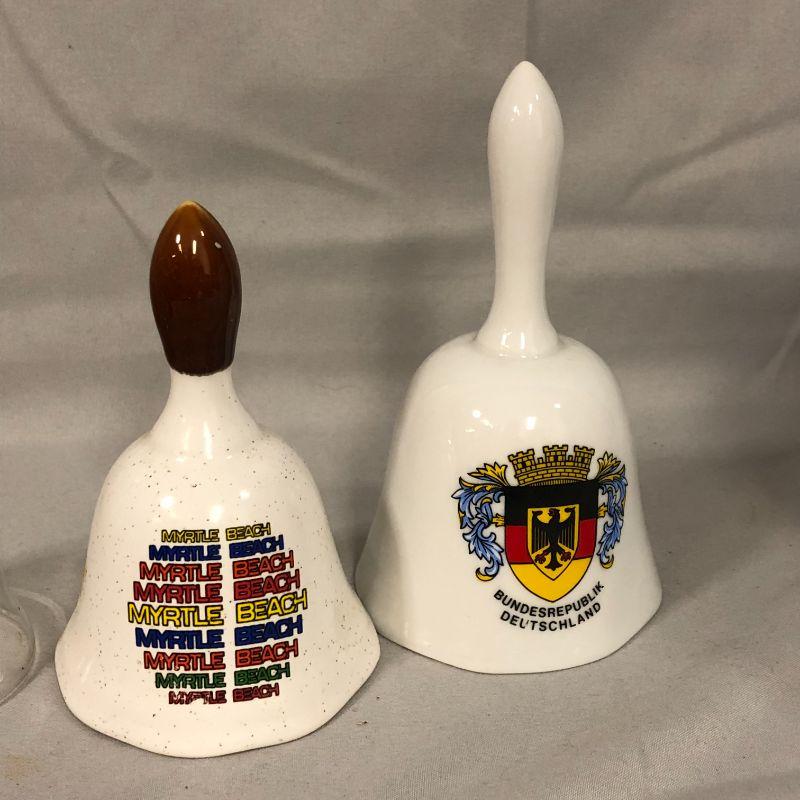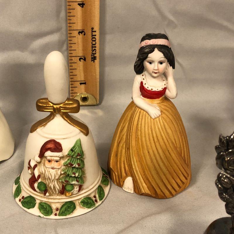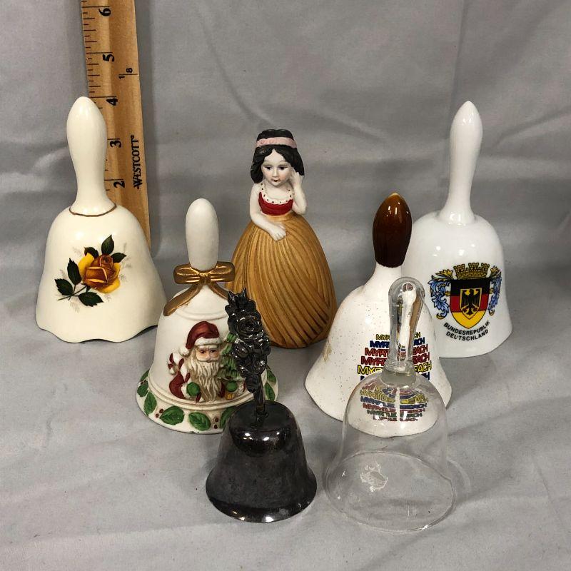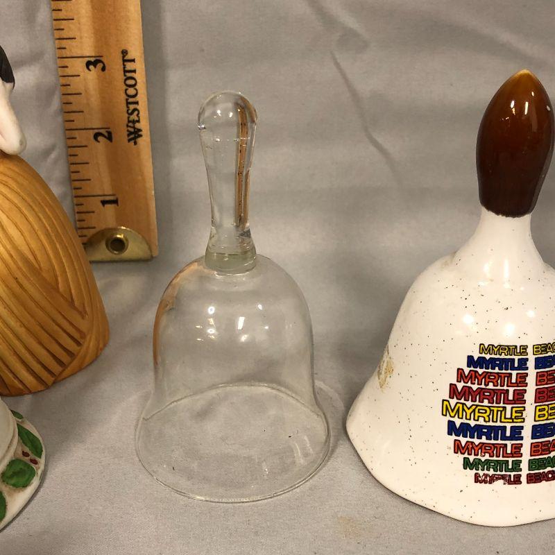 There is a cute girl bell, a Santa bell, one from Deutshland, one from Myrtle Beach, a metal bell, and yellow rose bell, and a clear glass bell with no clanger.
