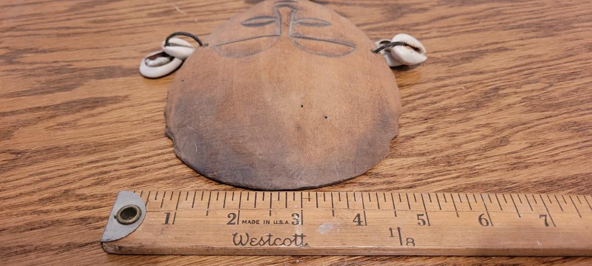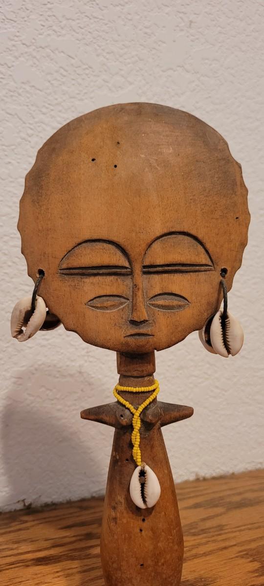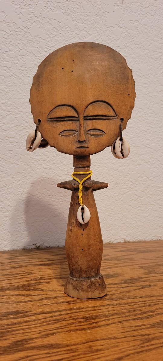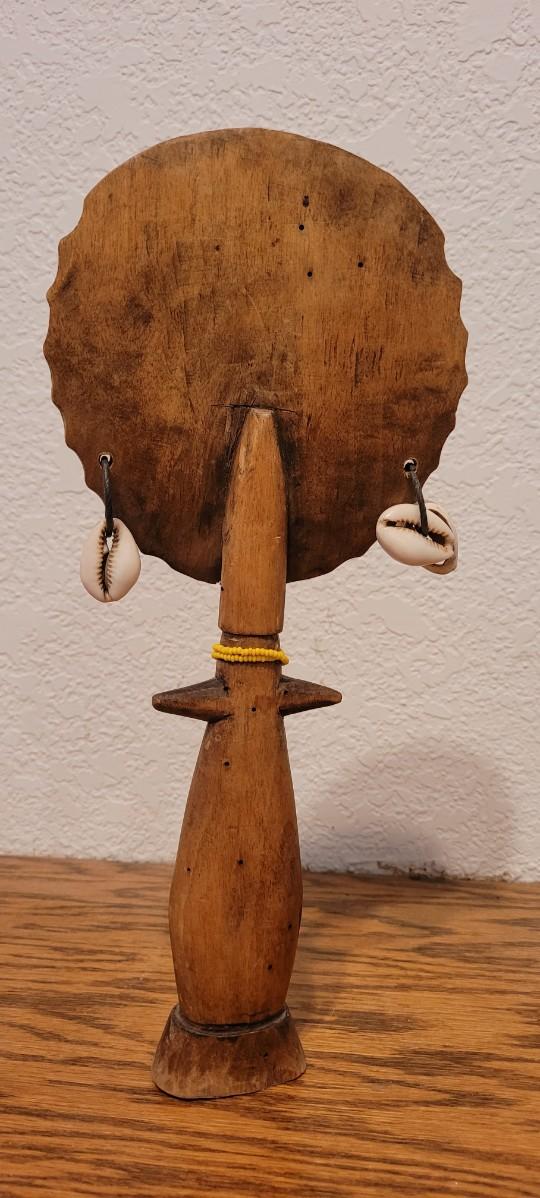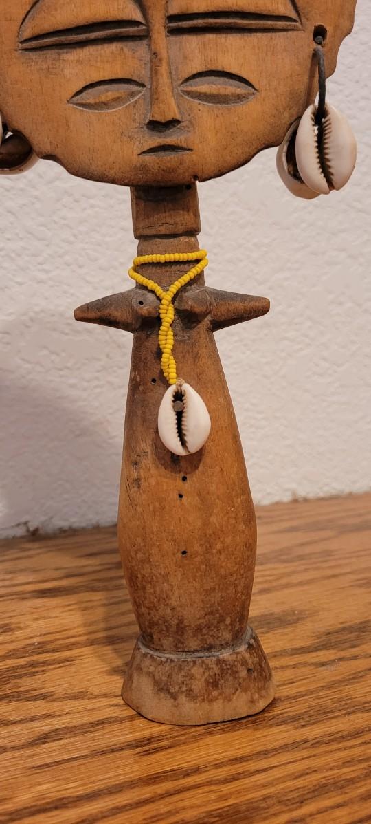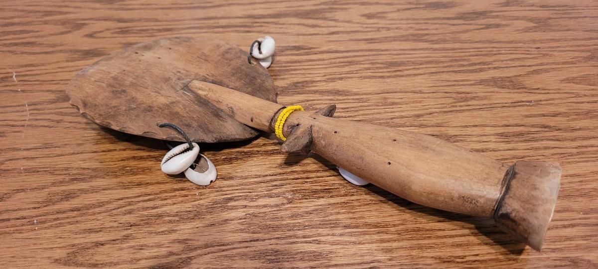 Nice looking hand carved Wood rattle with shell Accents to create a serene rattling sound when moved.