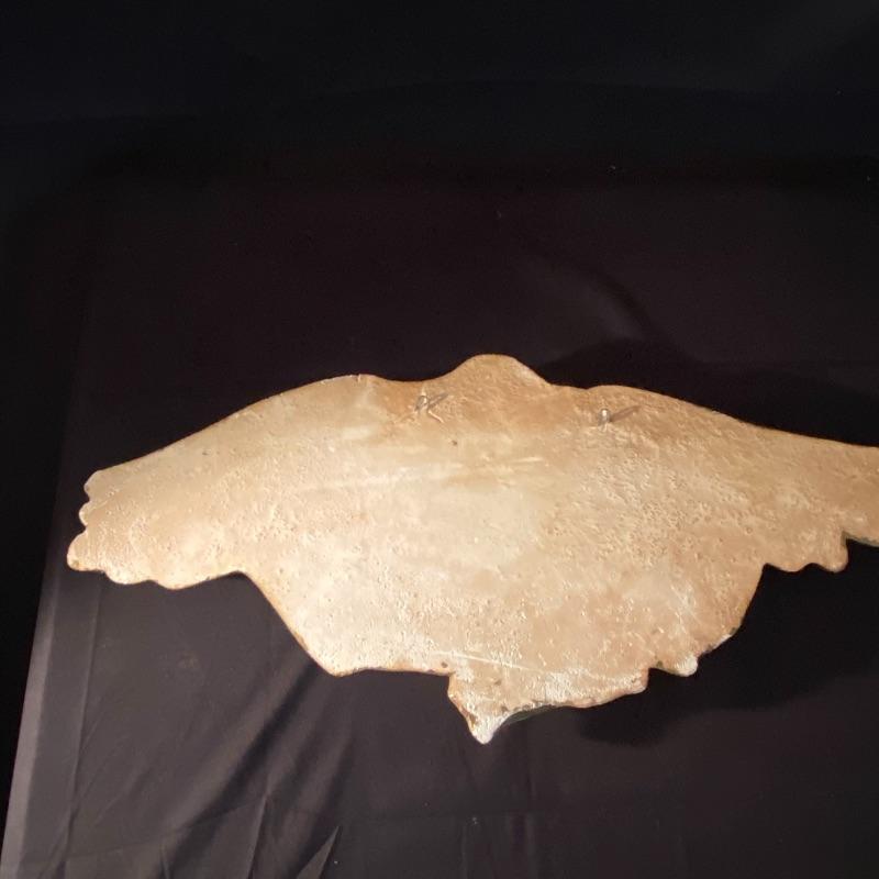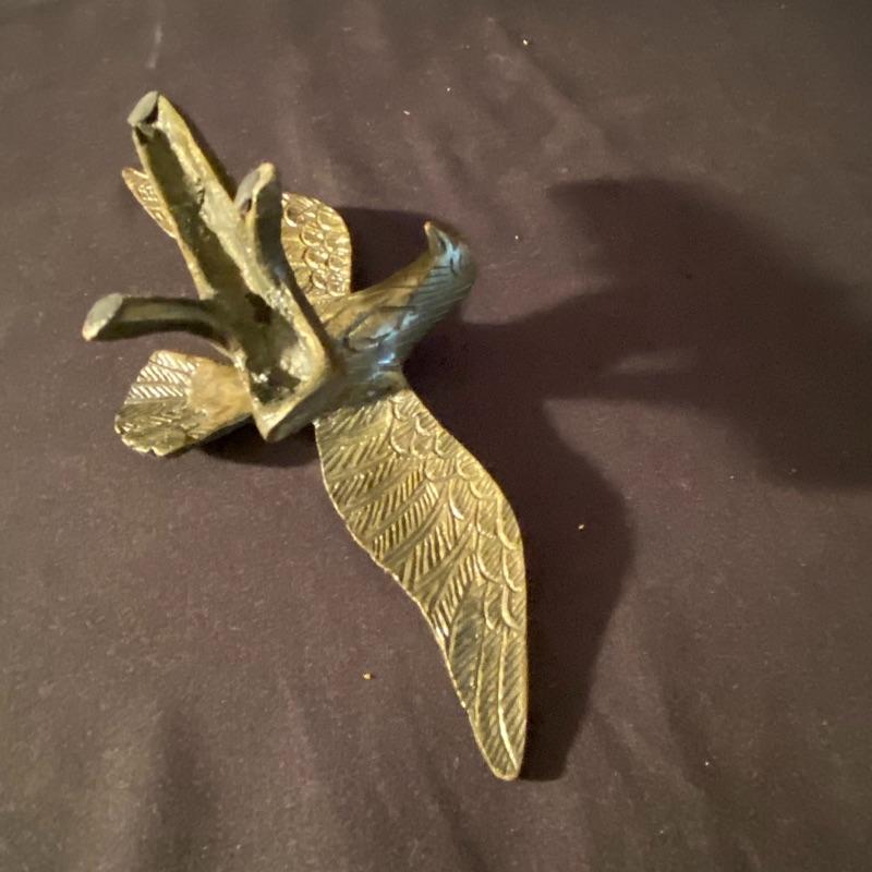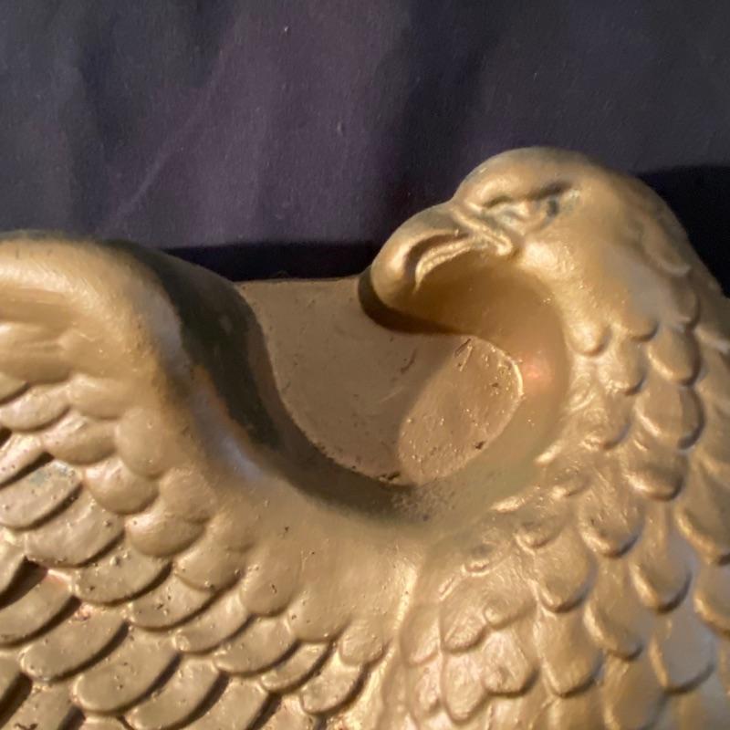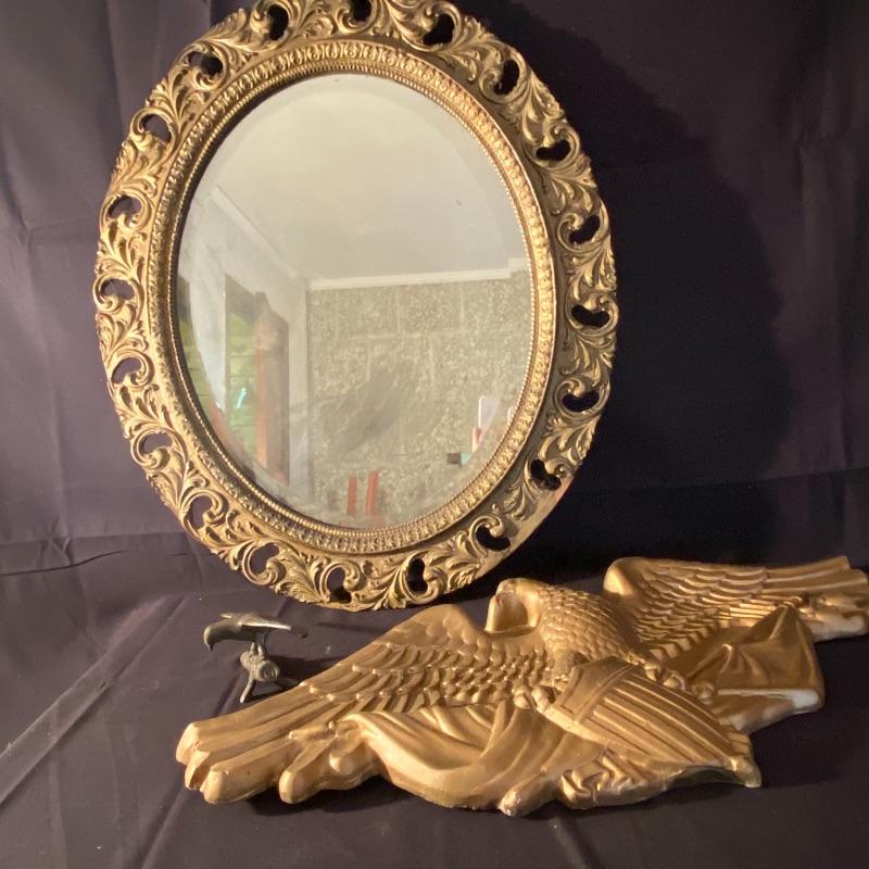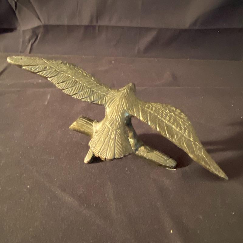 This lot includes vintage relics such as a bold brass-like majestic eagle to mount on your wall. This large eagle has a “˜wingspan’ of 25”. A smaller, dense iron-like eagle has a “˜wingspan’ of 8”.