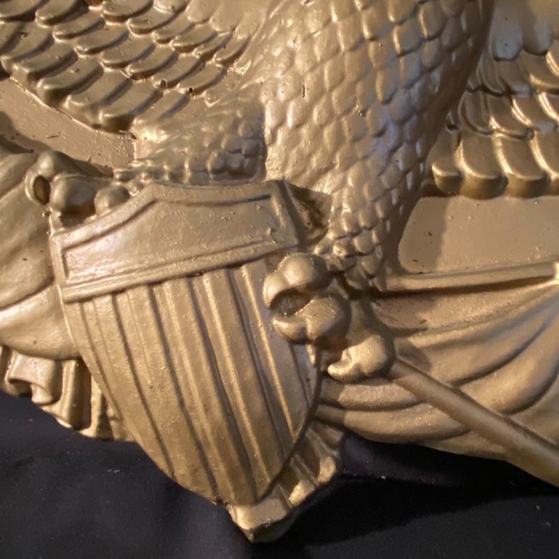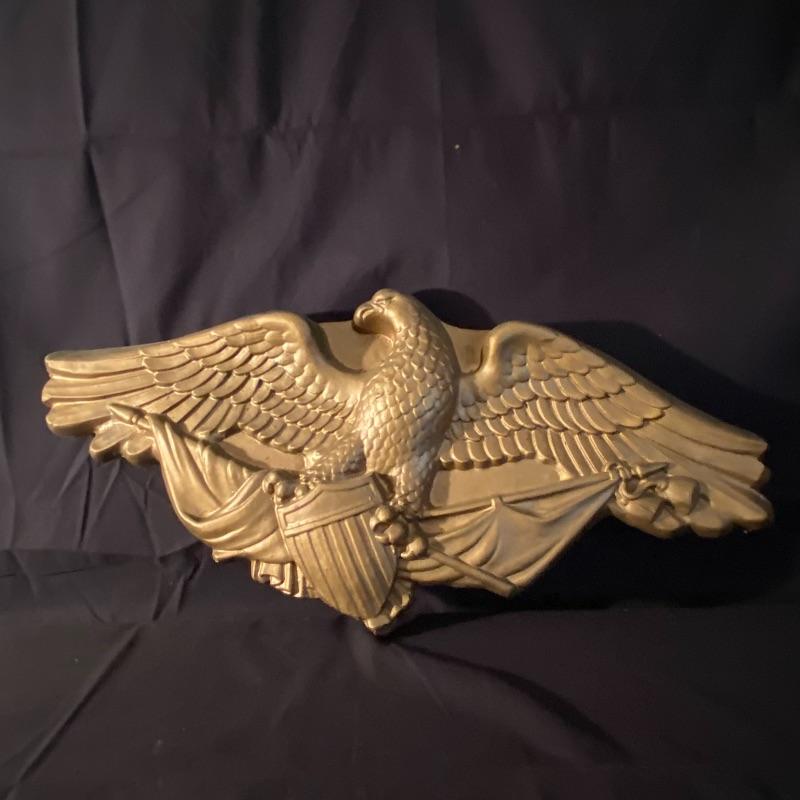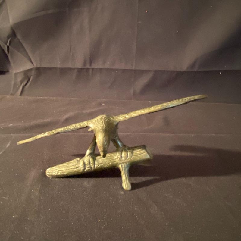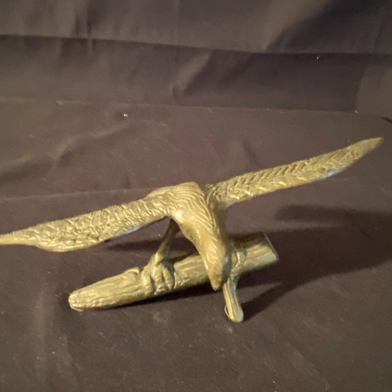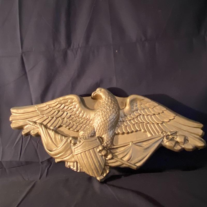 This lot includes vintage relics such as a bold brass-like majestic eagle to mount on your wall. This large eagle has a “˜wingspan’ of 25”. A smaller, dense iron-like eagle has a “˜wingspan’ of 8”.