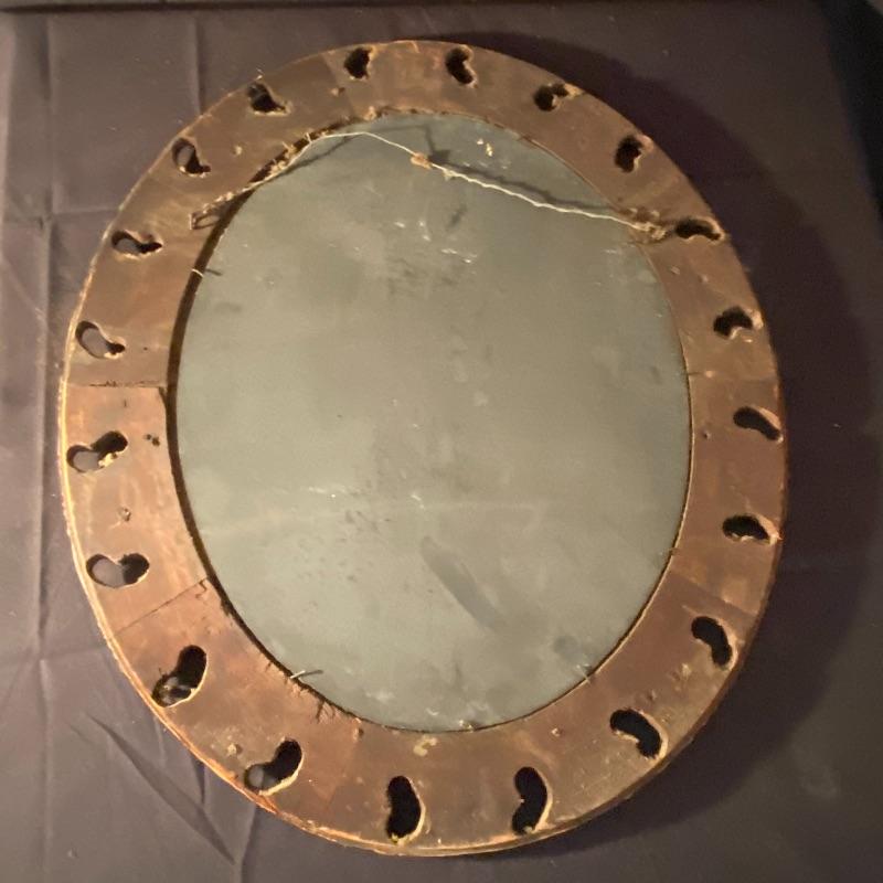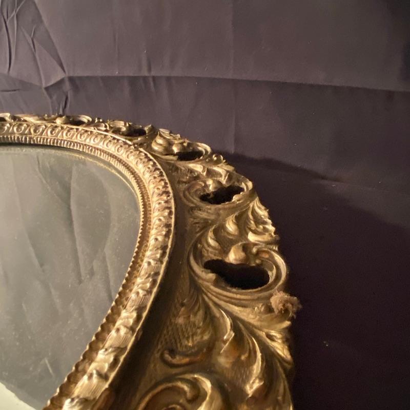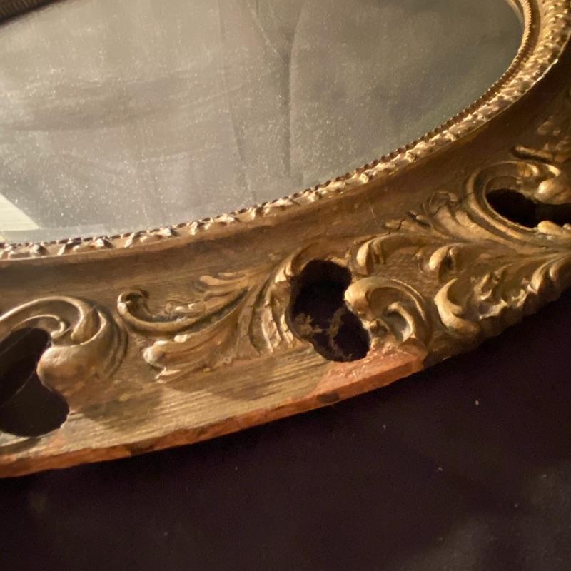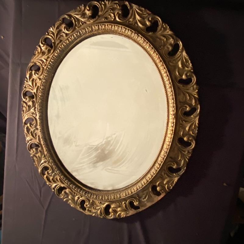 Mirror measurements are 26” x 22”. Fairly light due to the detailed wood framing, this piece makes a lovely statement! Local pickup only.