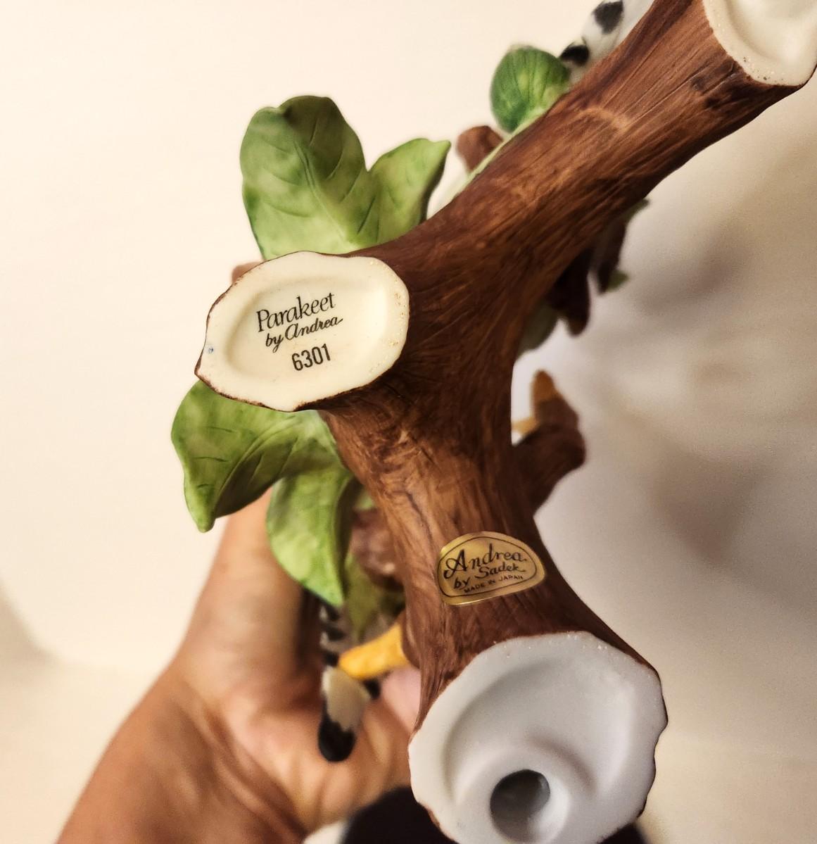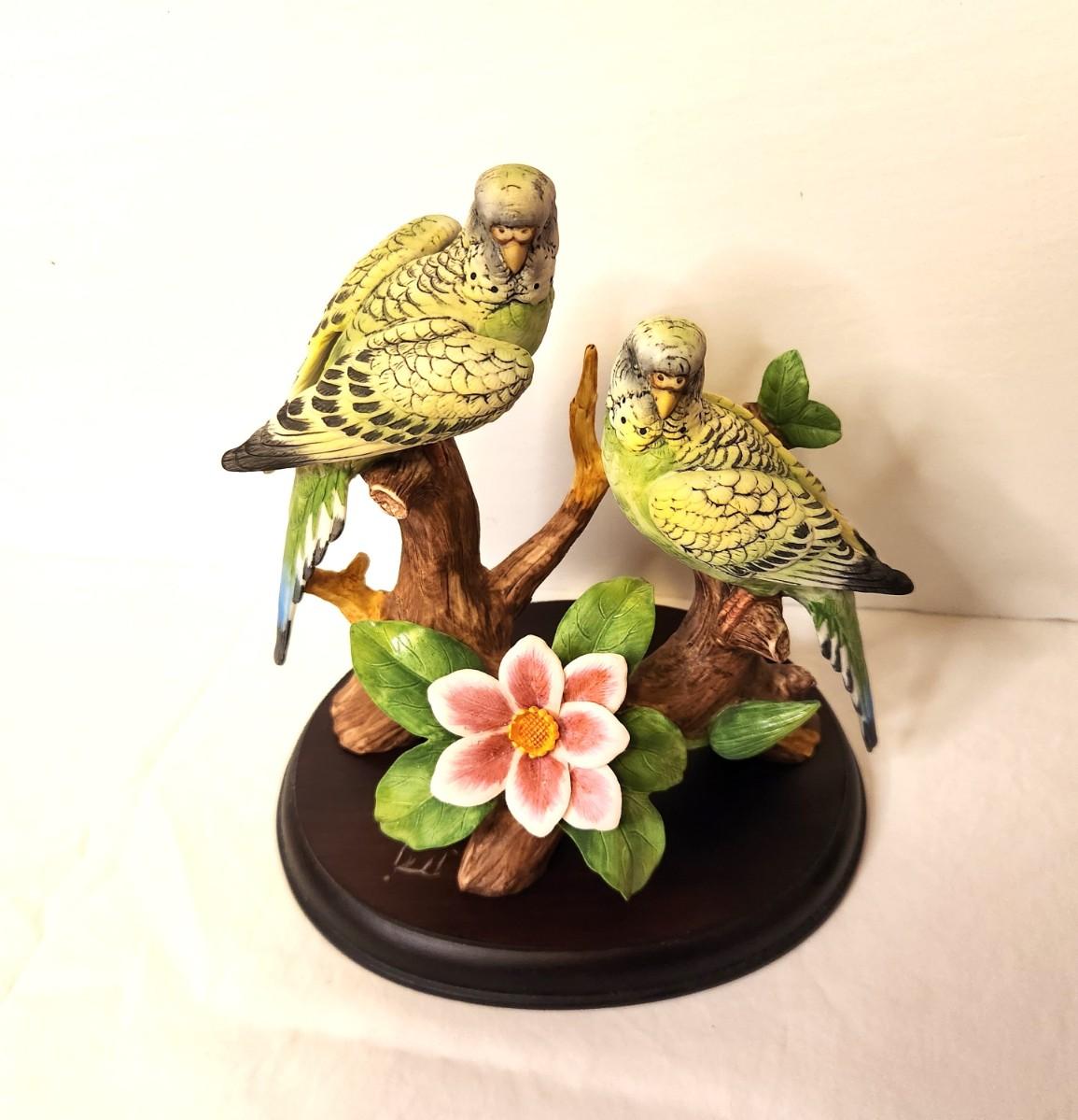 1980s Andrea porcelain Double Parakeet figure on wooden base. Good condition, no box.