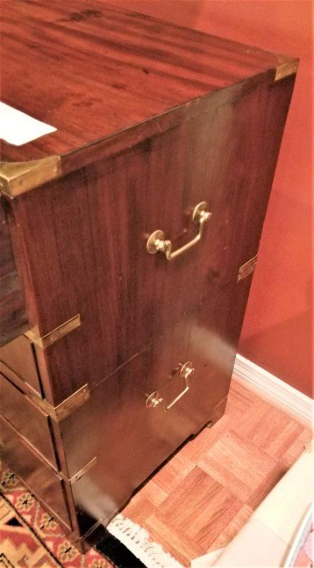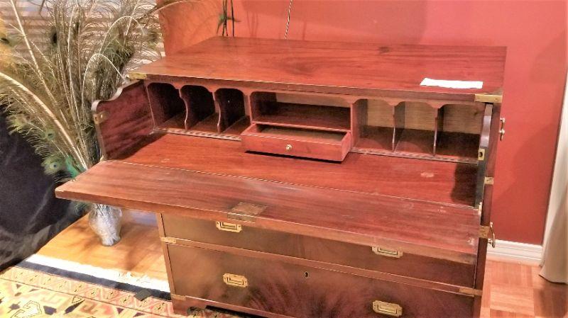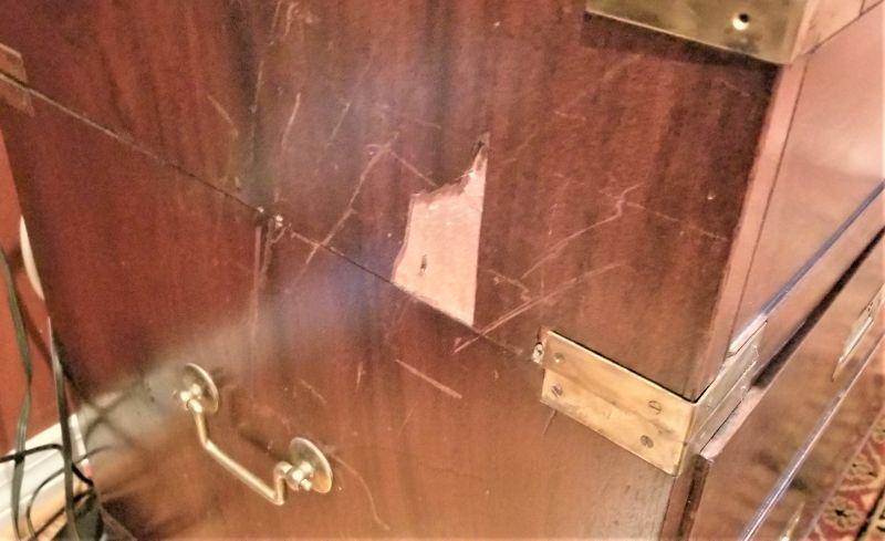 Handsome antique Campaign-style desk. Panel drops down to reveal a desk - also has four drawers for storage (top two divided). Handles on sides. Note one side has some damage. Measures 42" wide x 20 3/4 deep x 36 1/2" tall. English - 1820-1825. Appraised at over $2000.00.