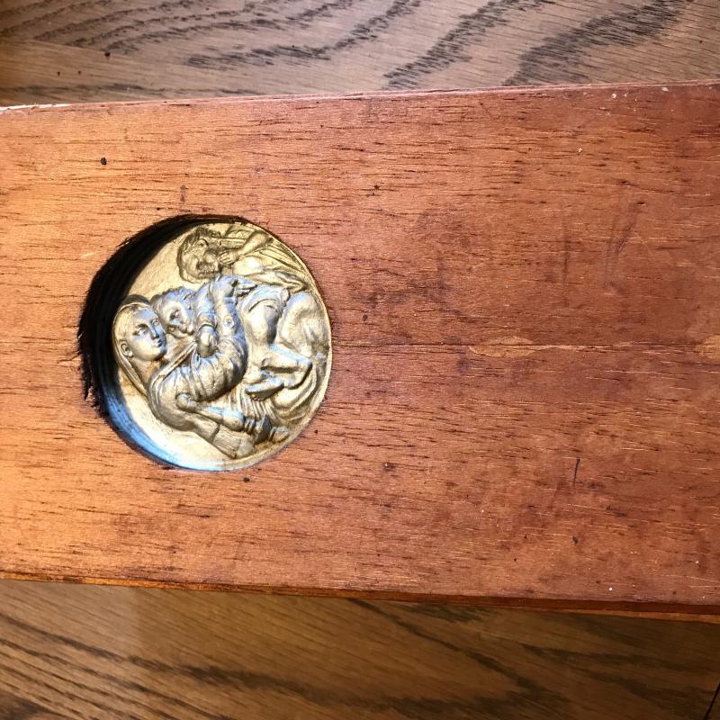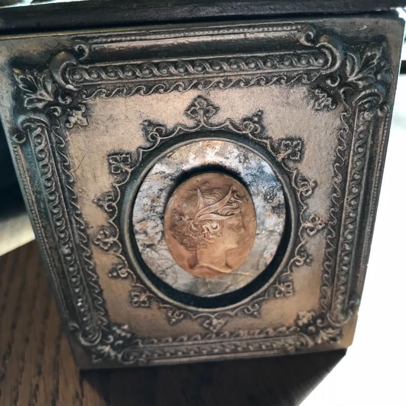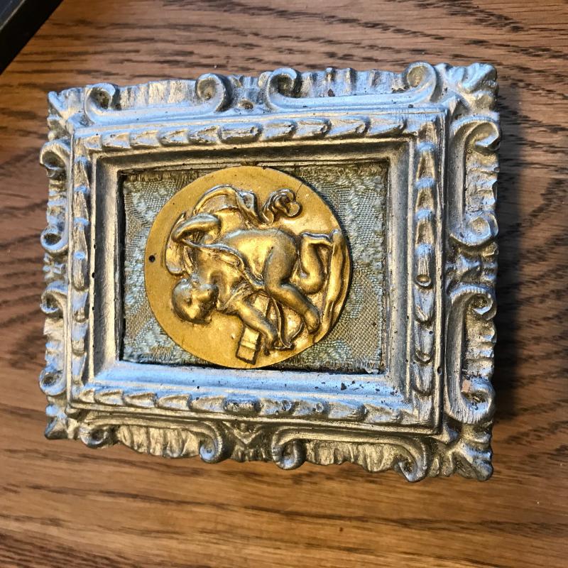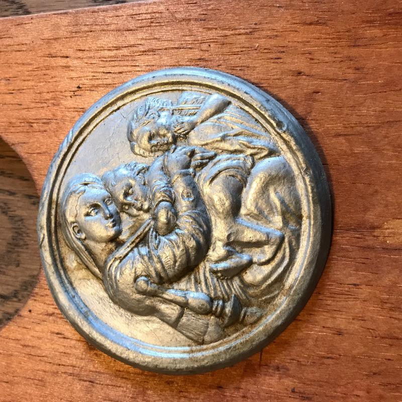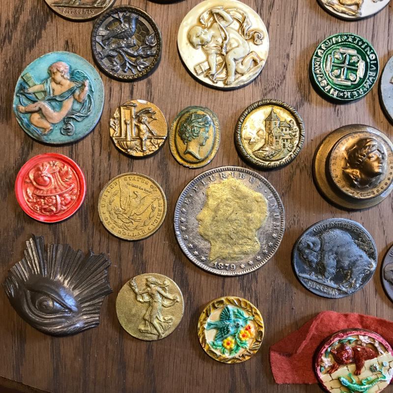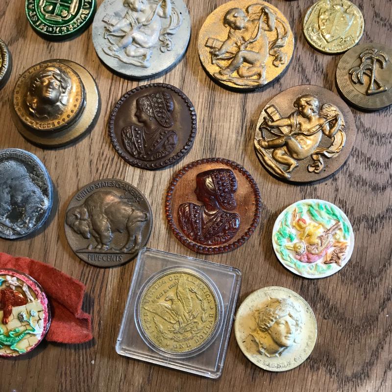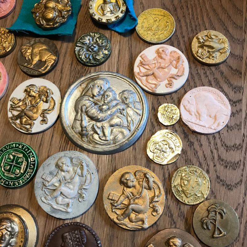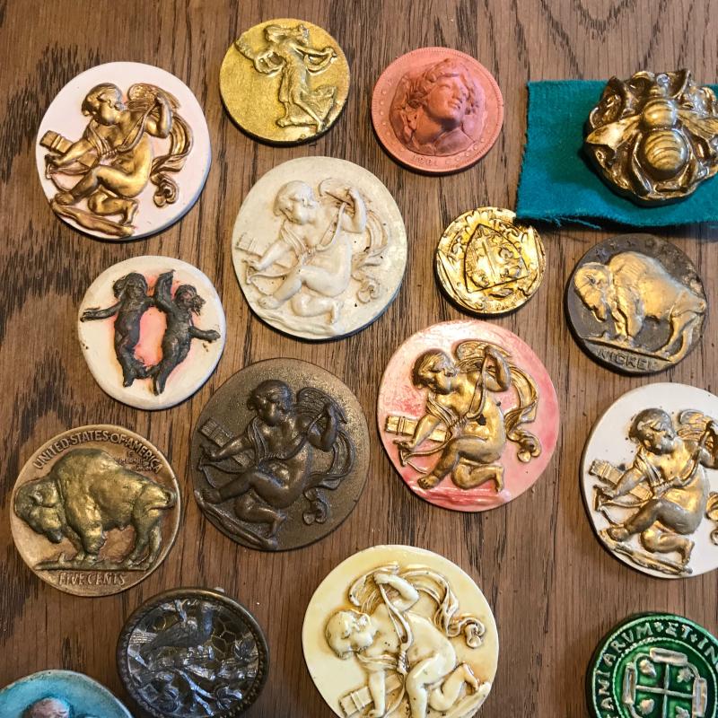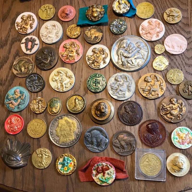 Antique art and coin replicas made by artists Fred Reehl. Dozens in collection. Also a lidded box and clock. See photos for details. Lot available for shipping or local pick up in Flat Rock, NC.